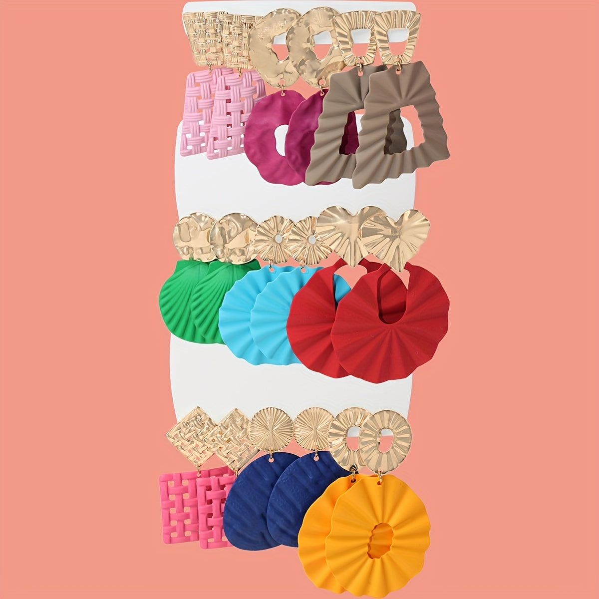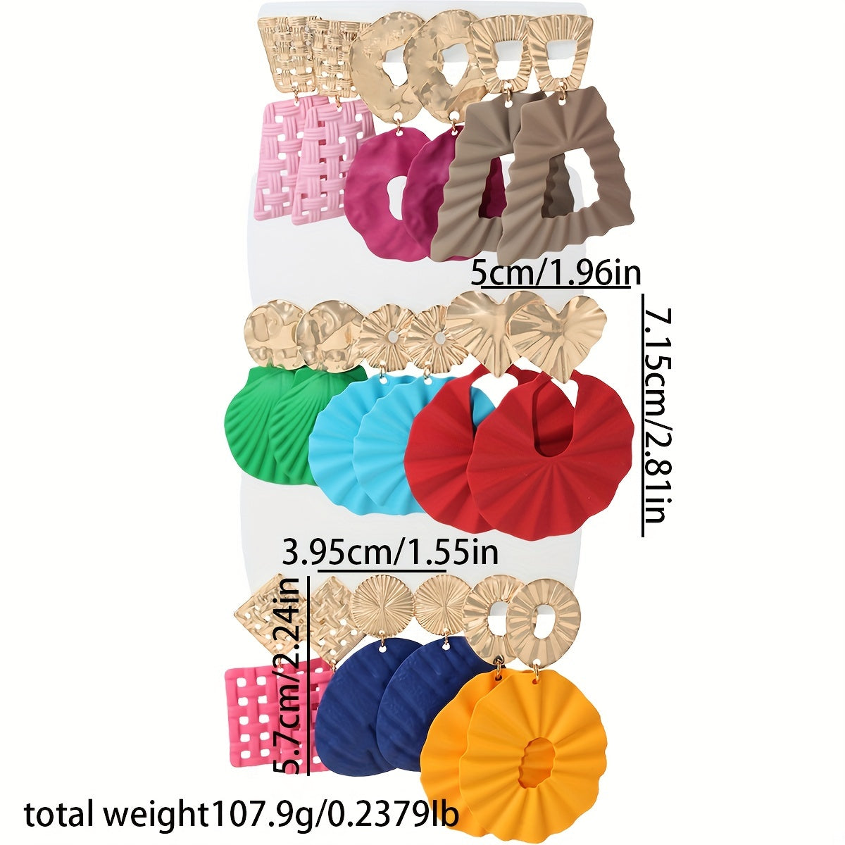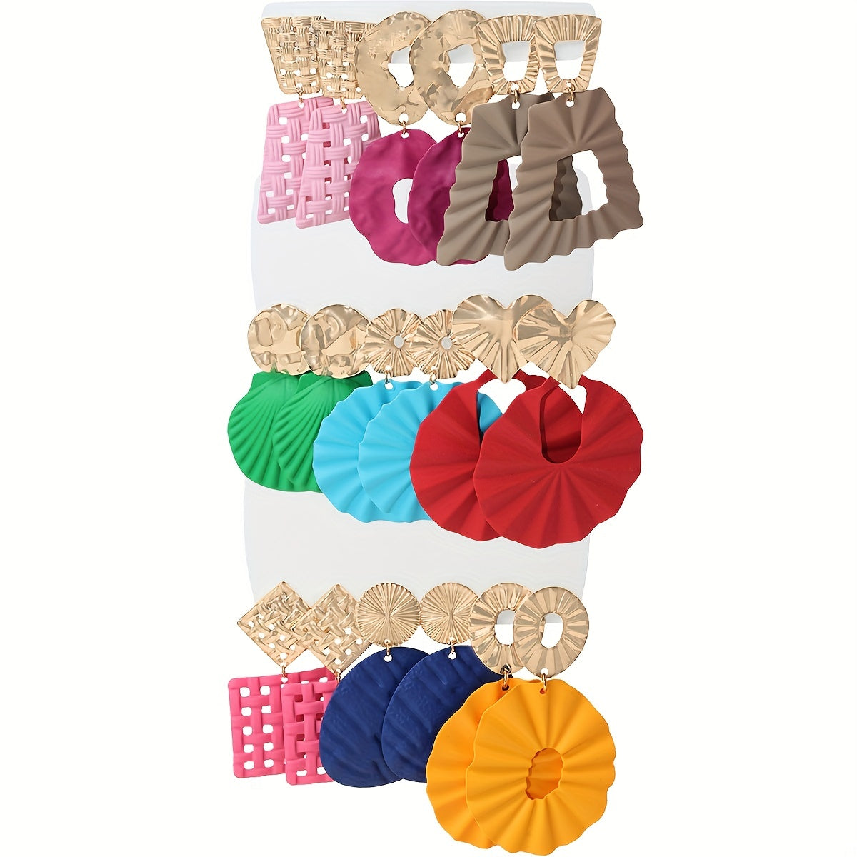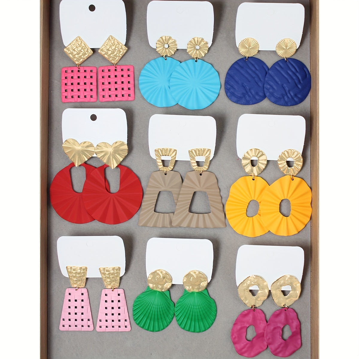 Add a pop of color with this set of 9 pairs of metal geometric pendant earrings. Perfect for a vacation style look, these earrings are made of iron with 18K plated finish. Stand out with these holiday accessories!