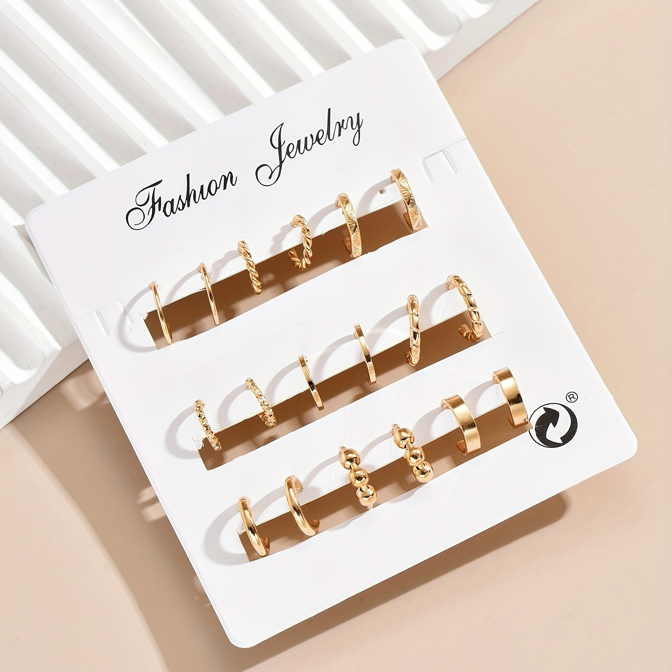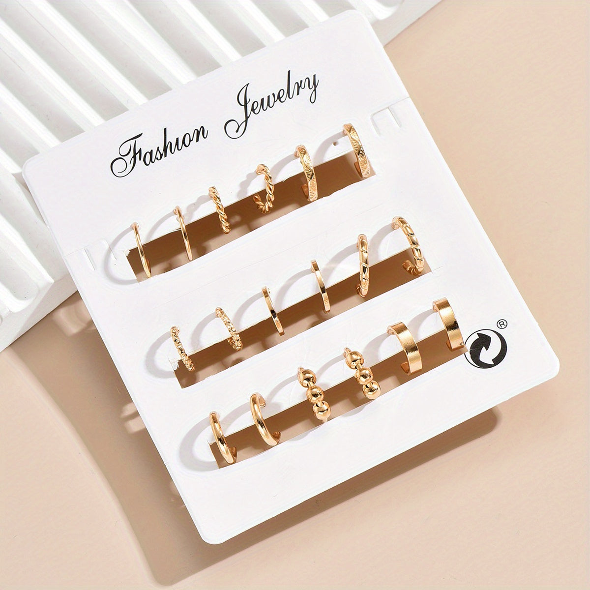 Enhance your daily wear with this set of 9 pairs of golden hoop earrings. Made from high-quality alloy, these earrings are perfect for adding a touch of elegance to any outfit.
