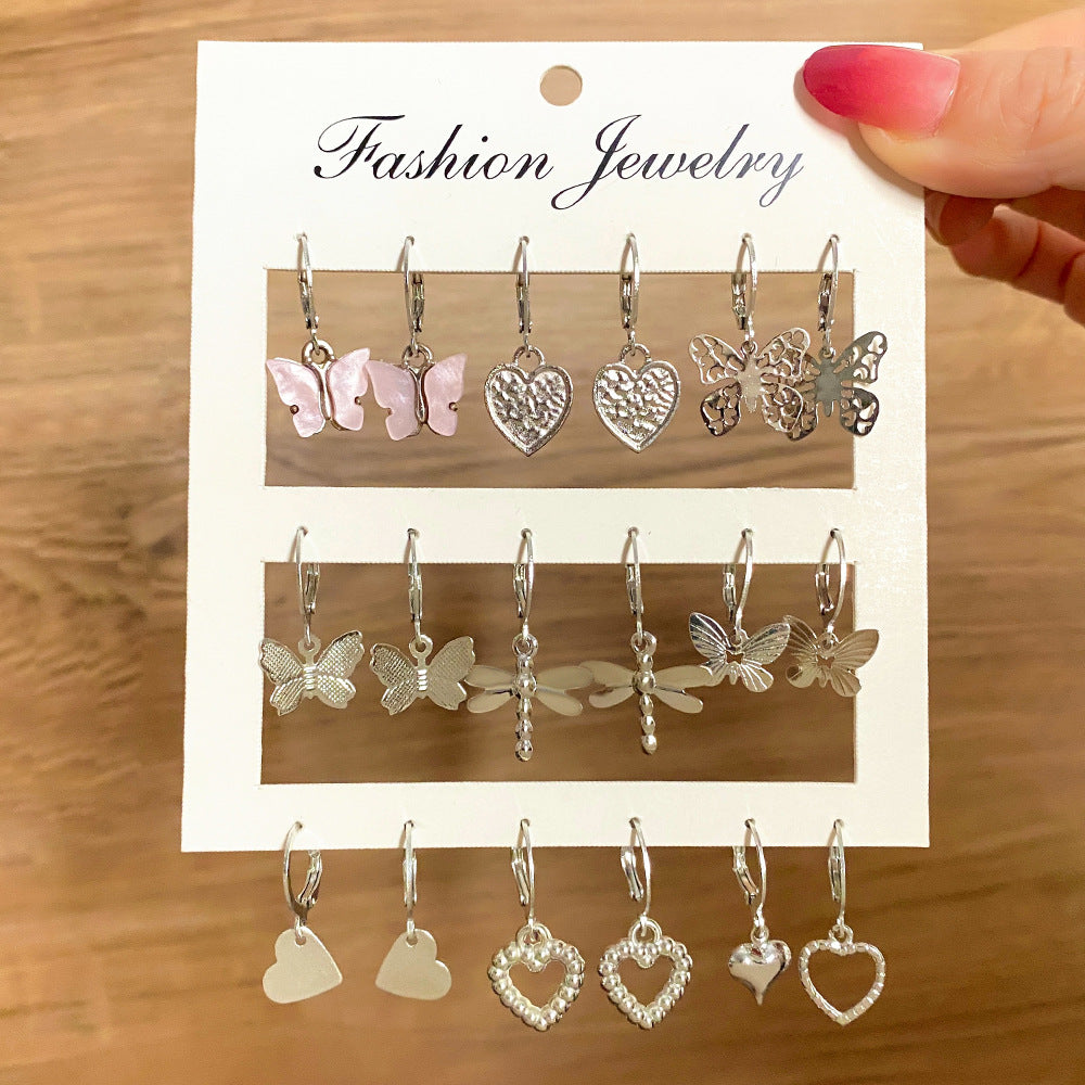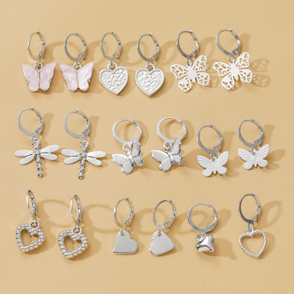 This set includes 9 pairs of heart and butterfly-shaped earrings, perfect for daily wear or special occasions. The earrings are made of high-quality materials and come in a variety of colors.