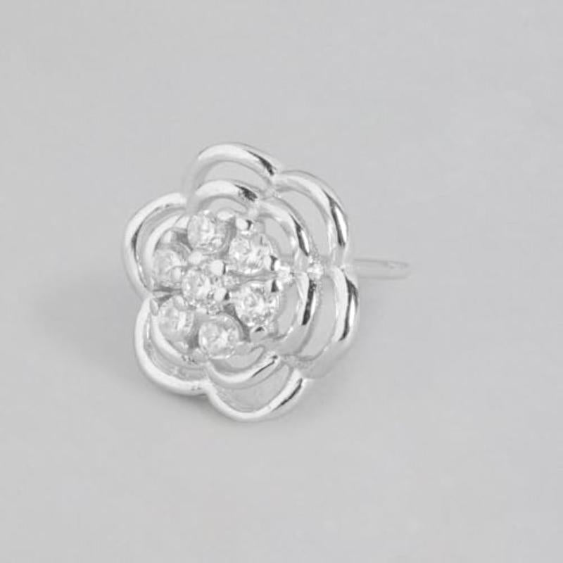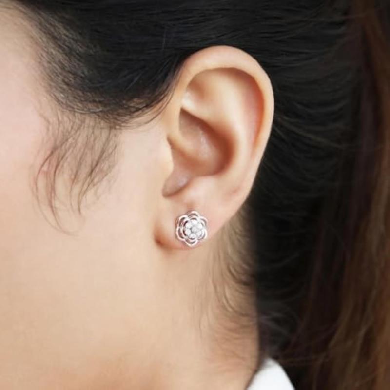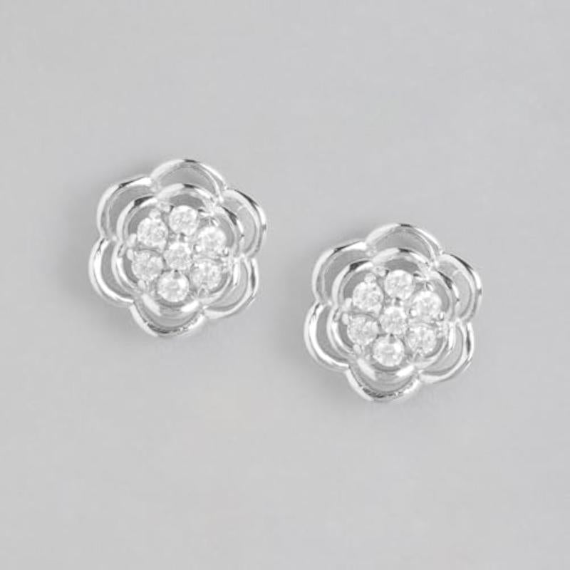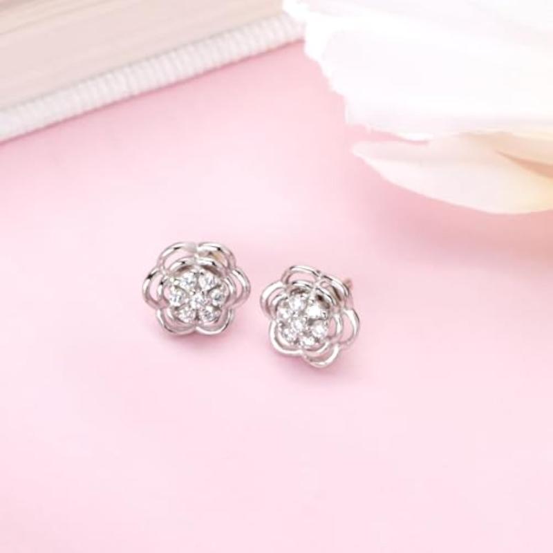 These exquisite stud earrings feature blooming floral design with sparkling CZ stones. Made of 925 sterling silver with rhodium plating and hallmarked for authenticity.