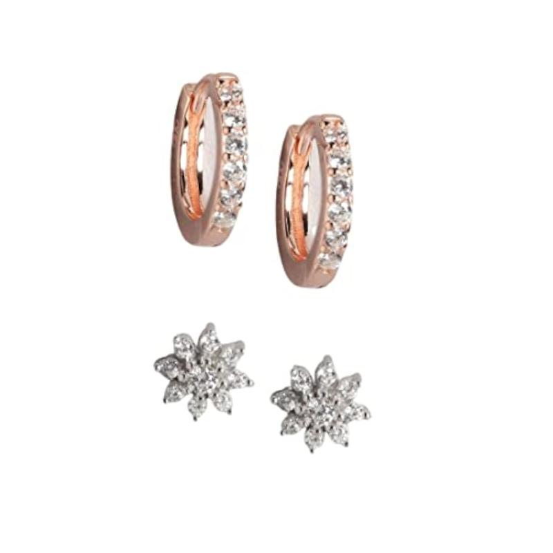 Enhance your look with this stunning combo of rhodium-plated stud earrings and Bali hoop earrings embellished with sparkling cubic zirconia.
