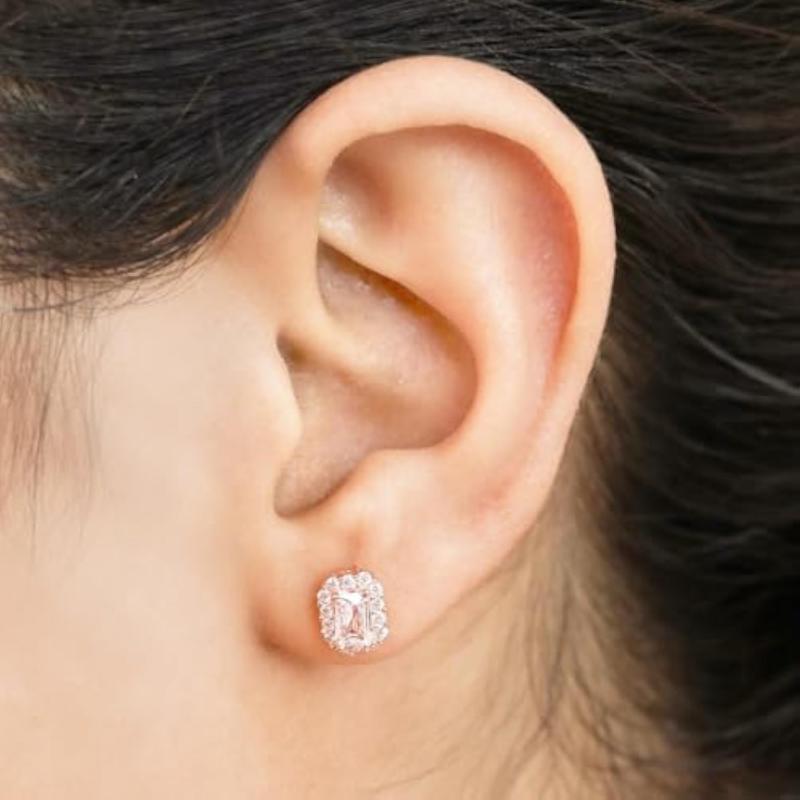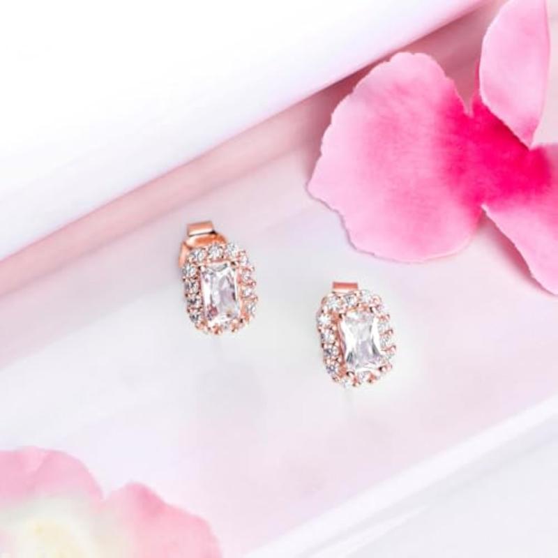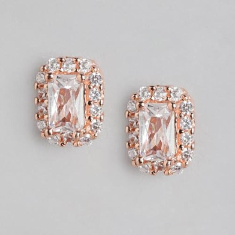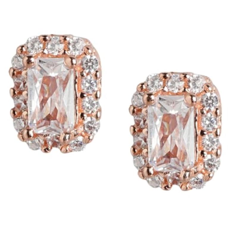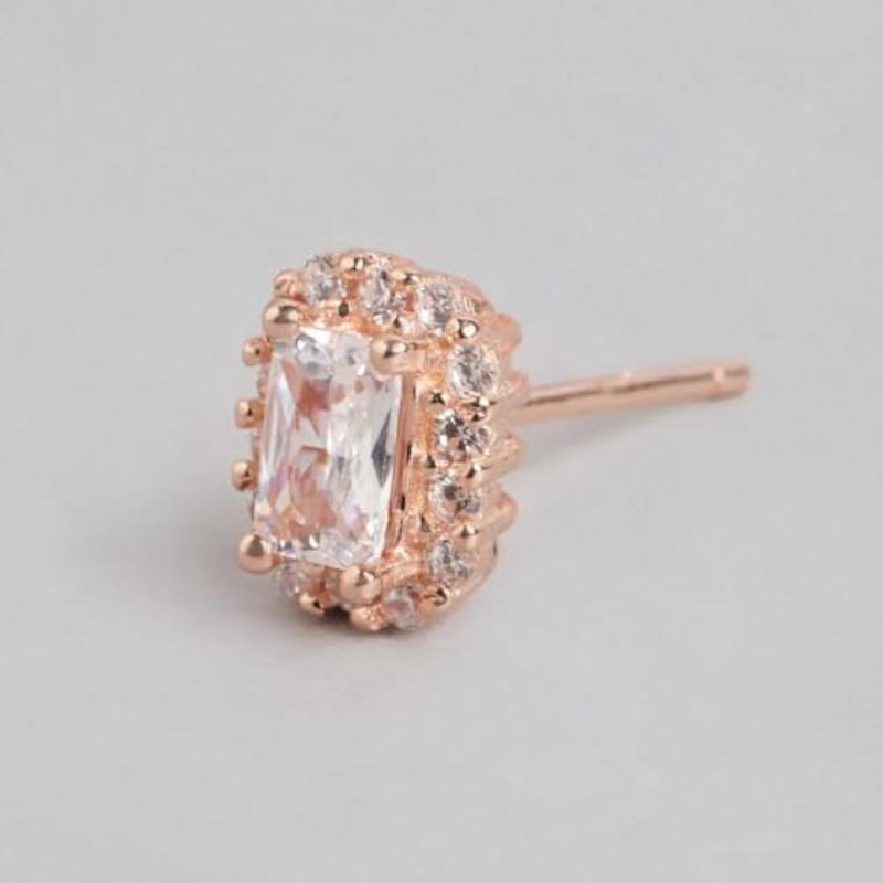 Elegant rectangular solitaire halo stud earrings crafted from 925 sterling silver with a rose gold plating.