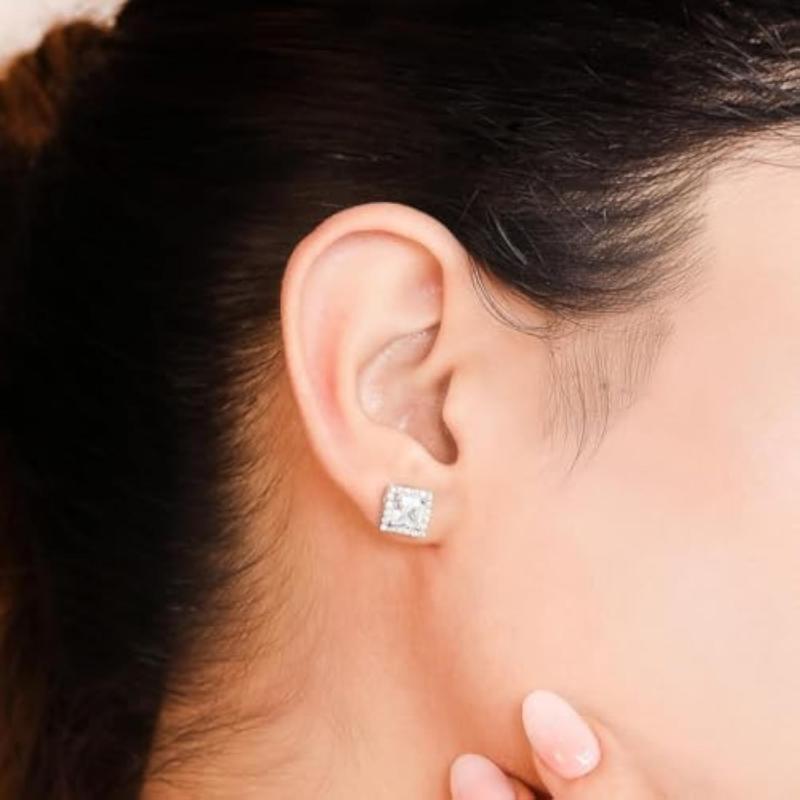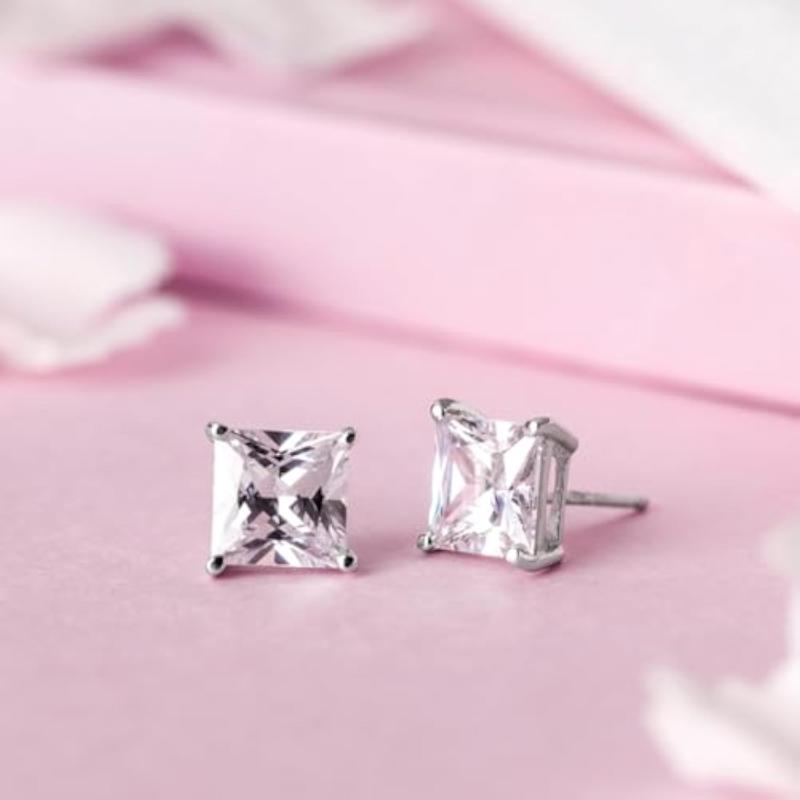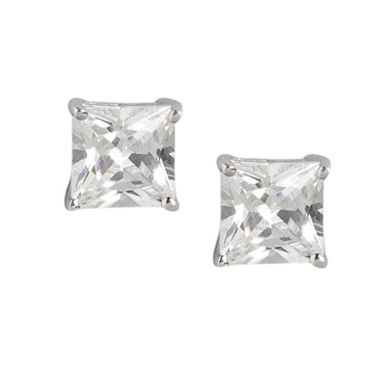 Elegant square cubic zirconia stud earrings made of 925 sterling silver with rhodium plating. Hallmark included for authenticity.