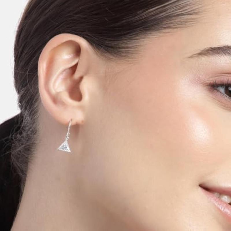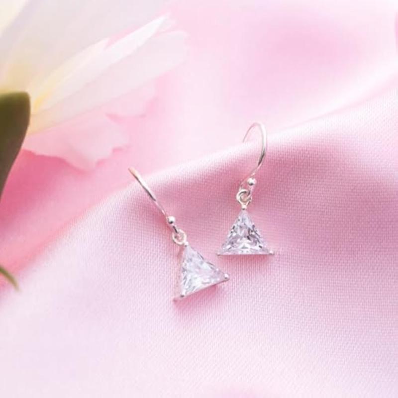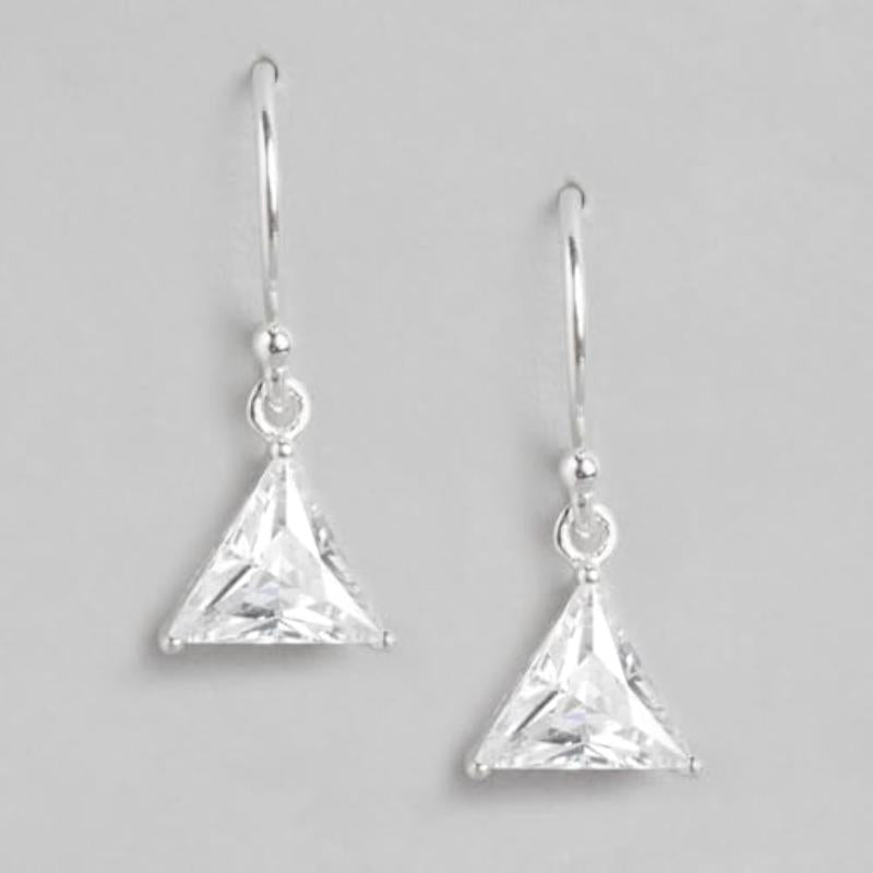 Elegant and stunning triangular solitaire CZ earrings crafted from 925 sterling silver with a rhodium plating. Features a secure back closure and a hallmark for authenticity.