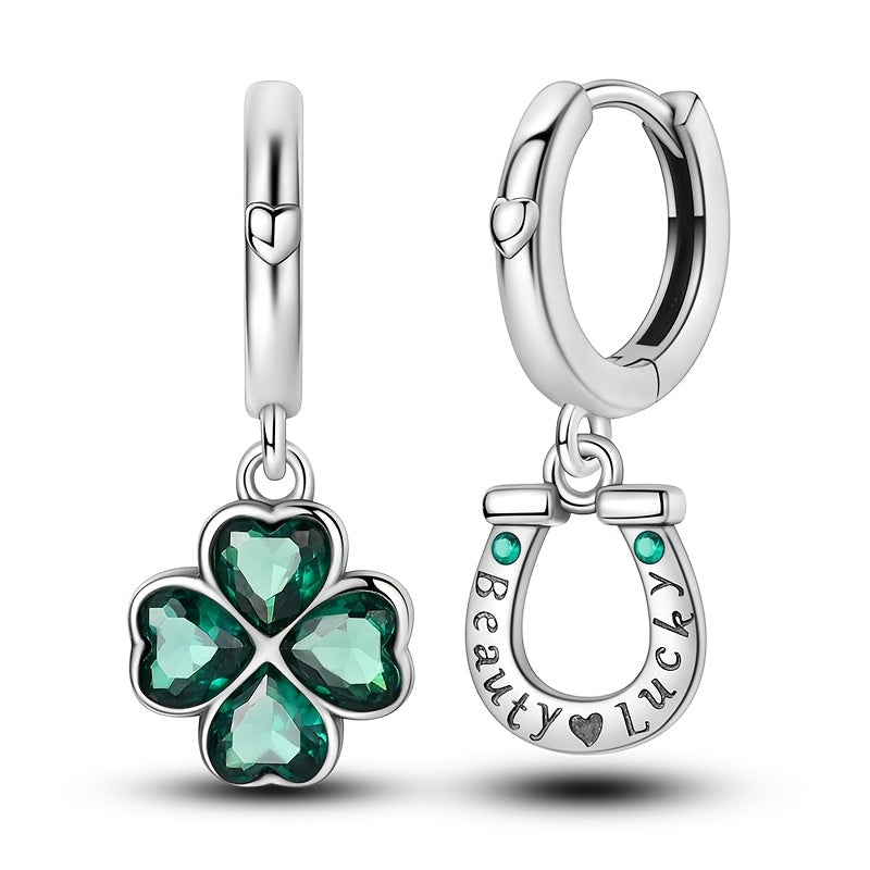 These asymmetrical ring-shaped earrings feature a horseshoe and four-leaf clover design. Perfect for parties, weddings, or engagements.