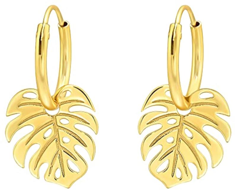 Elegant dangle hoop earrings featuring palm leaf design. Made of 925 sterling silver plating. Perfect for adding a touch of nature-inspired beauty to any outfit.