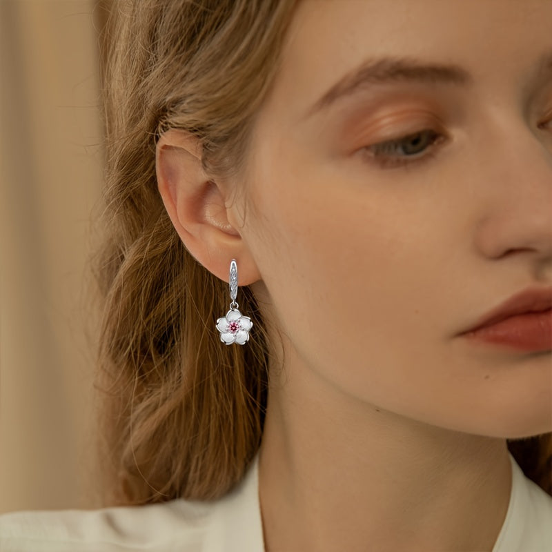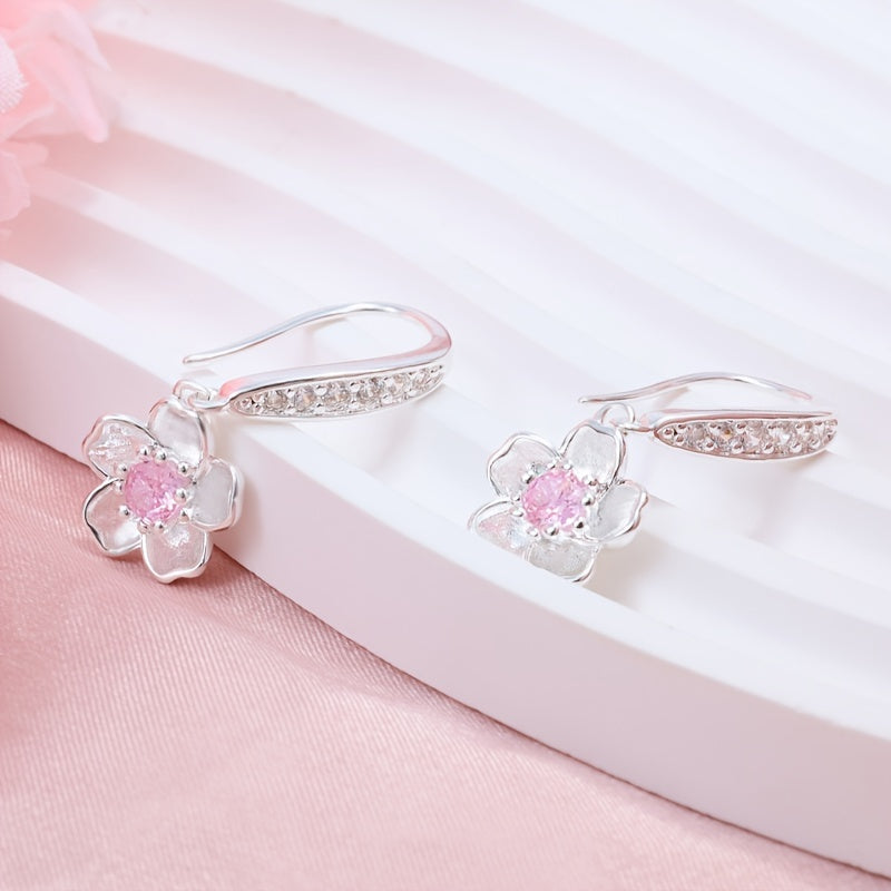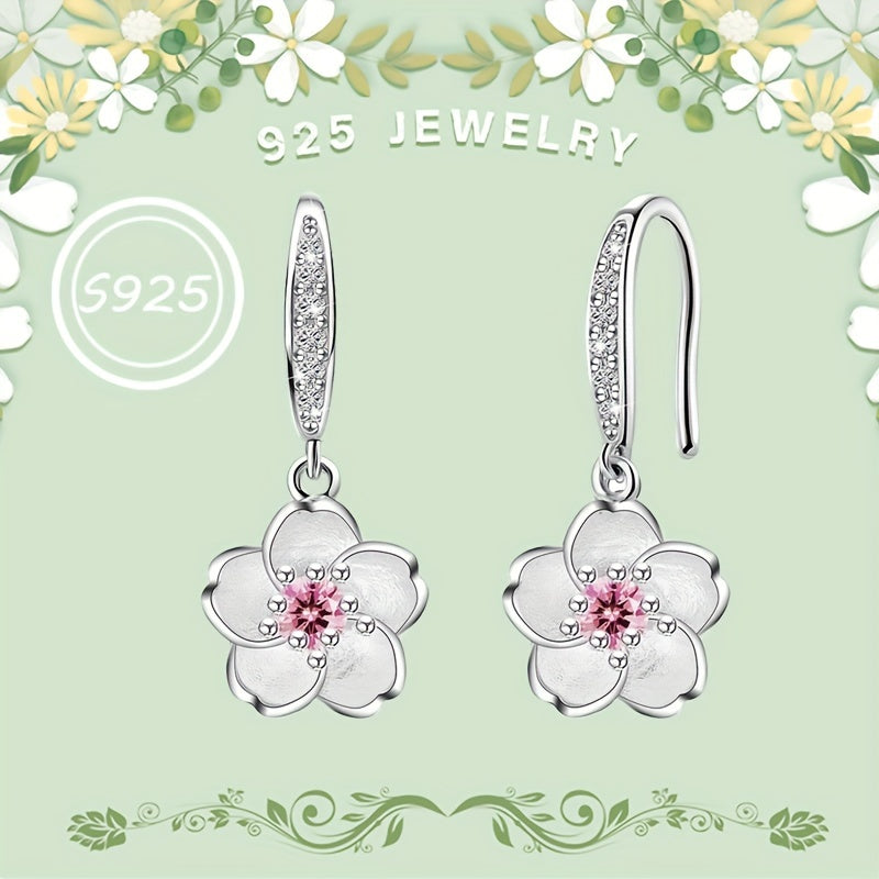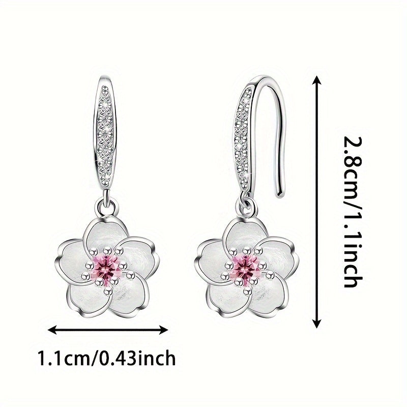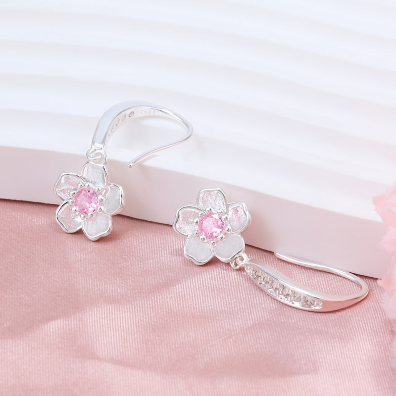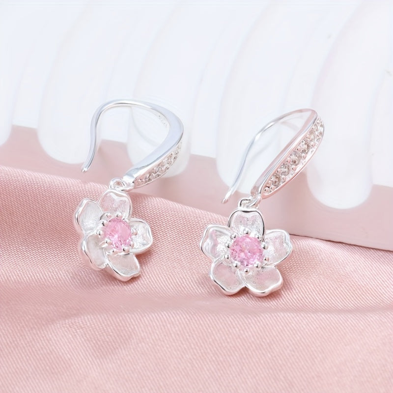 Elegant dangle earrings featuring peach blossom design with pink CZ cherry blossom drop. Crafted from high-quality 925 silver, these earrings are perfect for adding a touch of spring to your outfit.