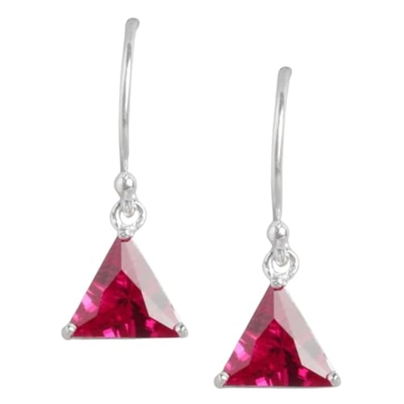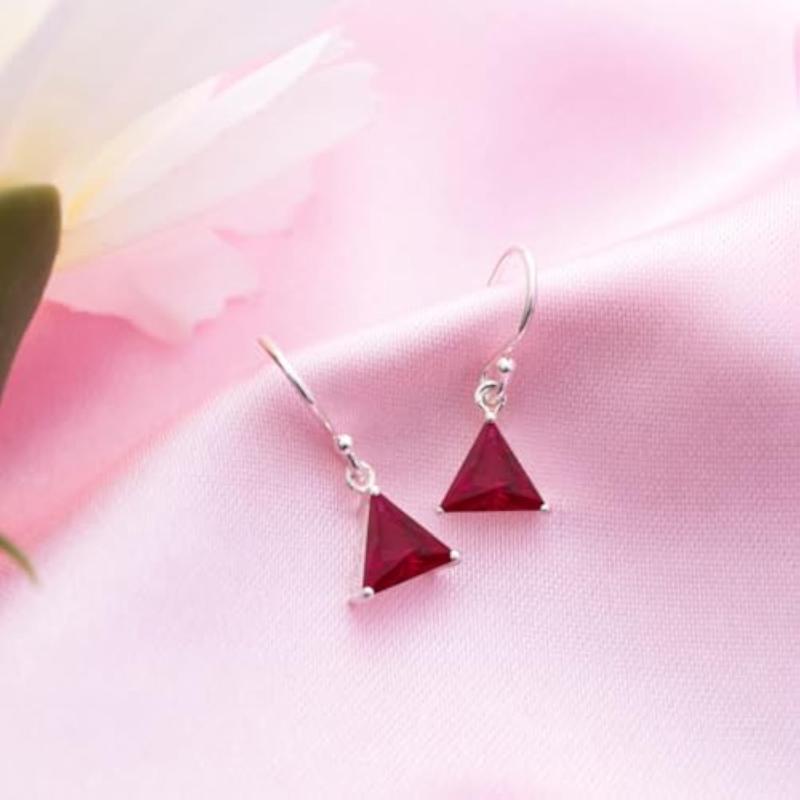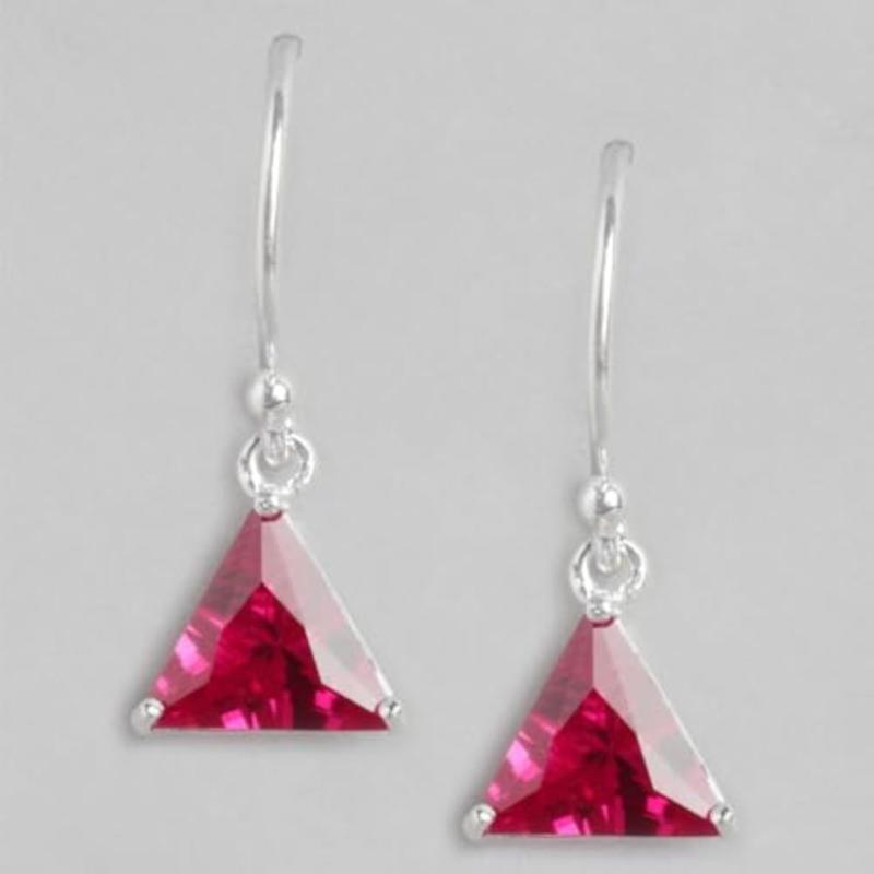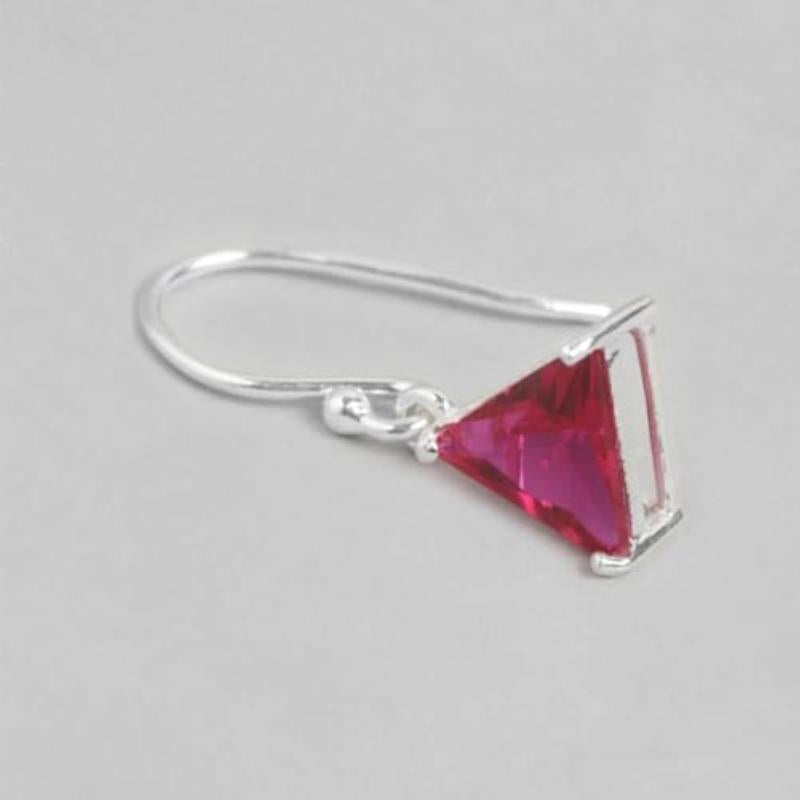 Elegant triangular red solitaire CZ earrings made of 925 sterling silver with rhodium plating.