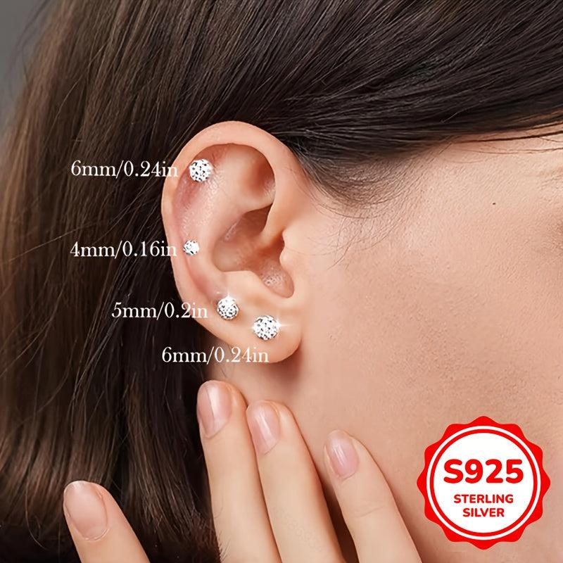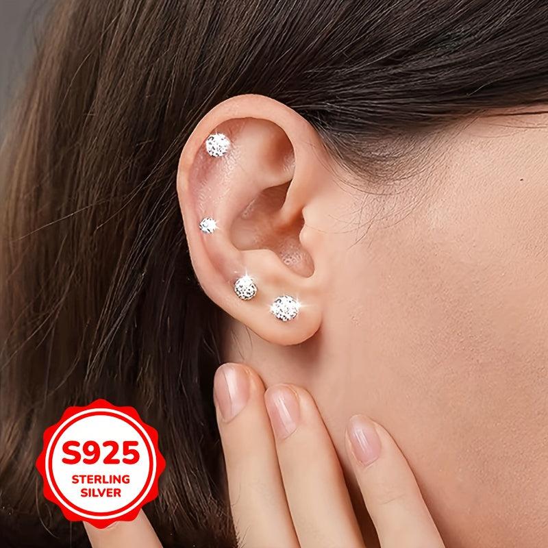 These sterling silver stud earrings feature synthetic zirconia, safe for sensitive ears. Ideal for daily wear, they're versatile and suitable for ear bone piercings. Great as a gift.