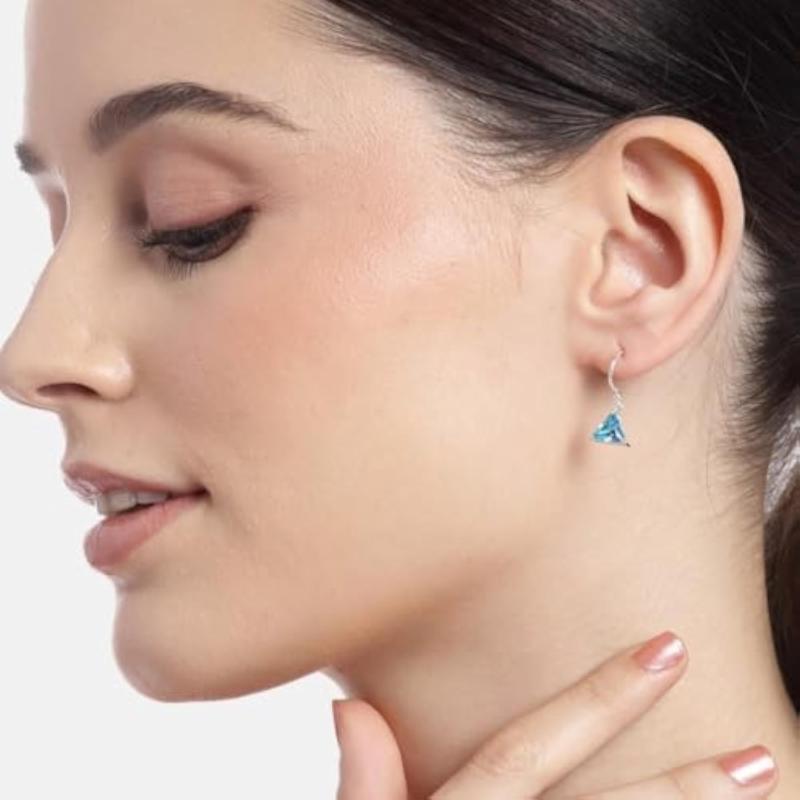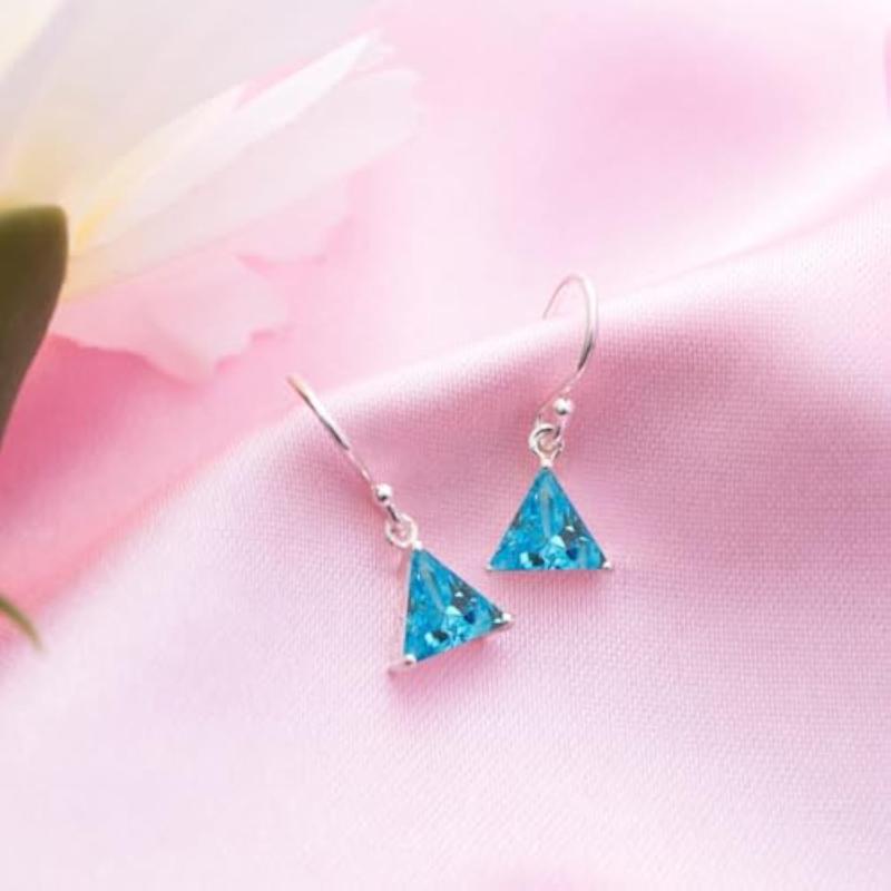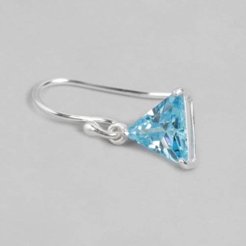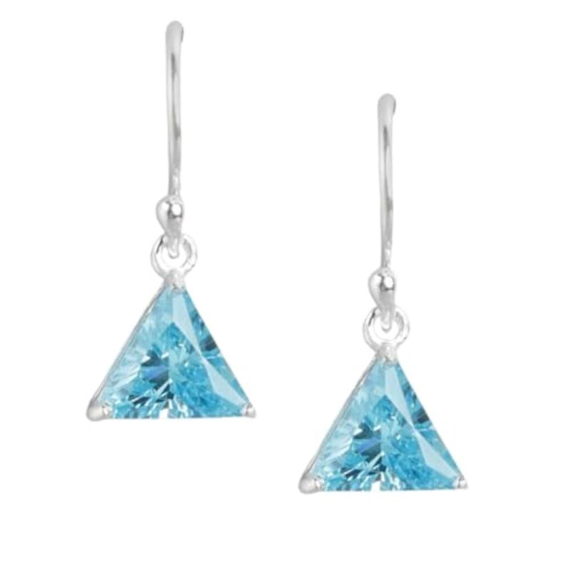 These elegant triangular earrings feature a stunning sea solitaire CZ stone. Rhodium plated for extra shine.