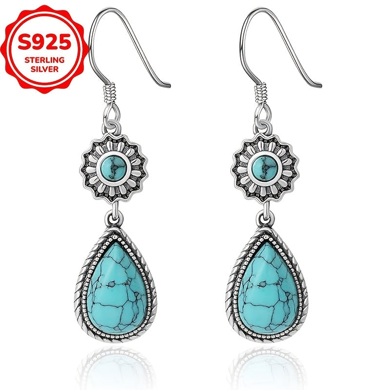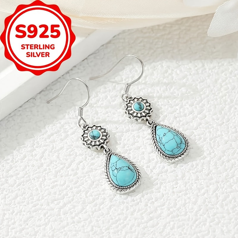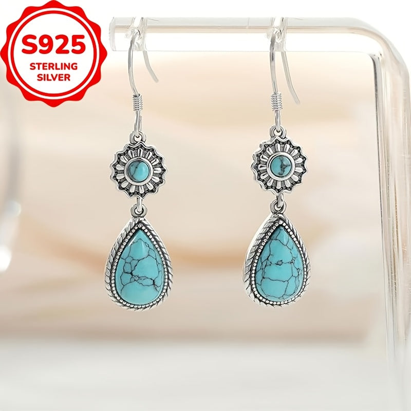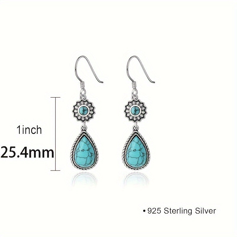 925 Silver Turquoise Teardrop Earrings Bohemian Style Hypoallergenic