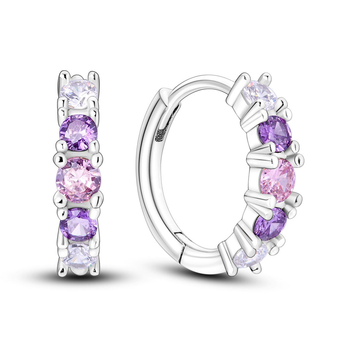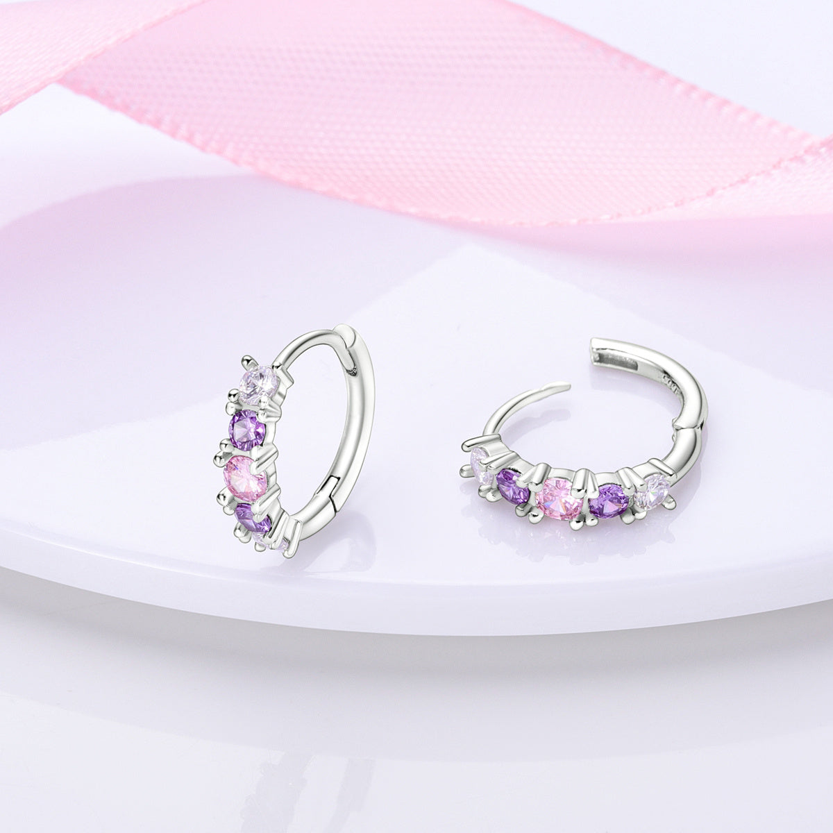 Chic and elegant earrings featuring a beautiful silvery powder purple gradient design with zirconia round pendant. Perfect for any occasion.