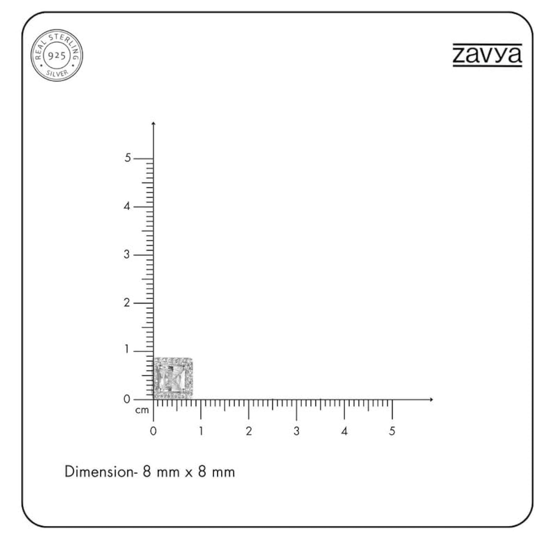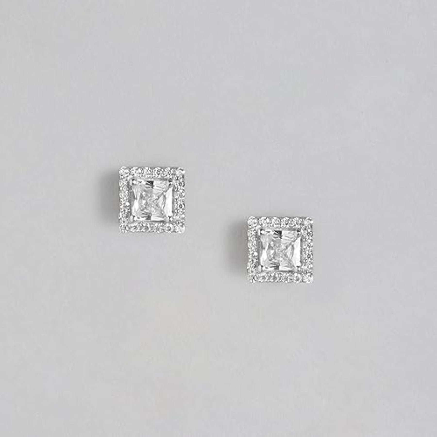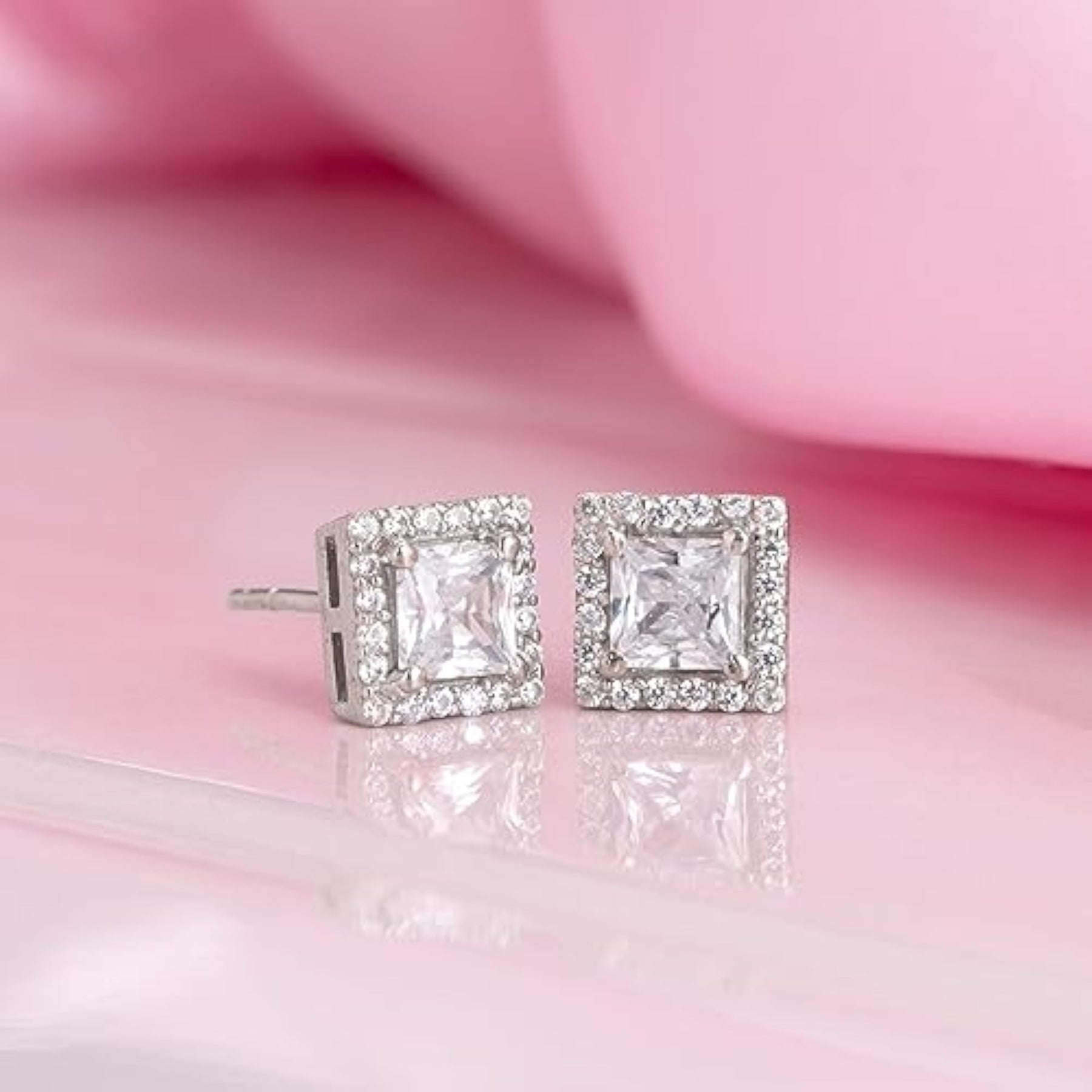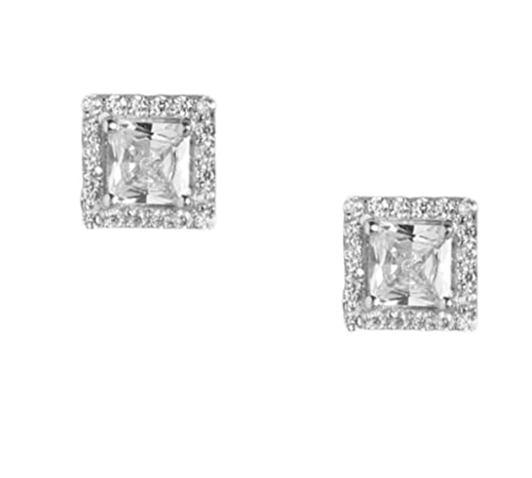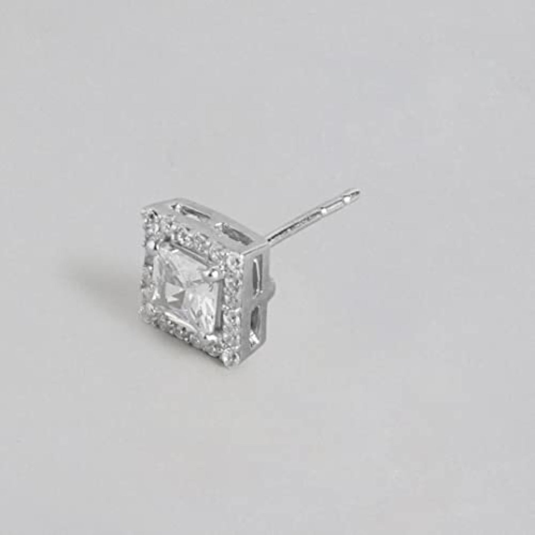 Elegant rhodium plated stud earrings with CZ square solitaire design and hallmark.