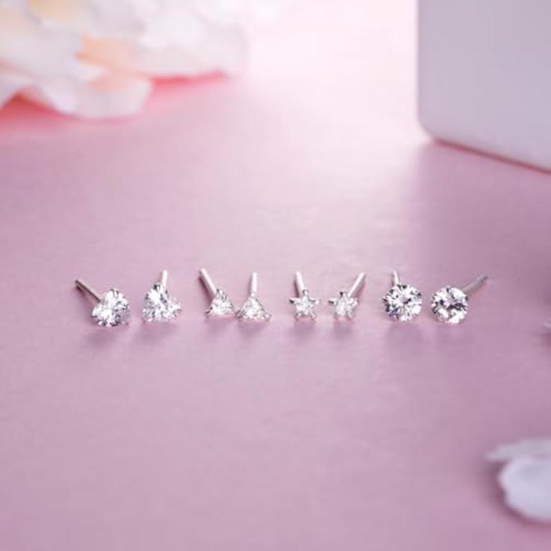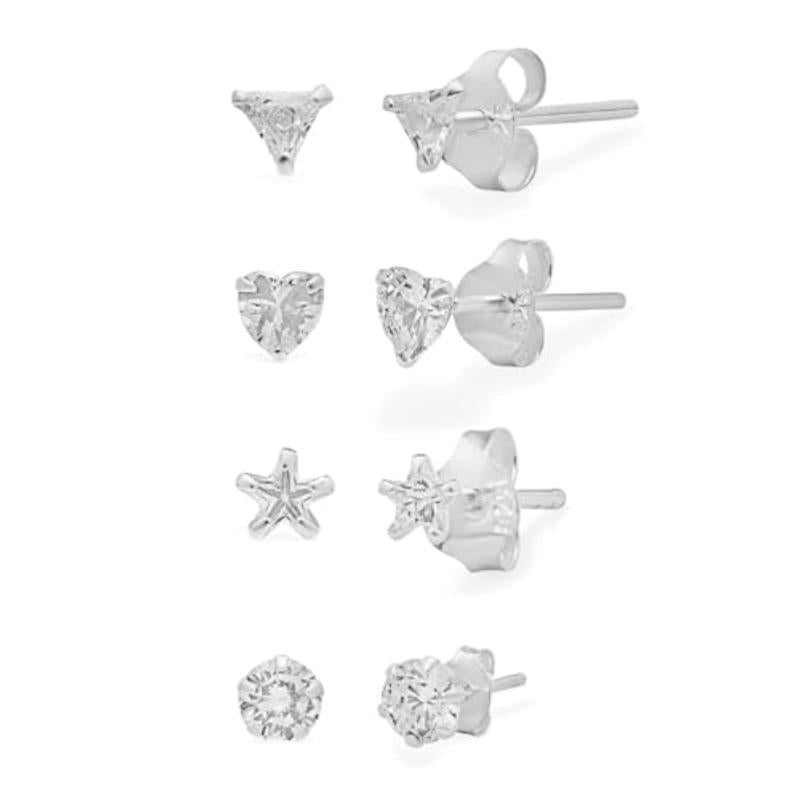 Get four pairs of stunning sterling silver stud earrings featuring heart, solitaire, triangular, and floral designs with sparkling cubic zirconia stones.