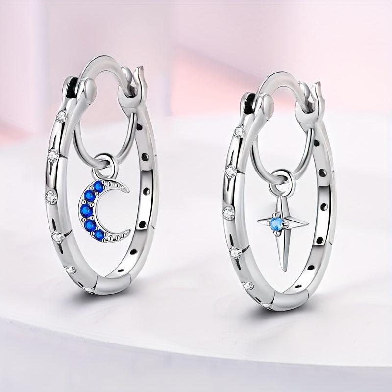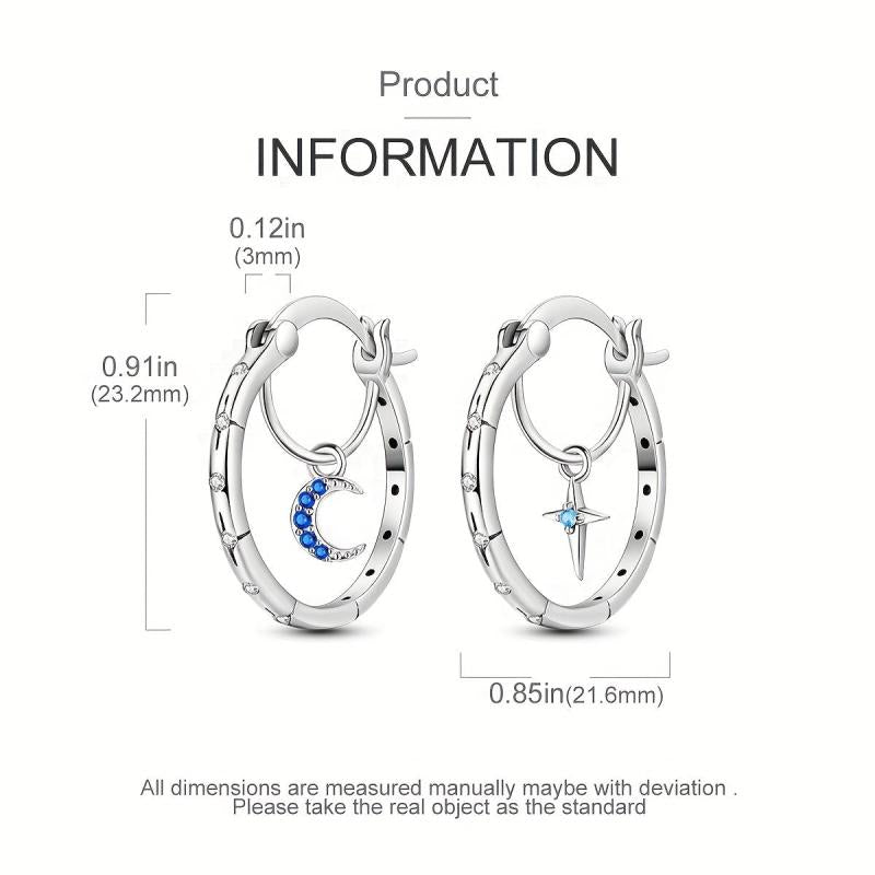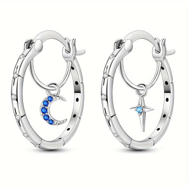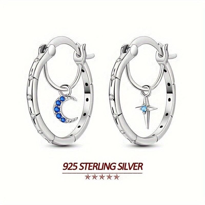 Enhance your style with these stunning 925 sterling silver hoop earrings featuring celestial moon and star design. Adorned with sparkling zirconia CZ stones, these dangle earrings will add a touch of elegance to any outfit.
