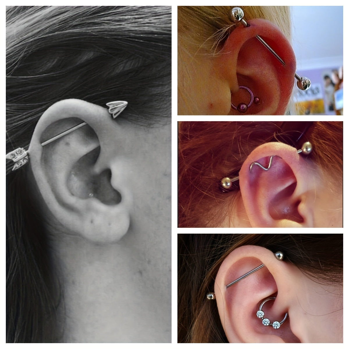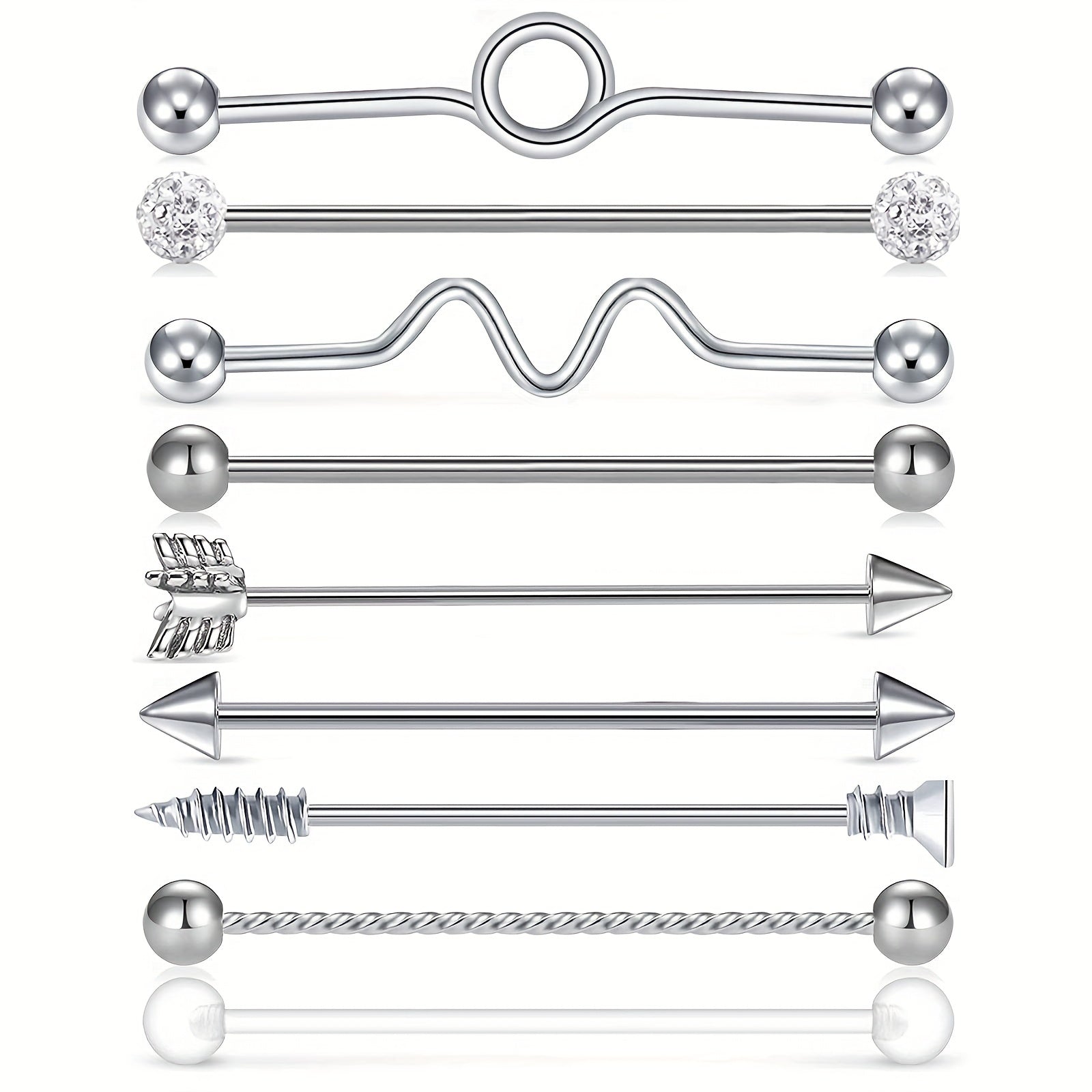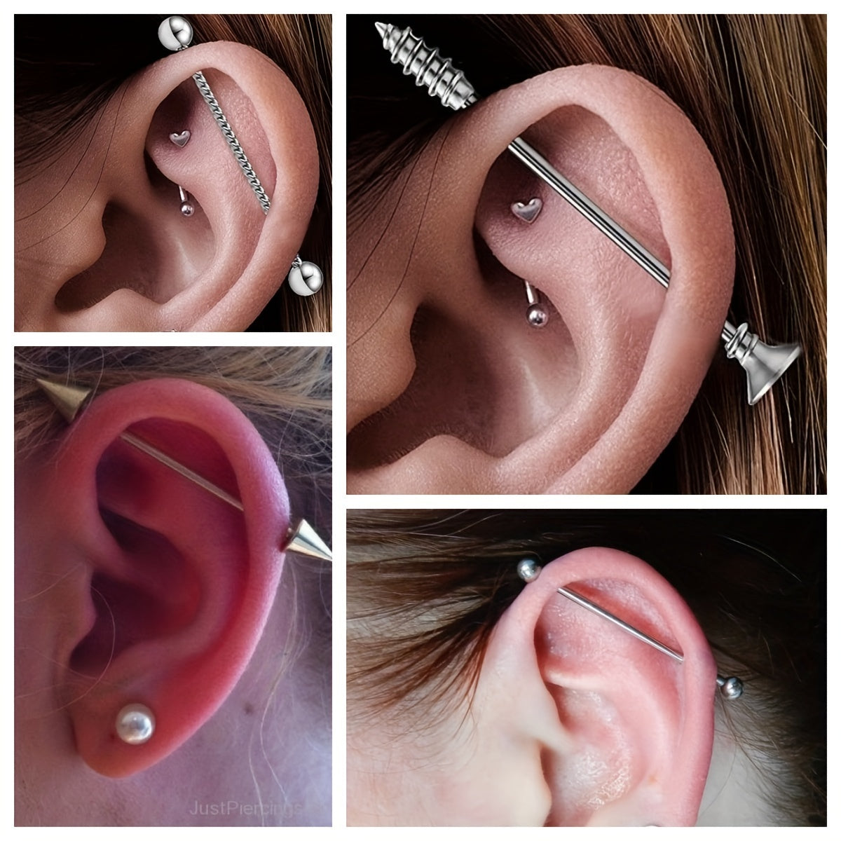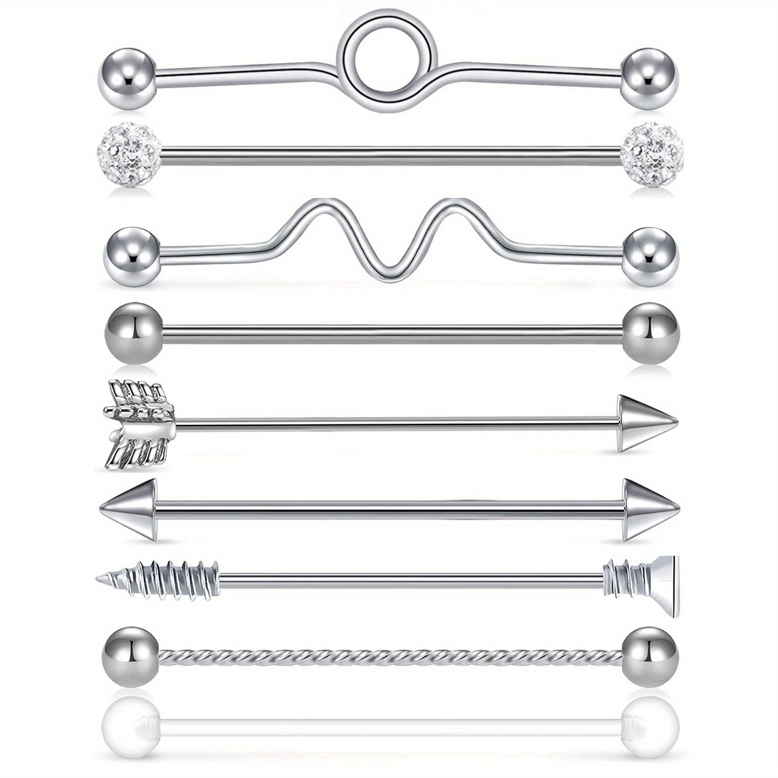 This set includes 9 industrial barbell earrings made of surgical steel. Each earring features a heart ball bead wrap style design. Suitable for cartilage piercings, these earrings are great for both women and men.