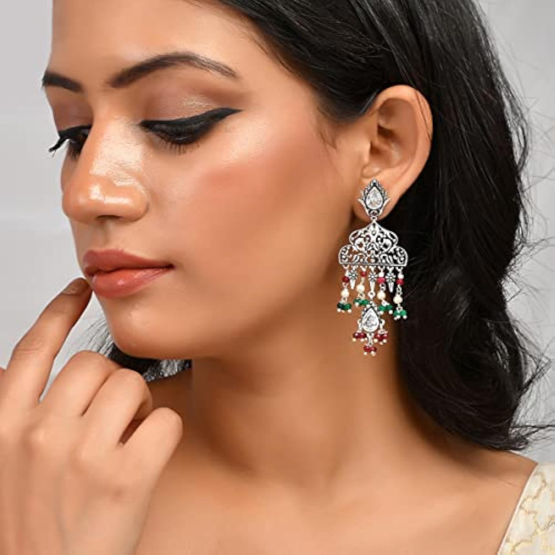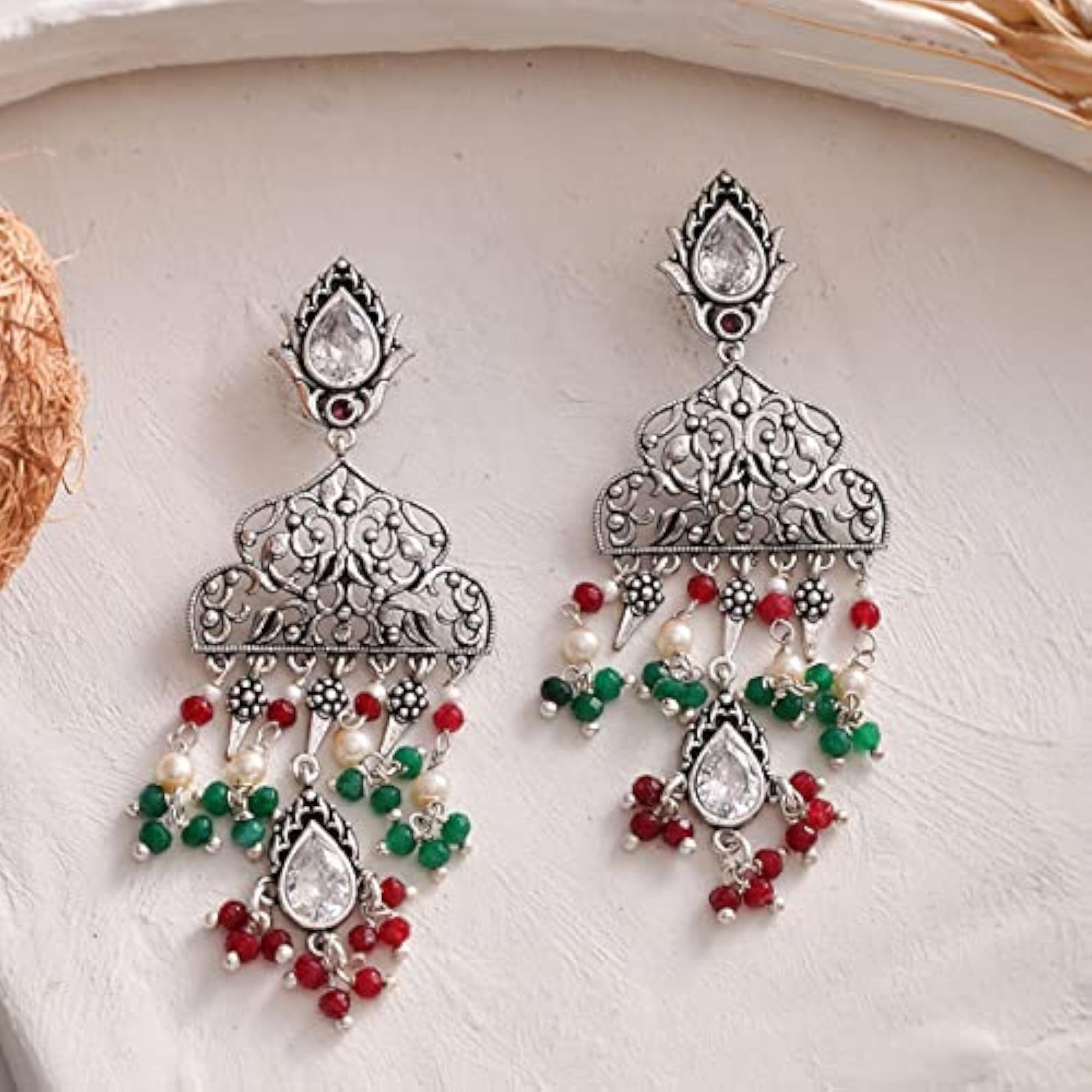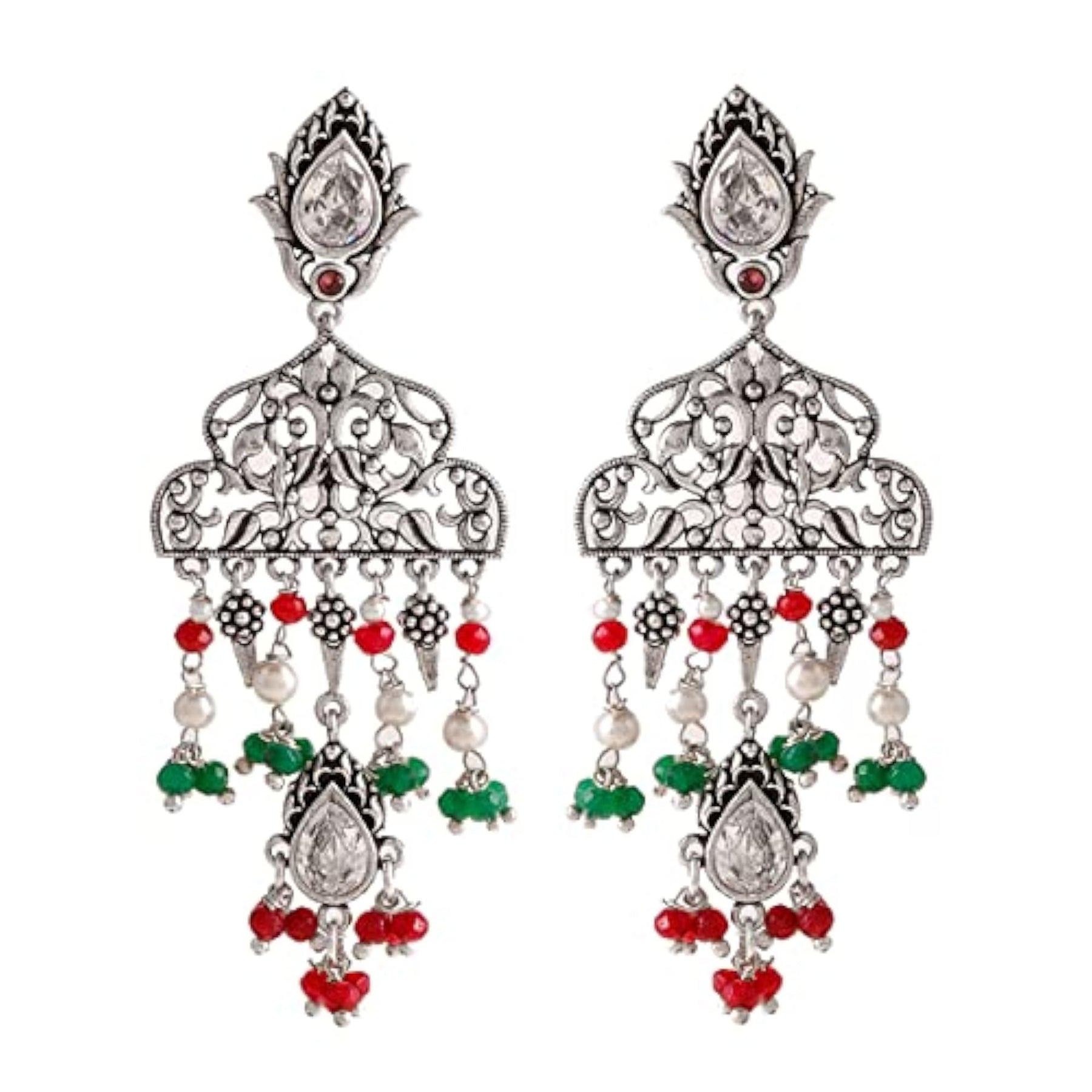 These beautiful earrings feature a delicate filigree design with light embellishments. Perfect for adding a touch of elegance to any outfit.