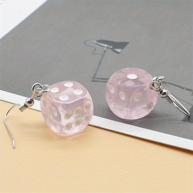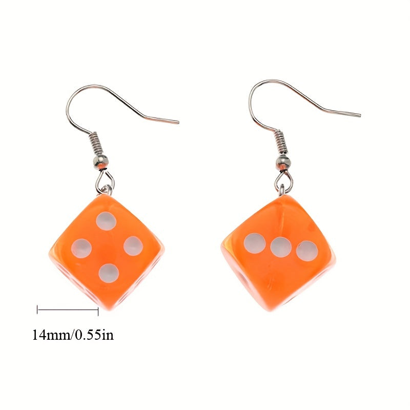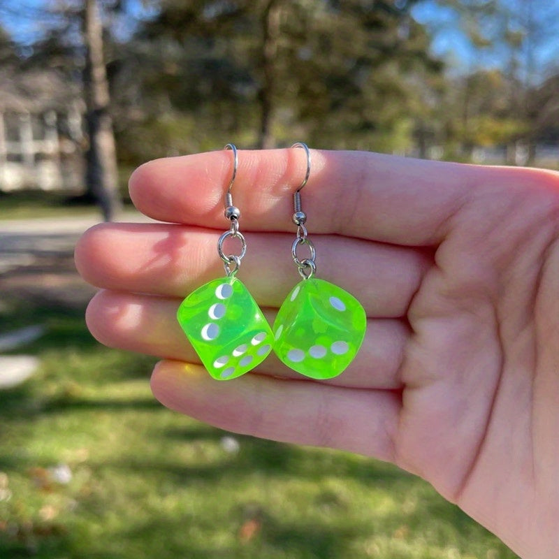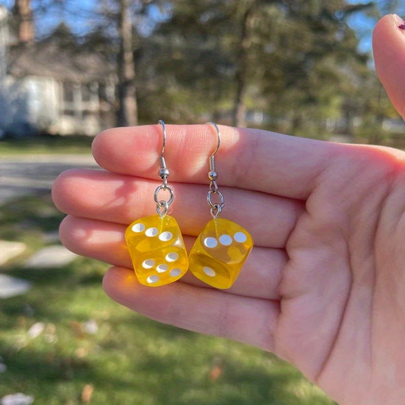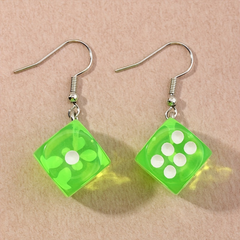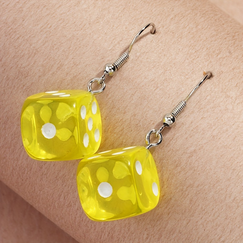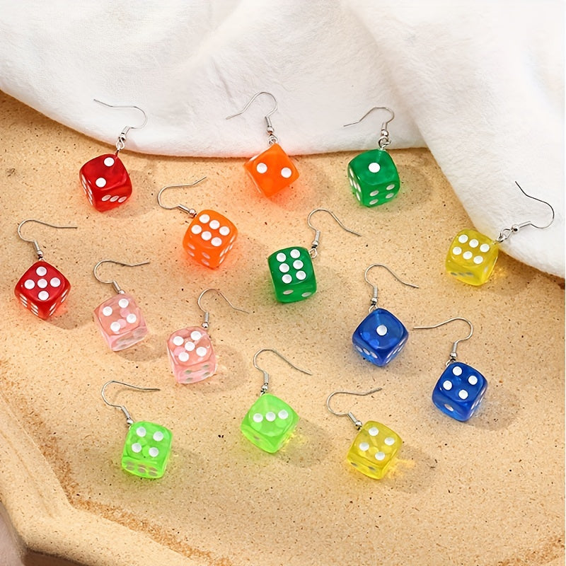 These colorful acrylic earrings feature a fun cartoon dice design. They are perfect for adding a playful touch to any outfit. Makes a great gift for women and girls.