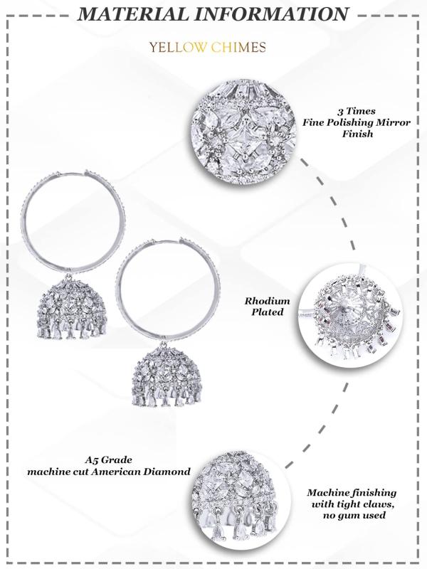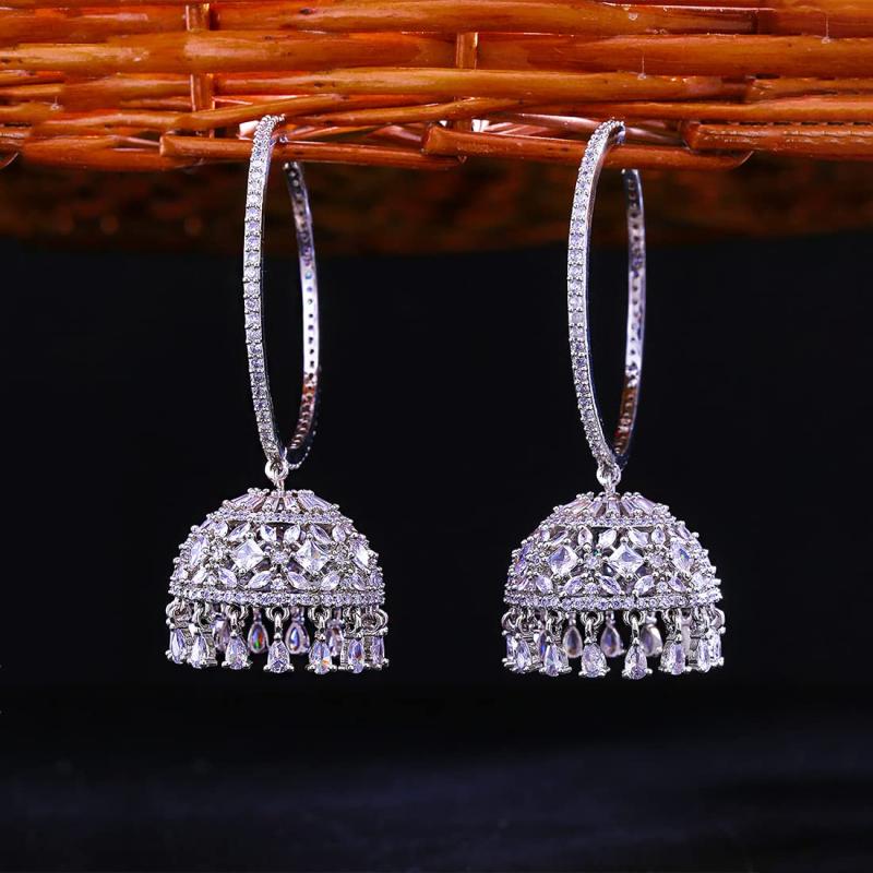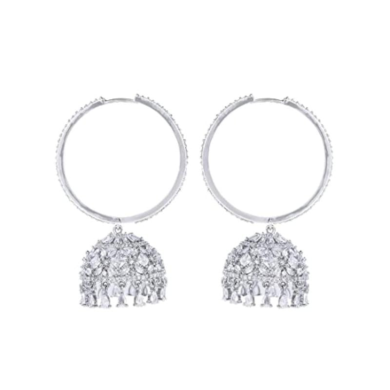 Elegant and stylish hoop jhumka earrings adorned with American diamonds. Rhodium plated for a lasting shine.