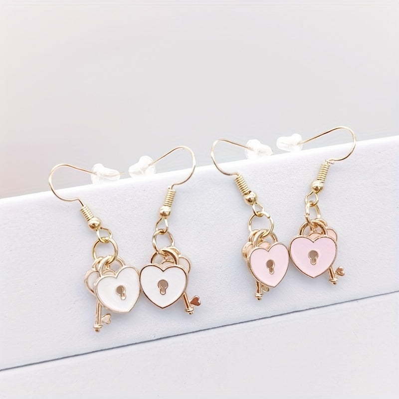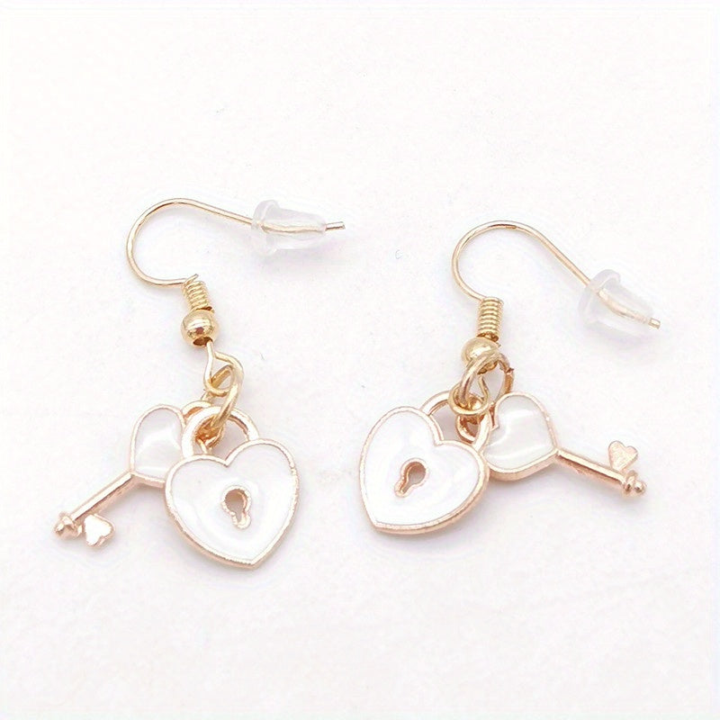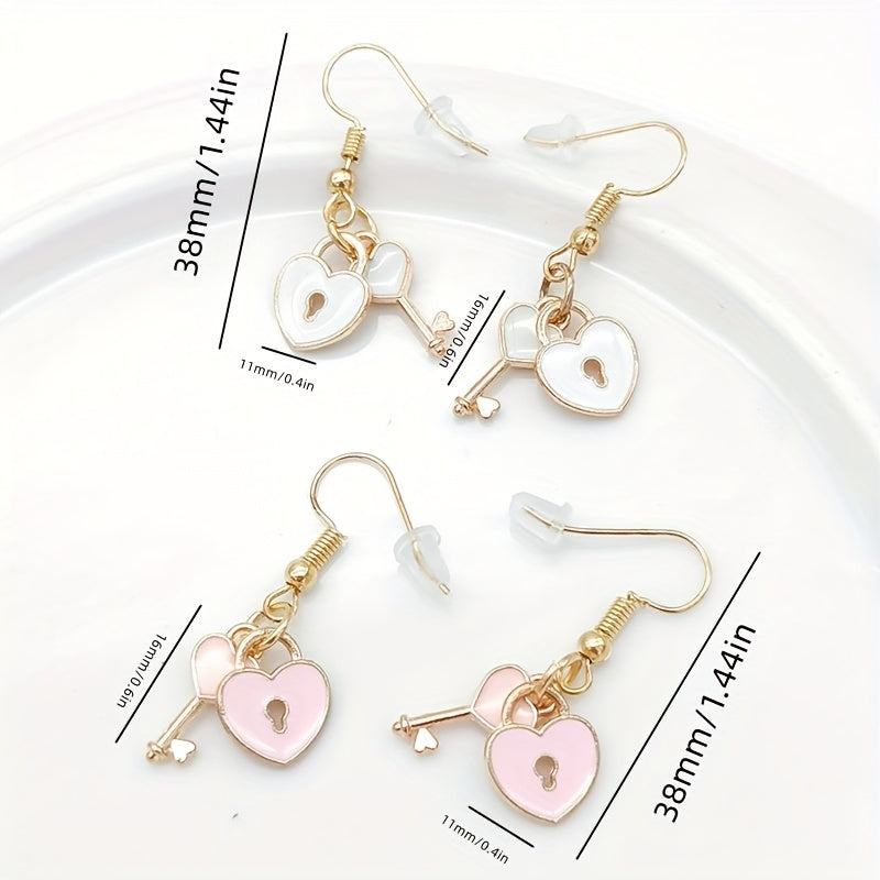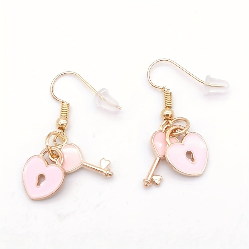 Adorn your ears with these unique heart and key shaped earrings. Made from alloy, they feature a funky drip oil design that adds a touch of style to any outfit.