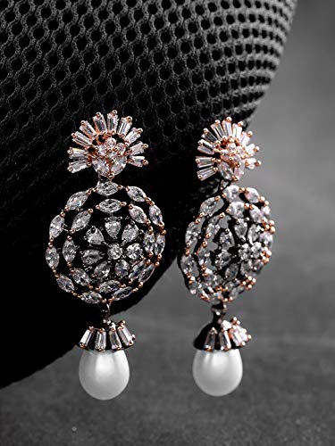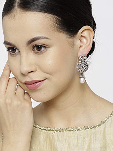 These stylish earrings feature a pearl drop design with a silver toned look, perfect for adding an elegant touch to any outfit.