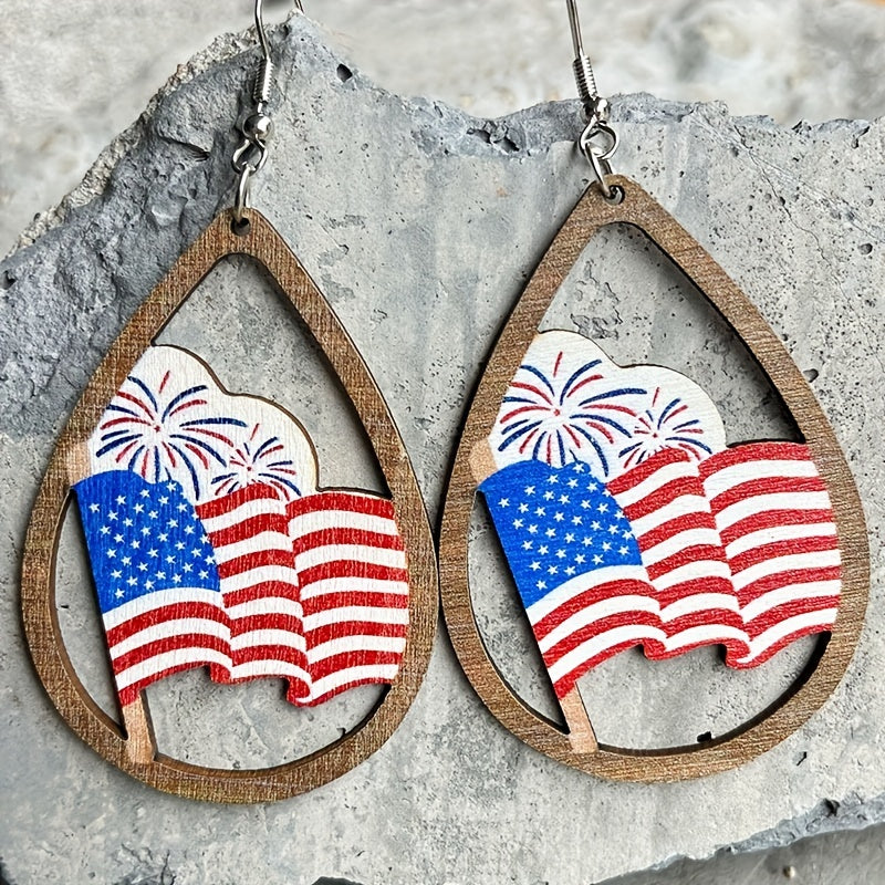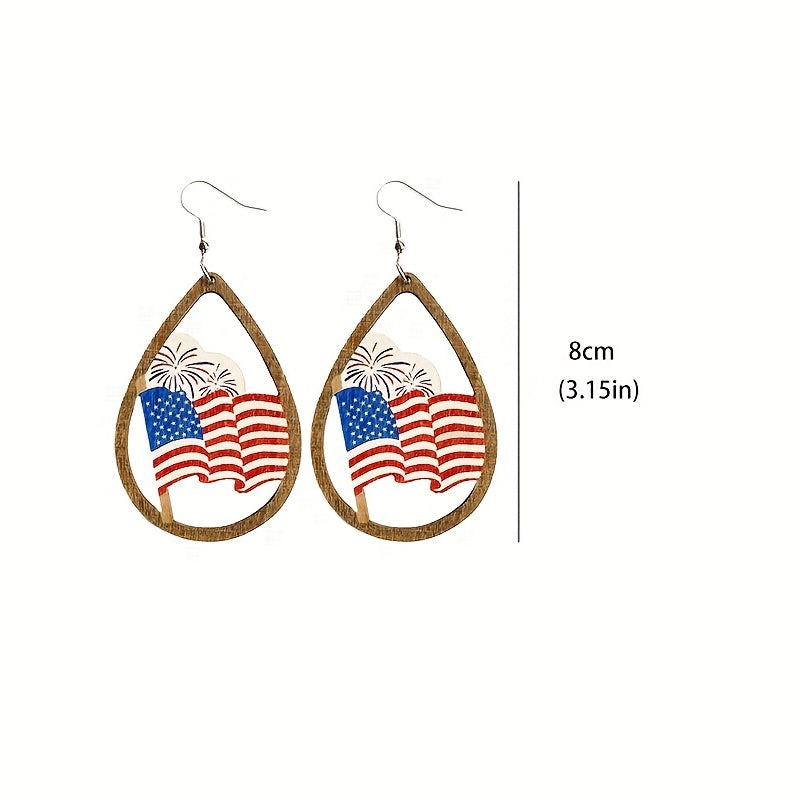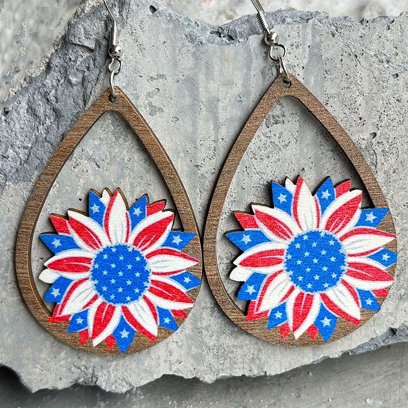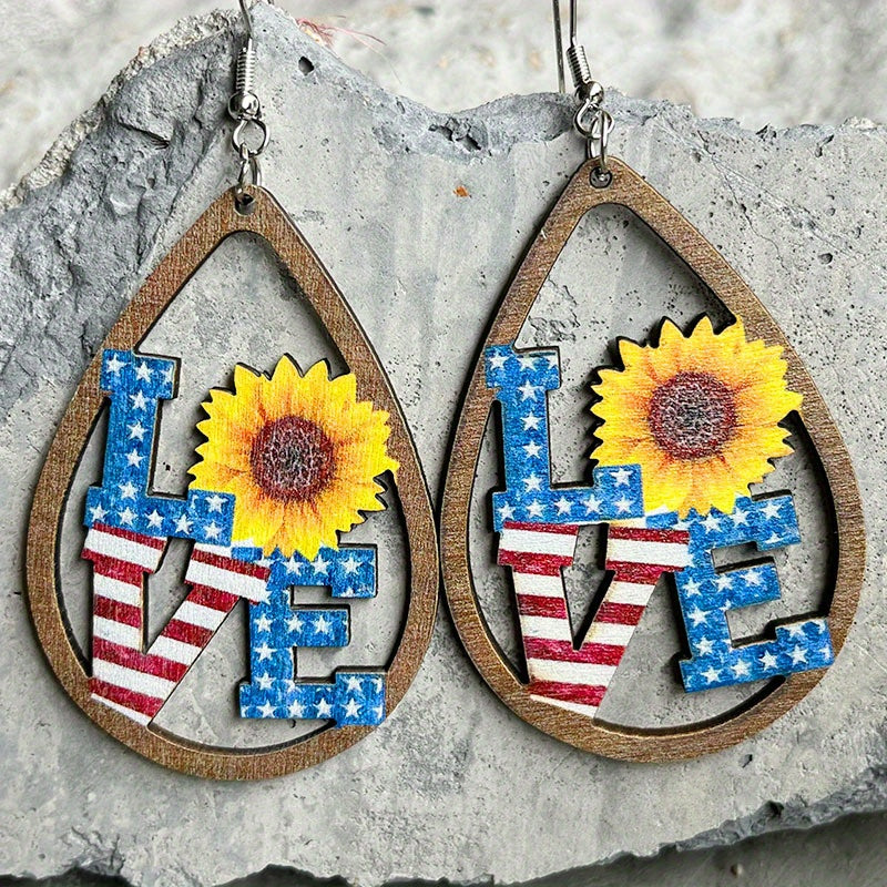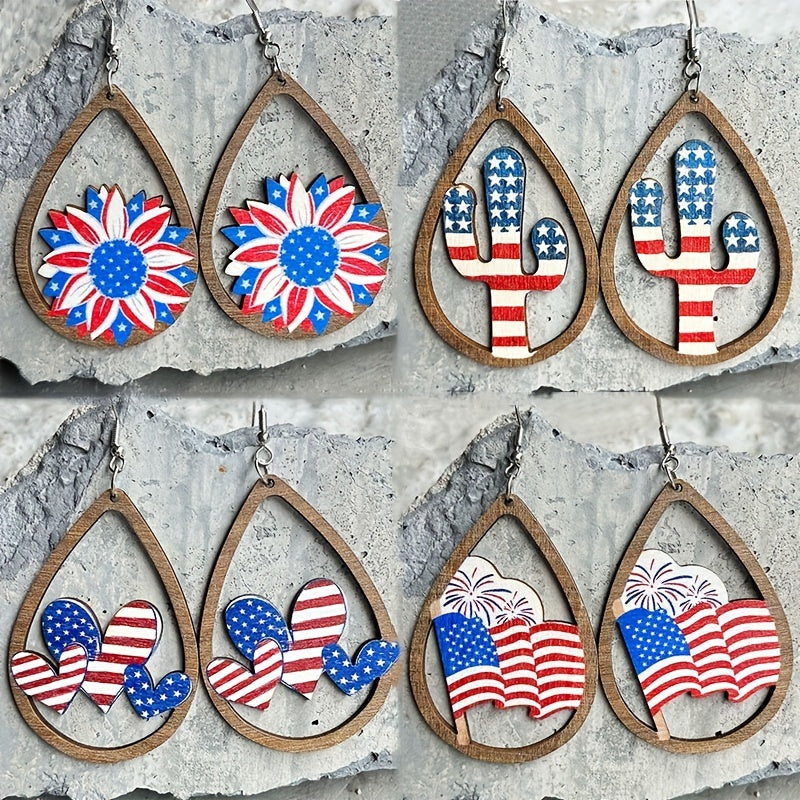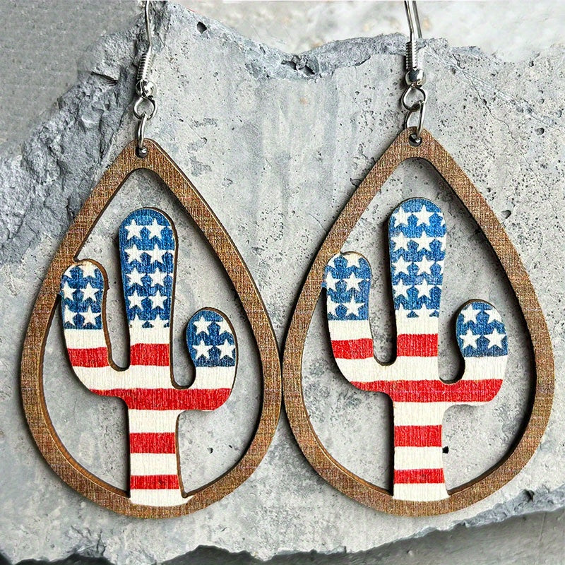 These retro dangle earrings feature a unique design with American flag, cactus, sunflower, and heart elements. Perfect gift for females who love wooden jewelry.