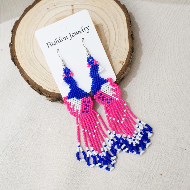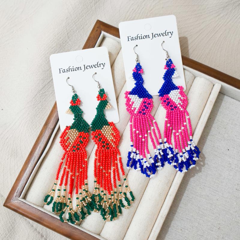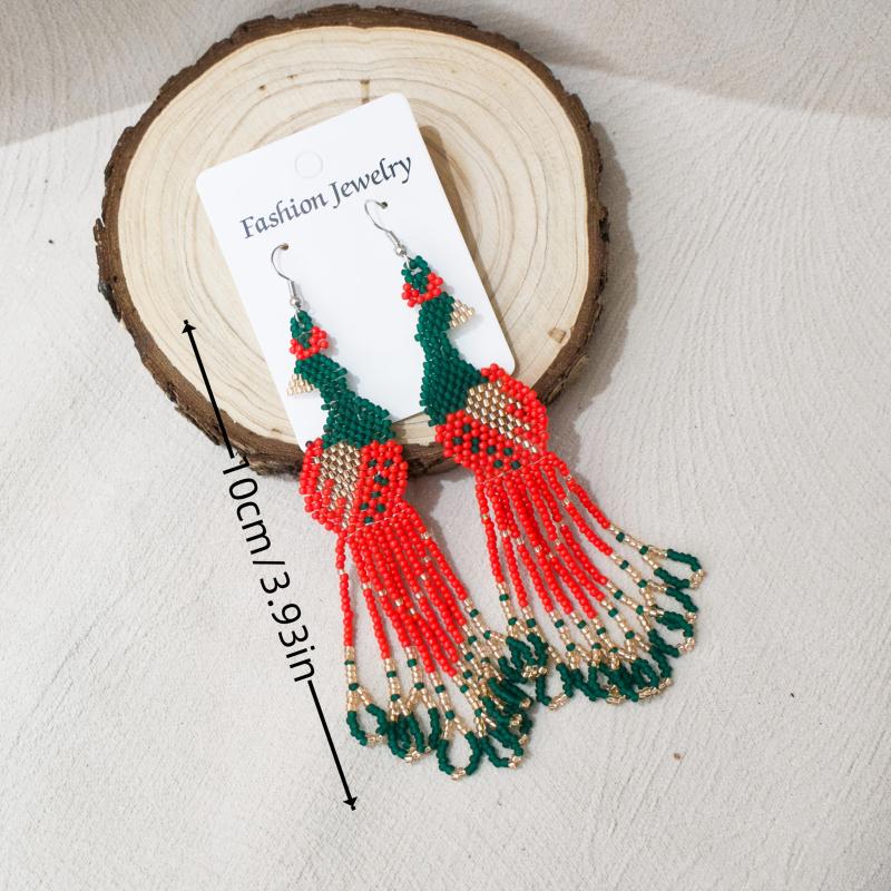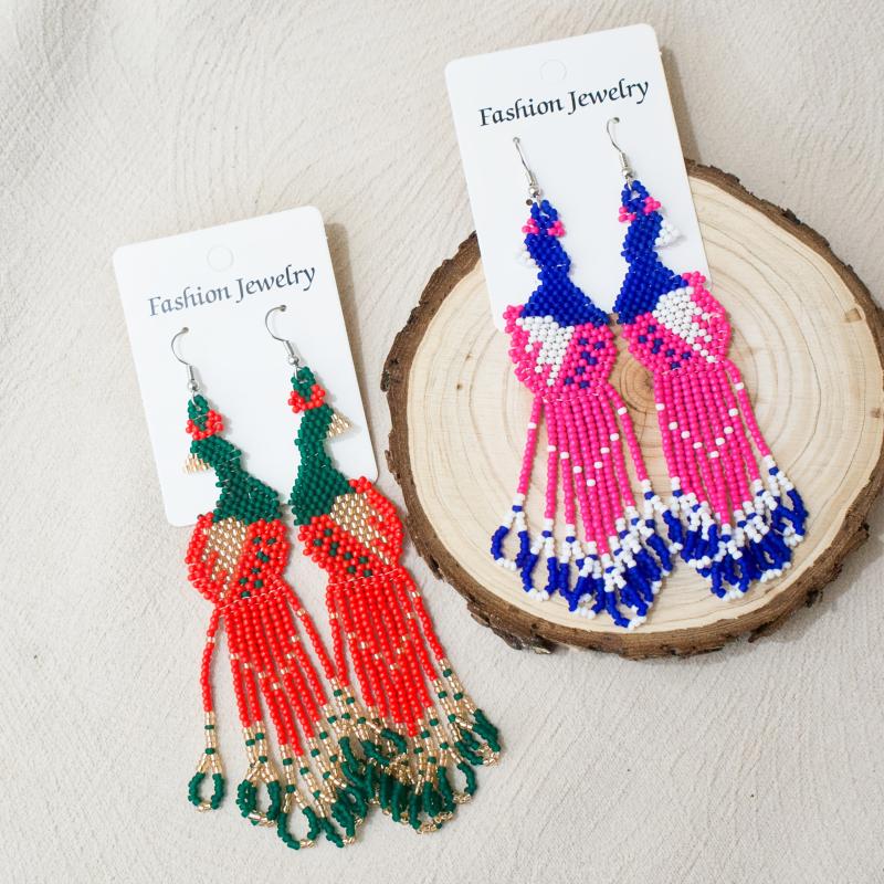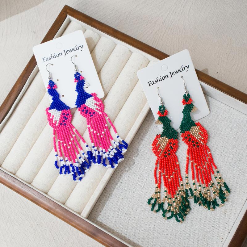 Add a pop of color and bohemian flair to your look with these gorgeous peacock-inspired drop earrings. The vibrant colors and intricate beadwork make these earrings a fun and unique accessory.