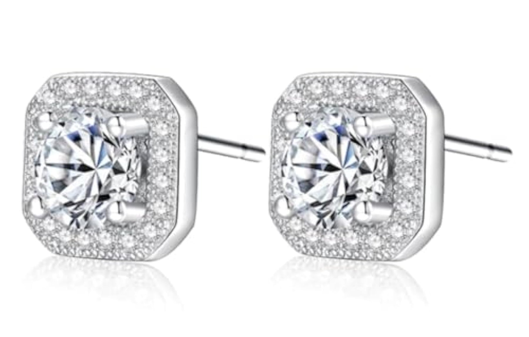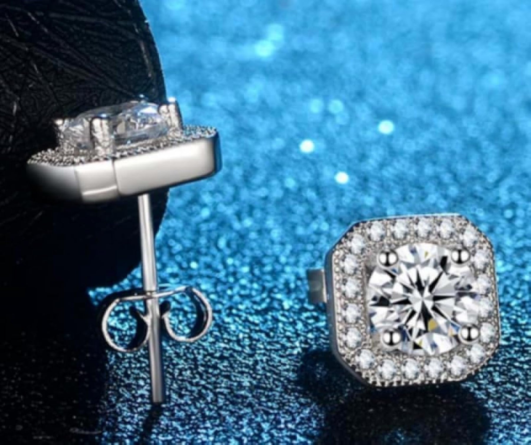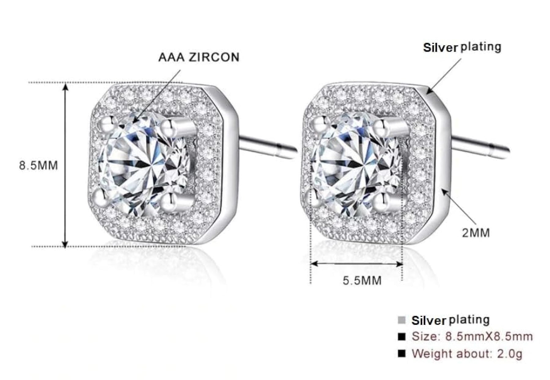 Elevate your look with these stunning square stud earrings featuring a halo of zirconia stones. Perfect for adding a touch of glamour to any outfit.