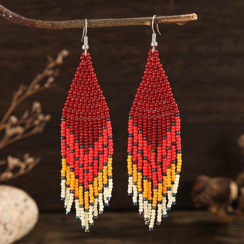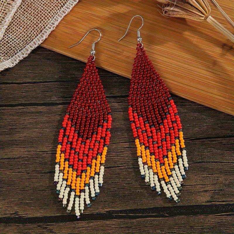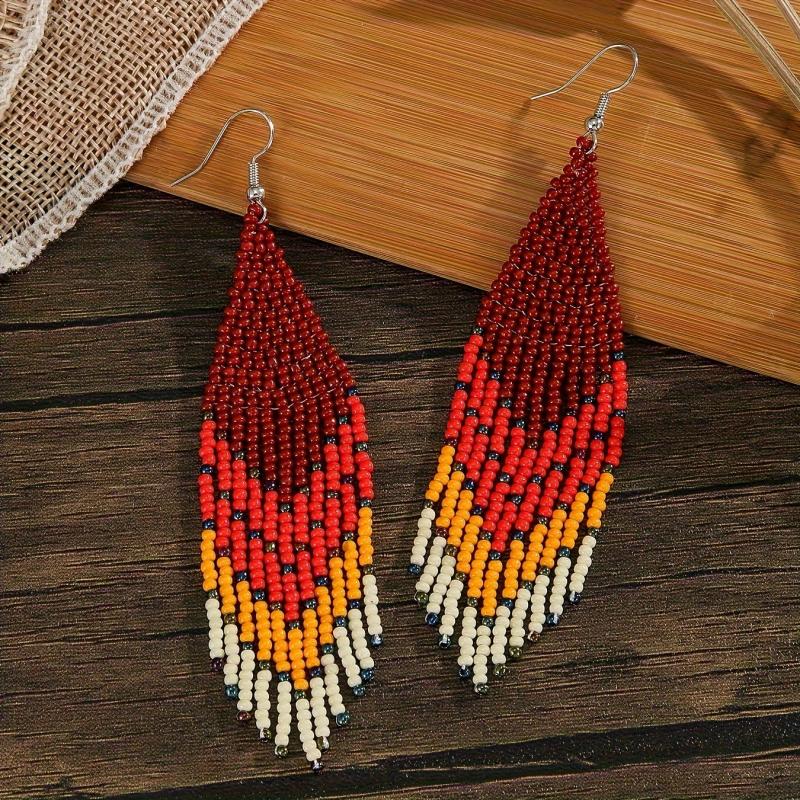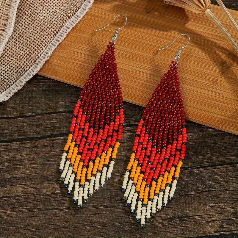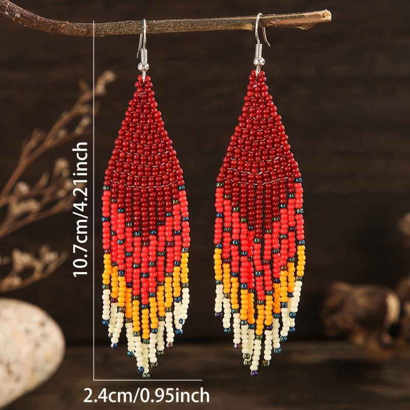 These soul beading earrings feature a red gradient tassel design with handwoven glass seed beads. Perfect for holiday and casual occasions, these earrings are a vintage-style accessory that can be worn all year round.