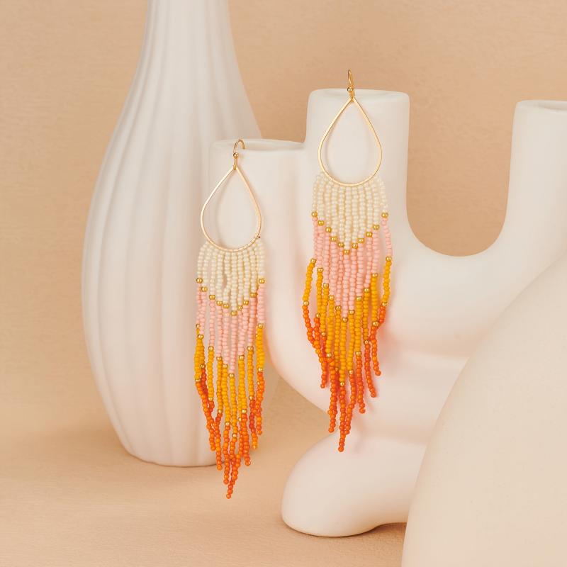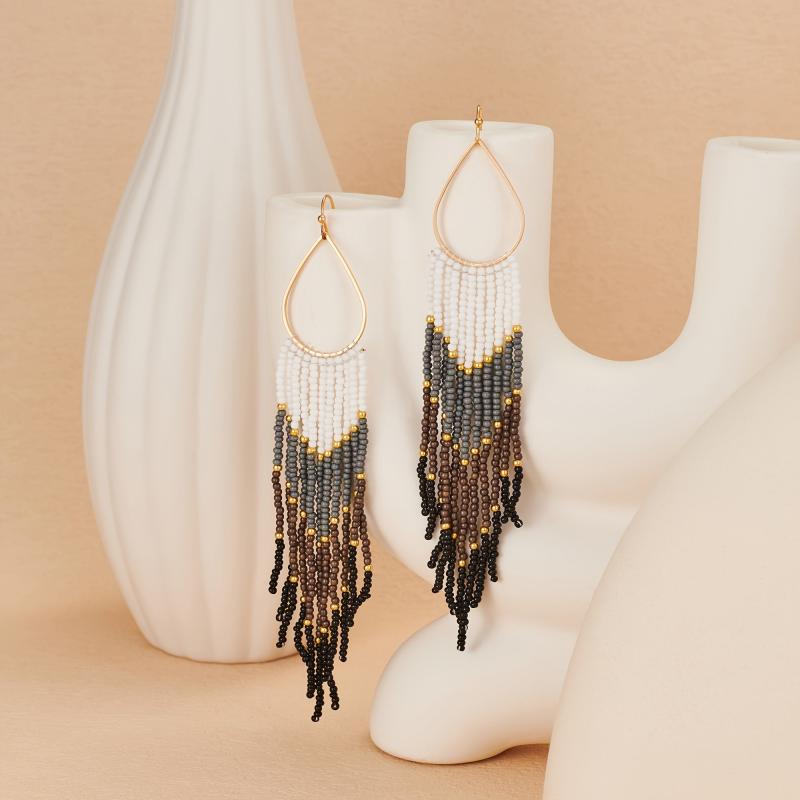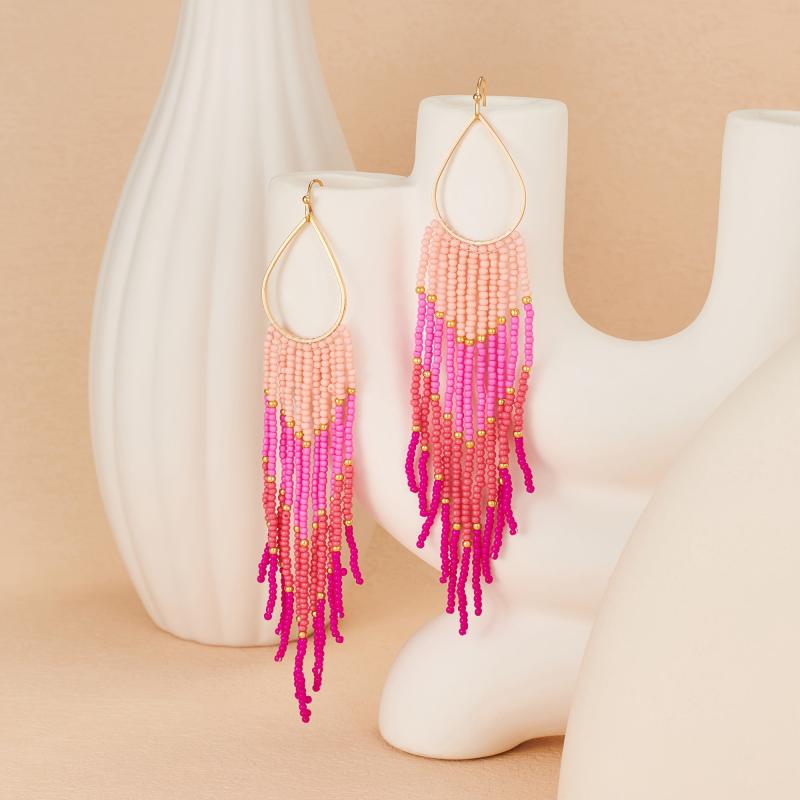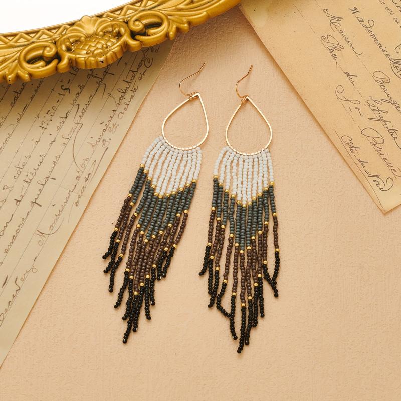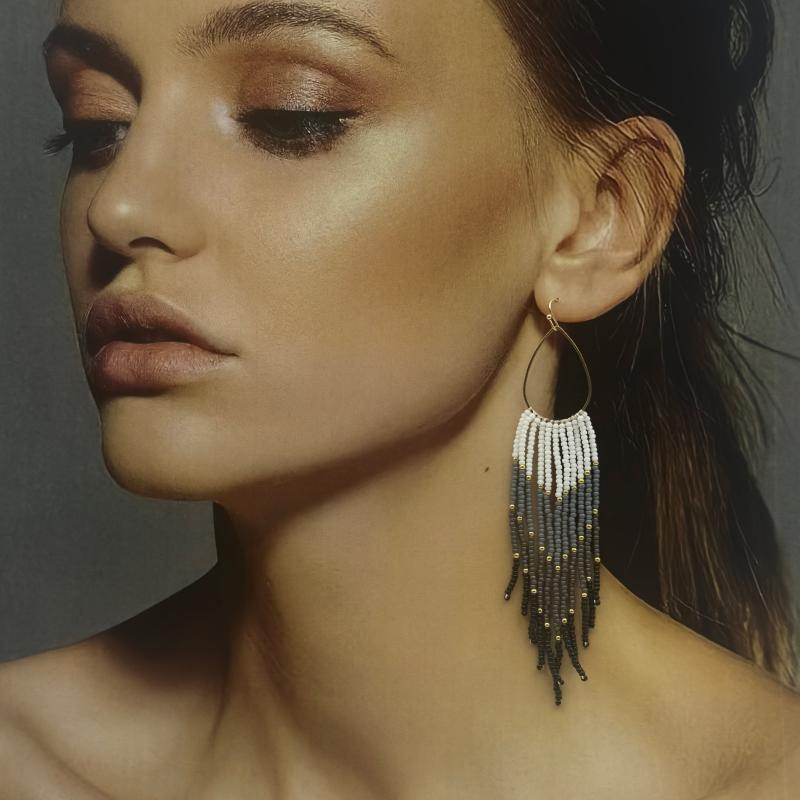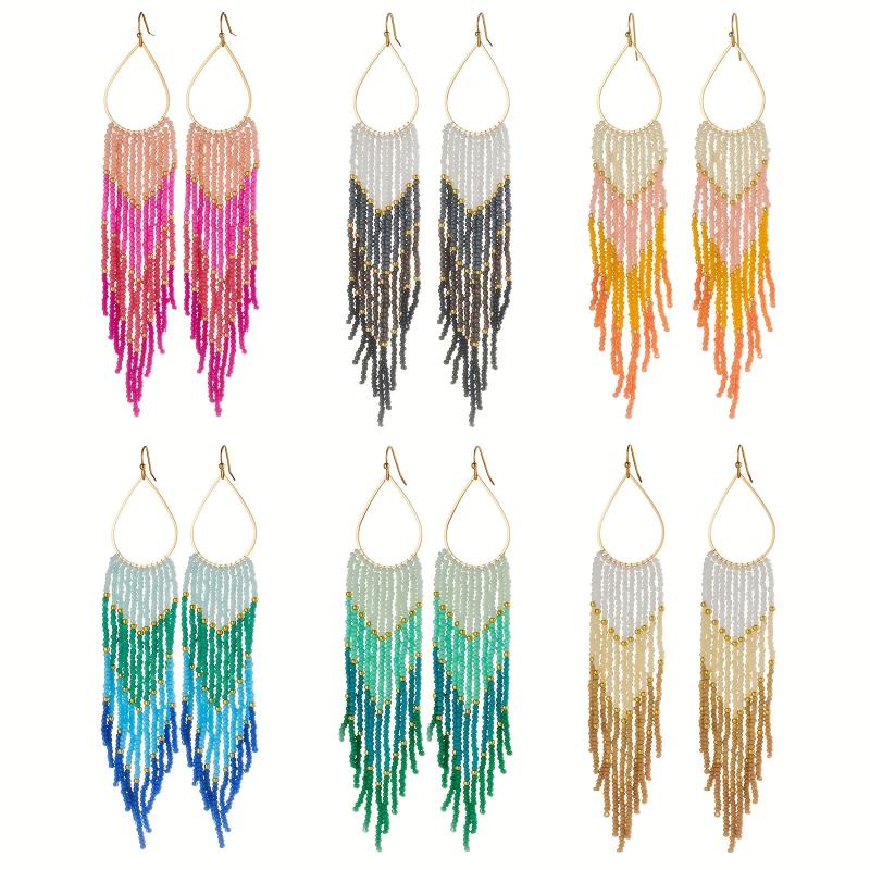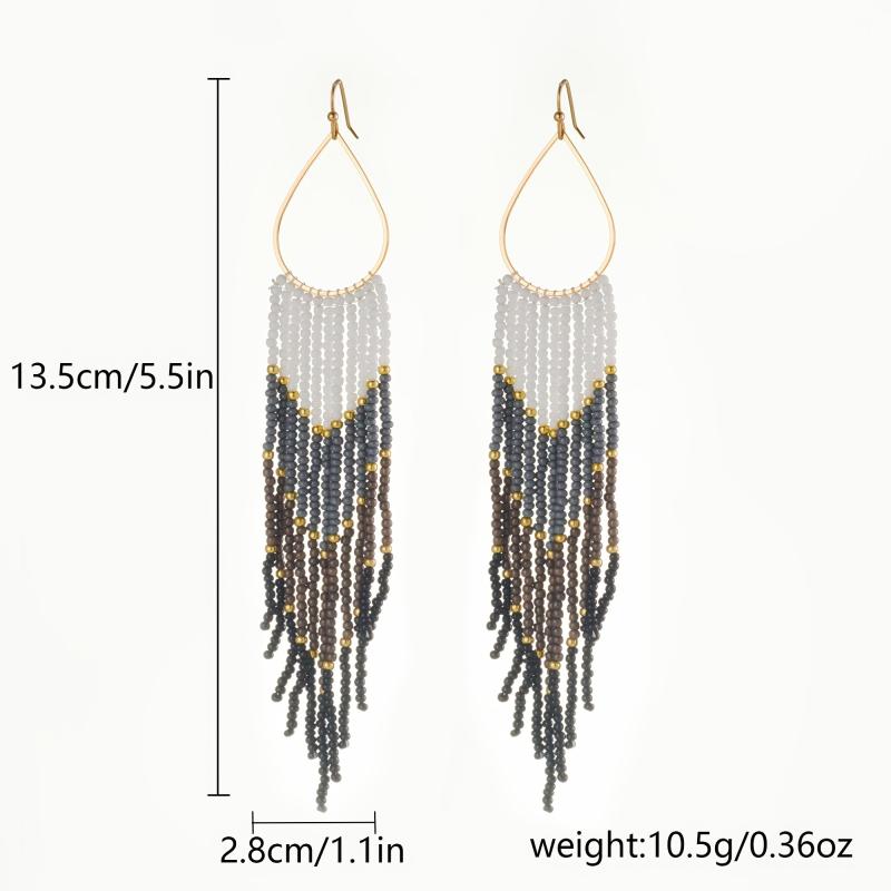 Make a statement with these long bohemian beaded tassel earrings. Featuring seed bead tassels, these earrings are perfect for adding a touch of bohemian style to your look.