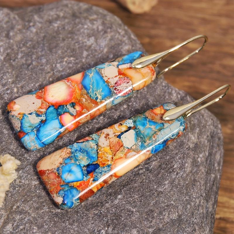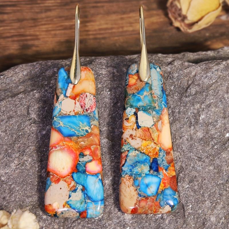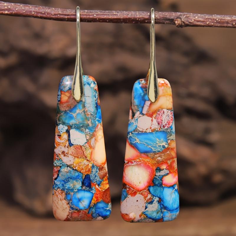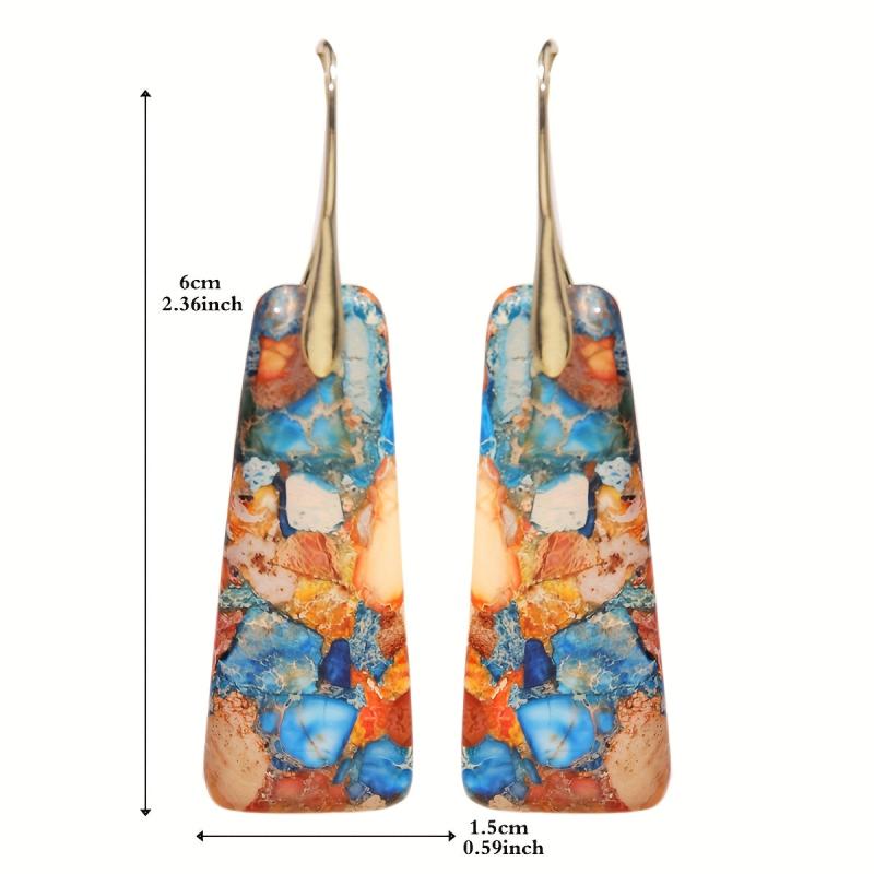 These vintage bohemian drop earrings feature natural stone teardrops with an orange floral pattern, perfect for summer vacation or daily wear.