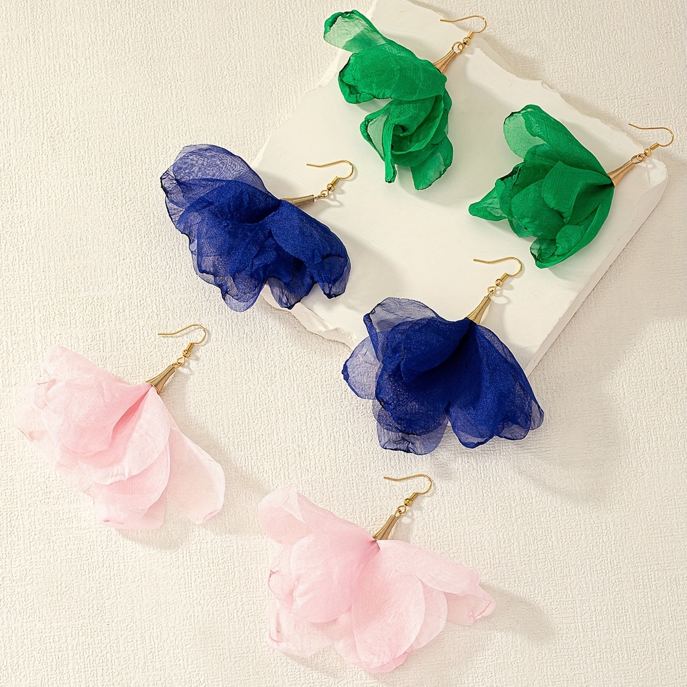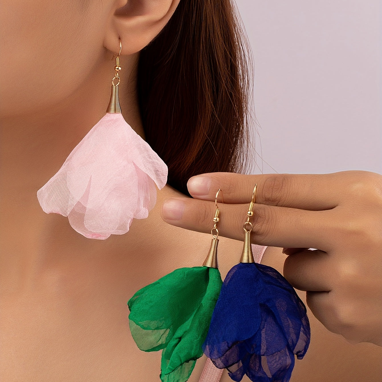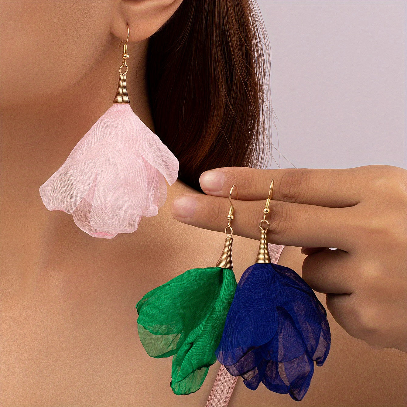 These fabric flower petal dangle earrings are perfect for adding a bohemian touch to your style. Ideal for stage performances and vacation outfits.