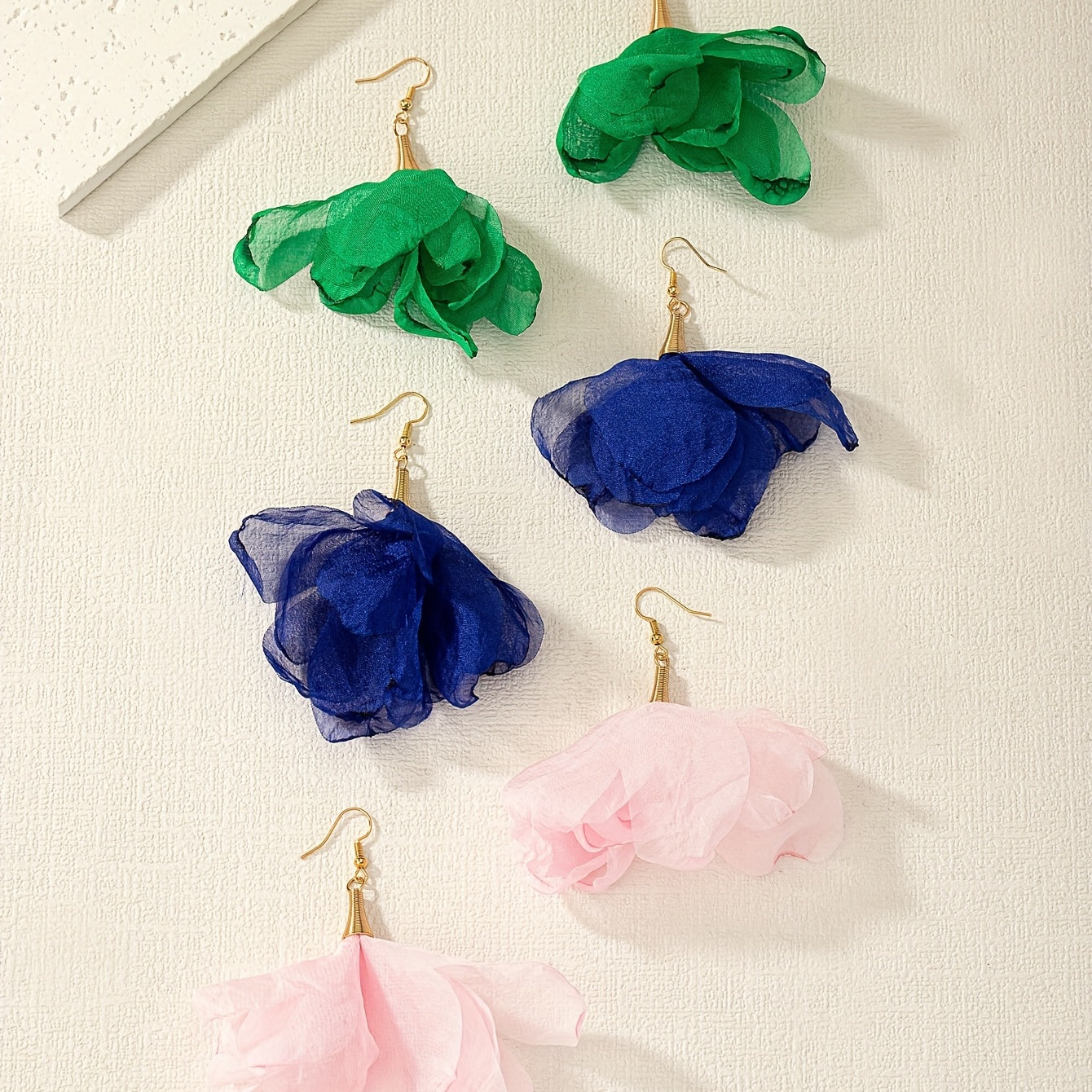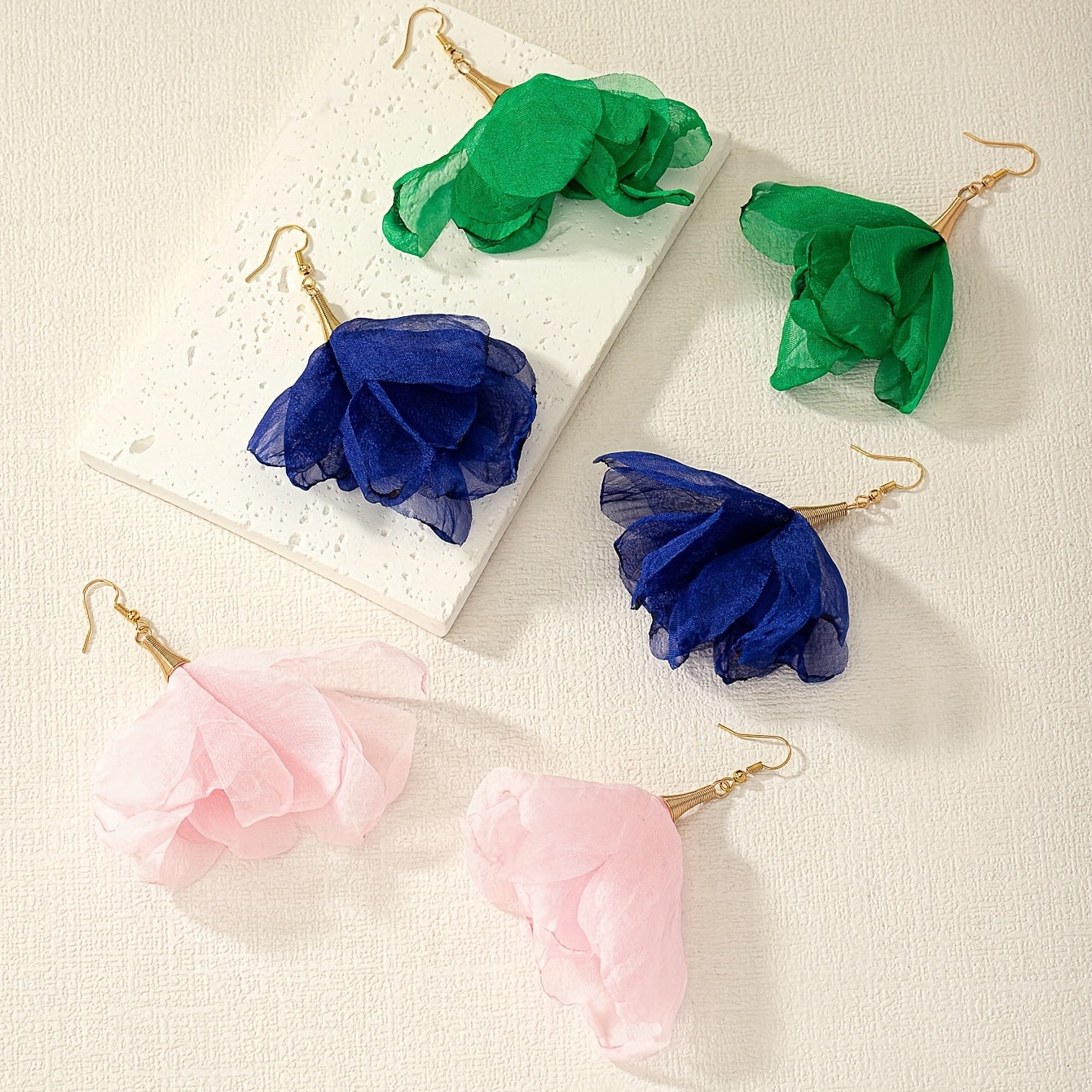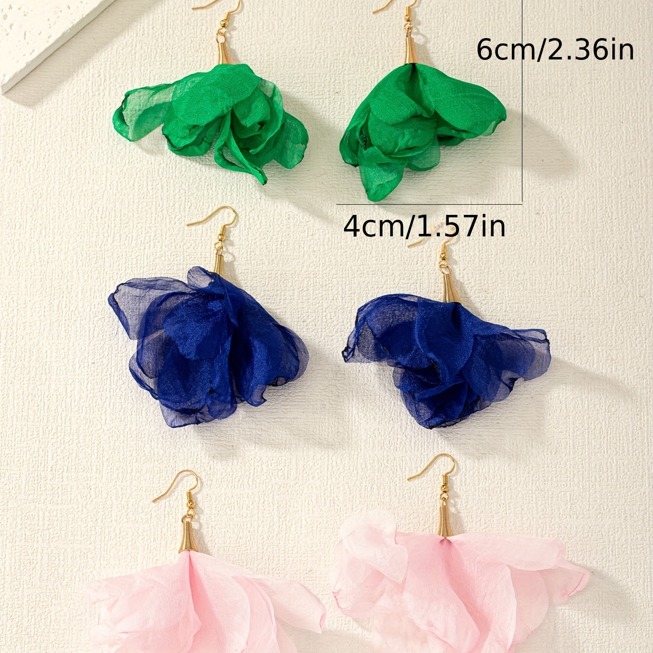 These fabric flower petal dangle earrings are perfect for adding a bohemian touch to your style. Ideal for stage performances and vacation outfits.