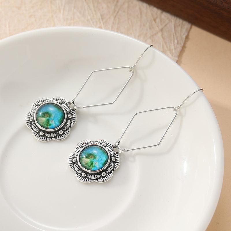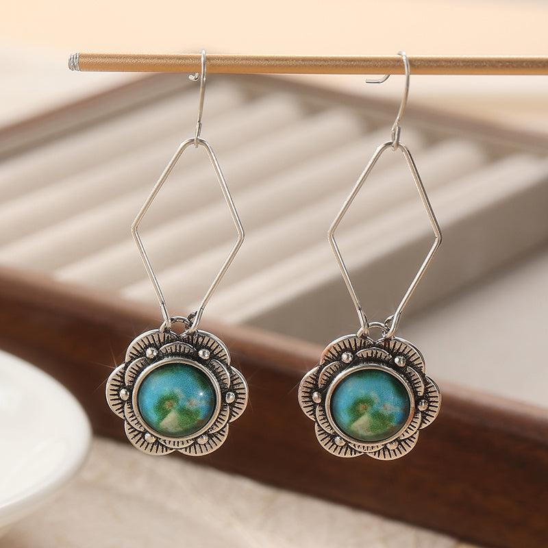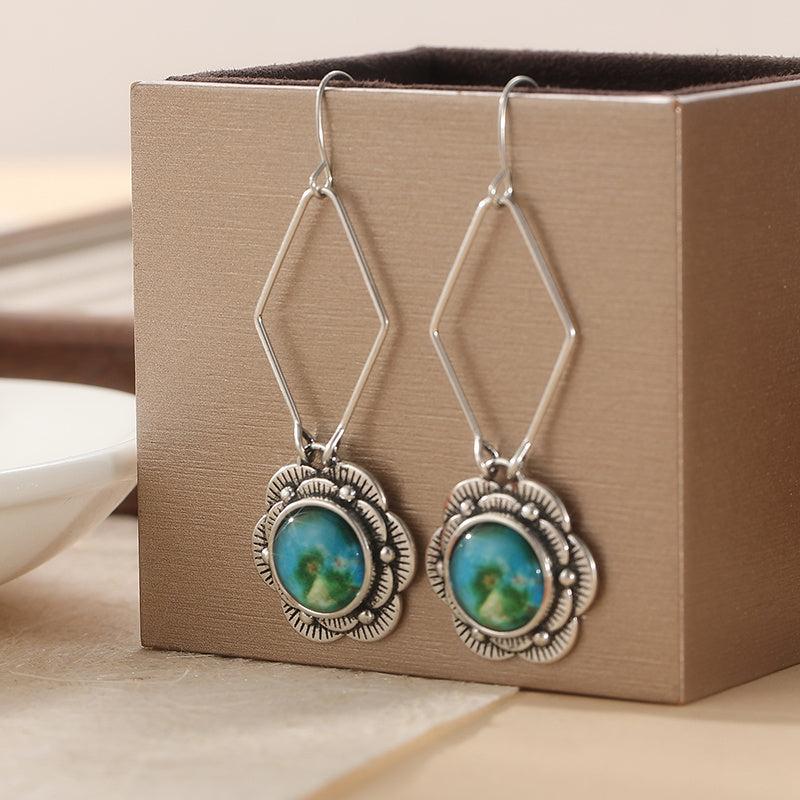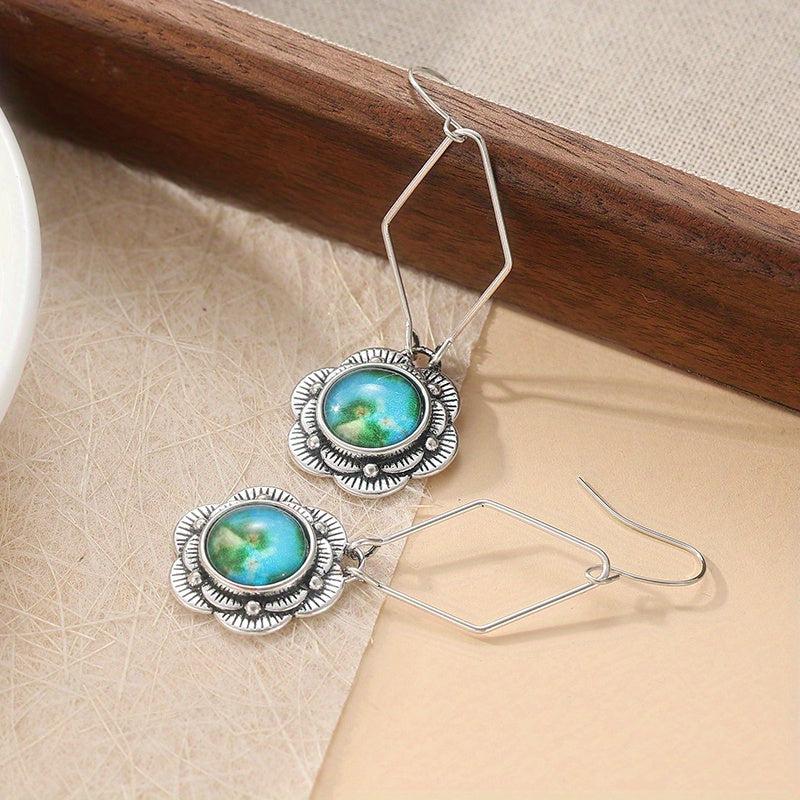 Elevate your style with these stunning Bohemian earrings featuring floral and geometric designs with turquoise synthetic resin inlay. Perfect for Thanksgiving and daily wear.