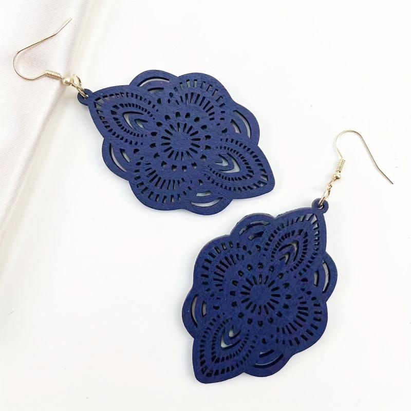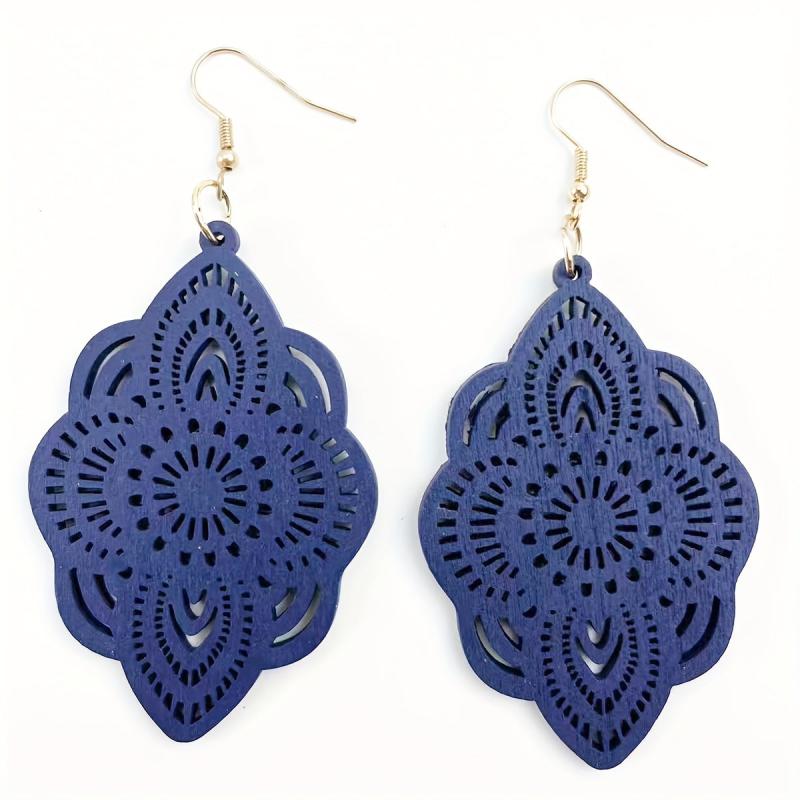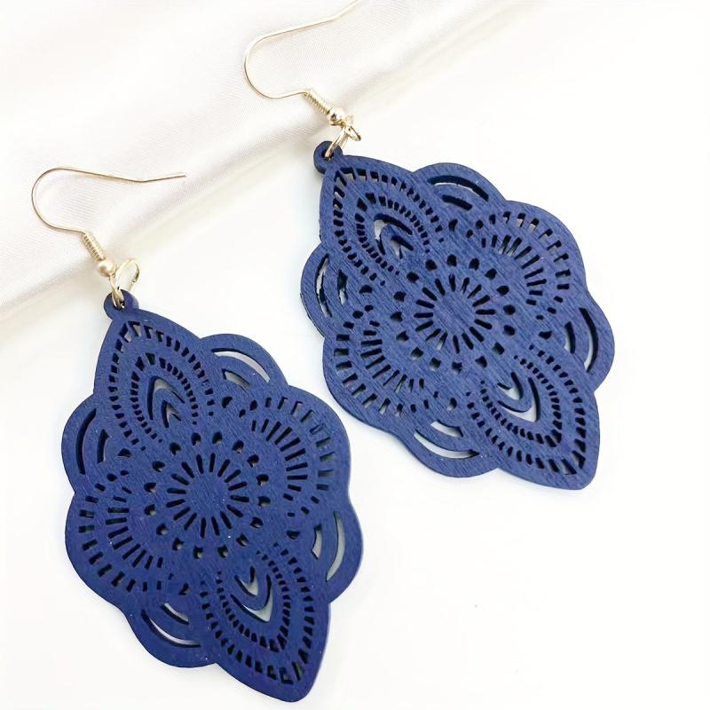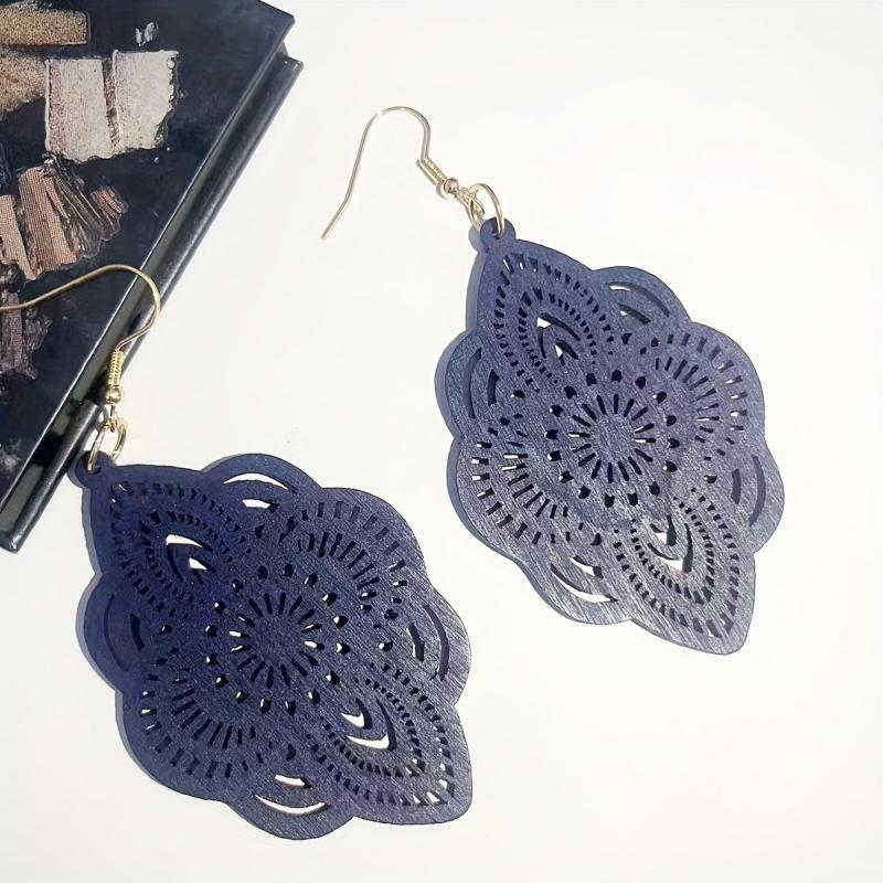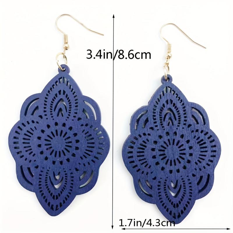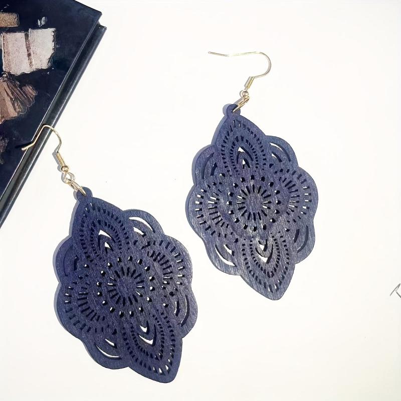 These beautiful hollow carved dangle earrings feature a bohemian style design, perfect for daily casual wear. Crafted from wood, these earrings are lightweight and comfortable to wear.