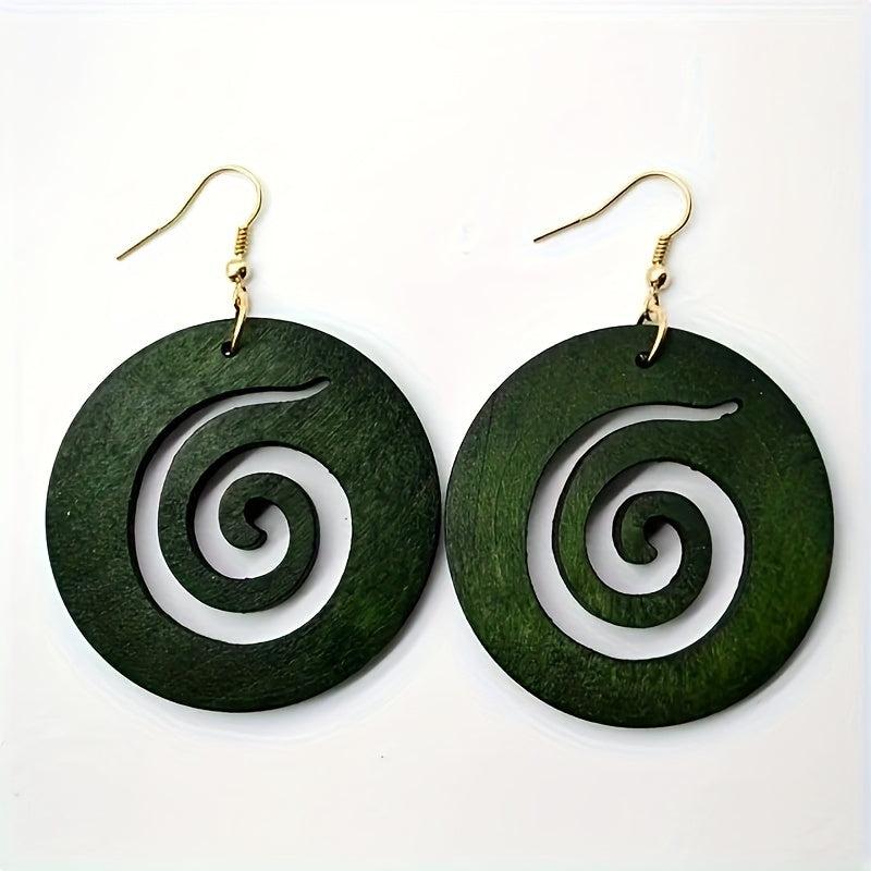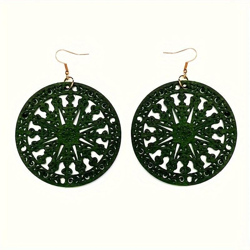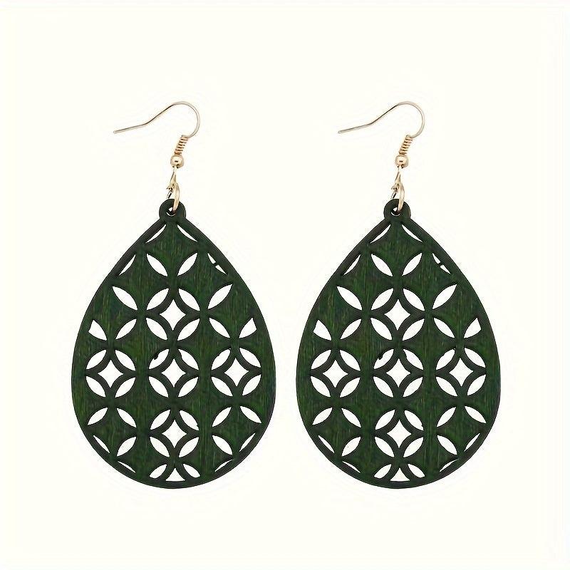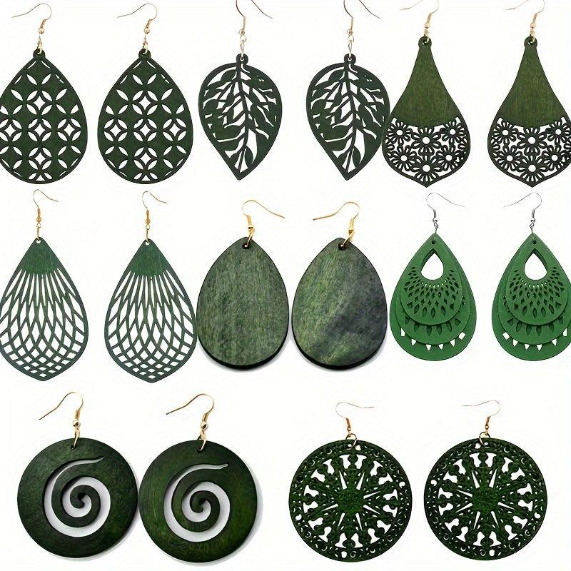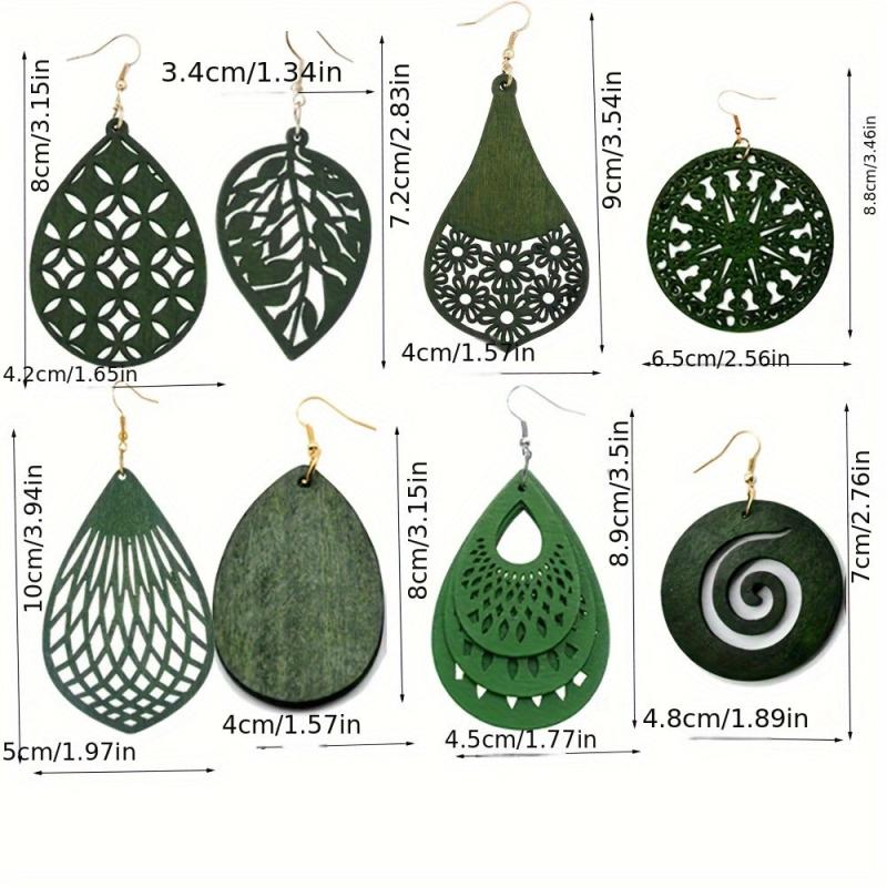 Add a touch of retro charm to your style with this set of 8 pairs of wooden carved pattern dangle earrings. Perfect for holidays and everyday wear.
