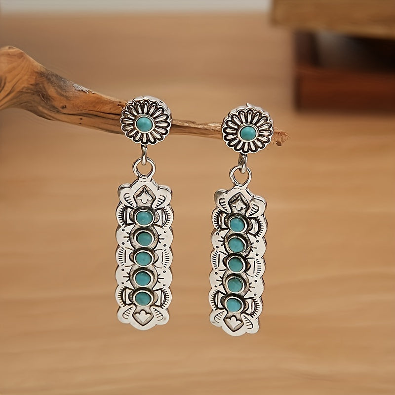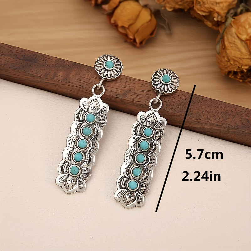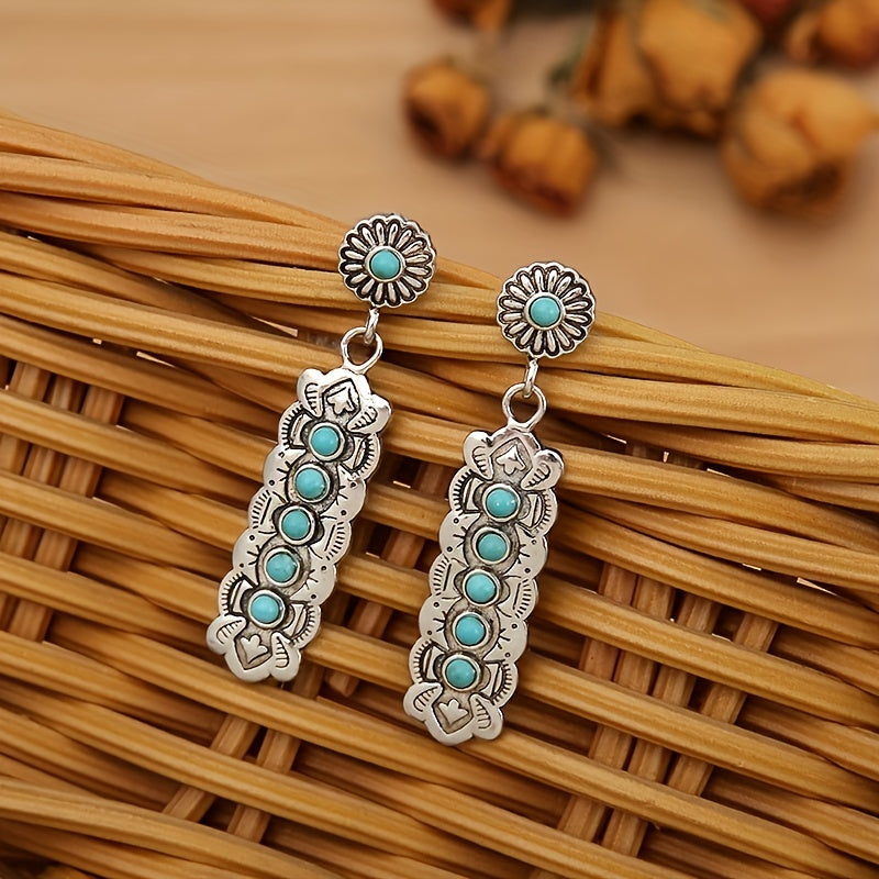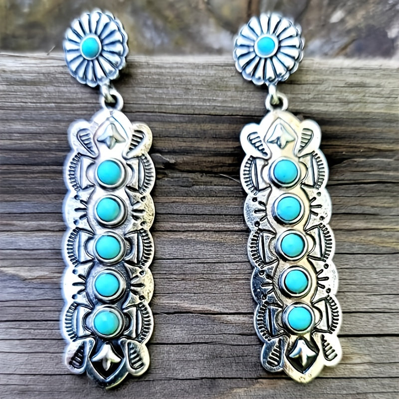 Add a touch of retro style with these Bohemian drop earrings featuring carved turquoise stones. These earrings are perfect for men who love to make a fashion statement.