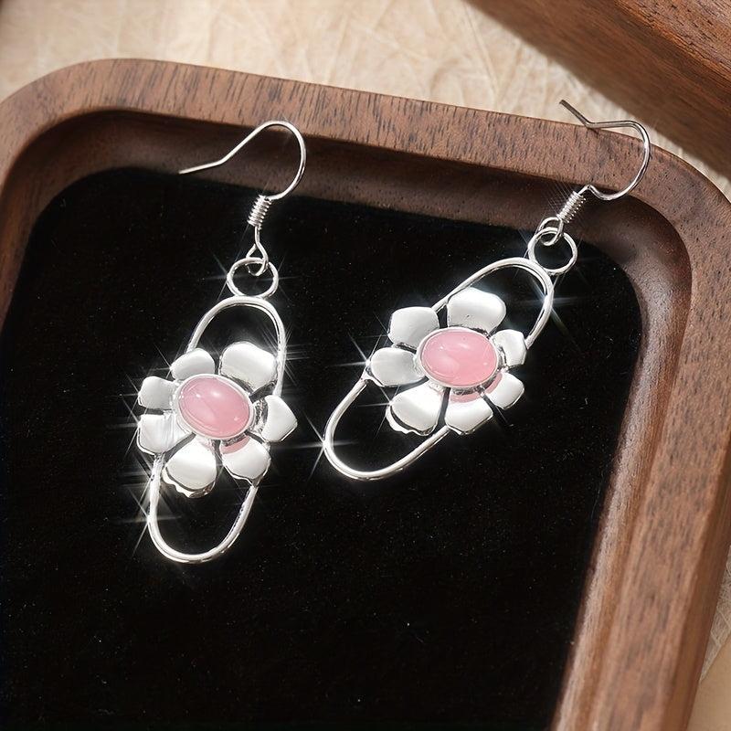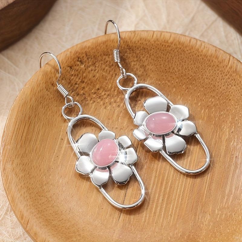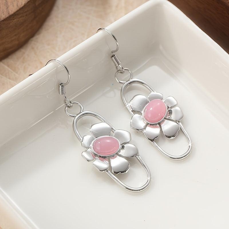 Unique vintage-inspired boho dangle earrings featuring conch and moonstone design. These pink and silver floral earrings are made with copper hooks, making them a perfect gift idea for women. They can be worn as everyday earrings or for special occasions.