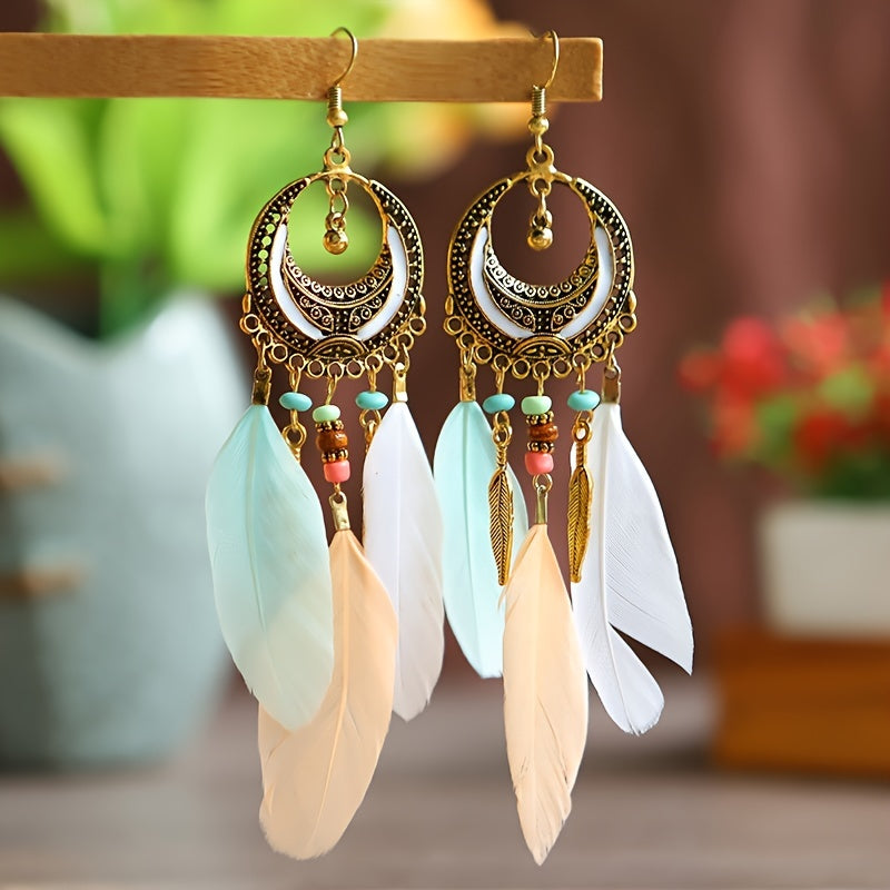 Add a touch of bohemian flair to your outfit with these crescent shaped feather tassel earrings. Perfect for adding a unique and trendy vibe to your look.