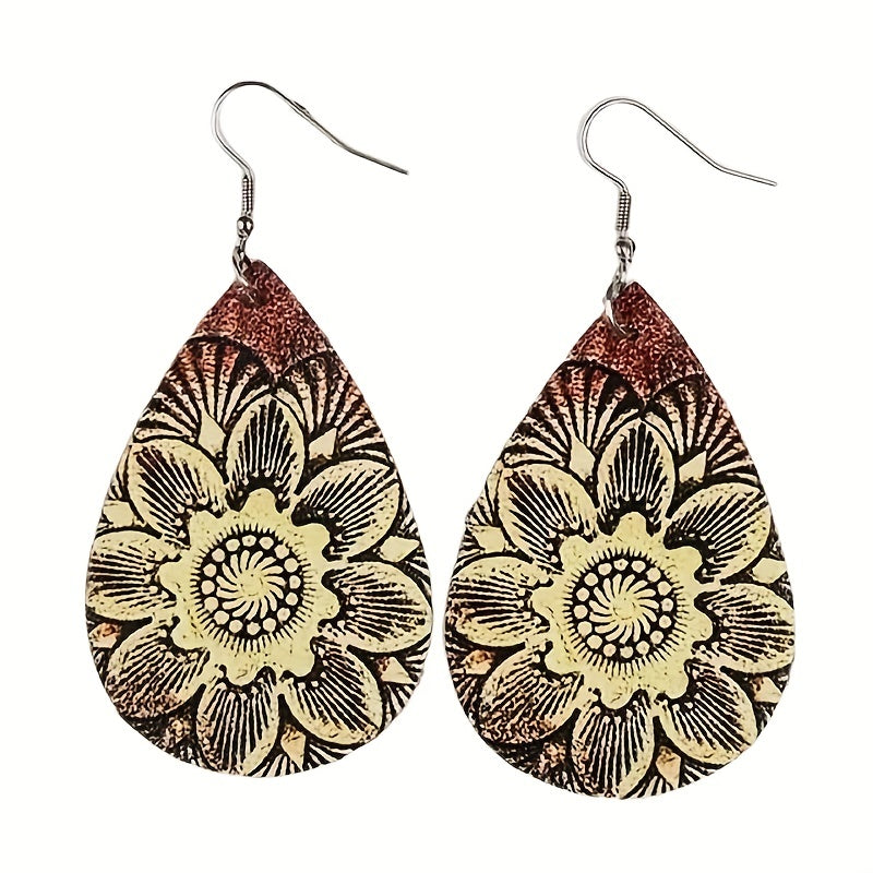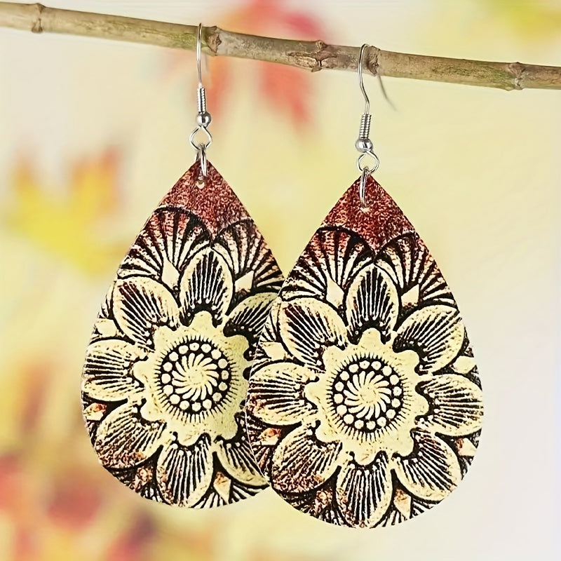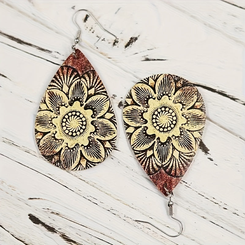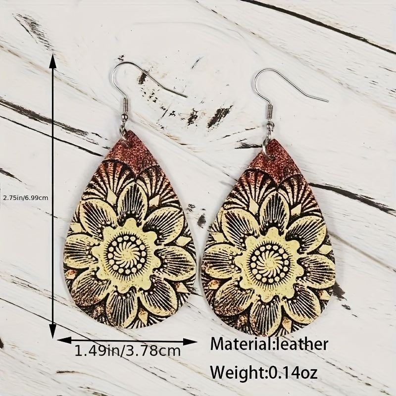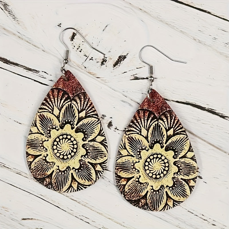 Add a touch of vintage boho style with these floral pattern PU leather earrings designed for men. The teardrop shape and hook dangle create a unique look for everyday wear or special occasions.