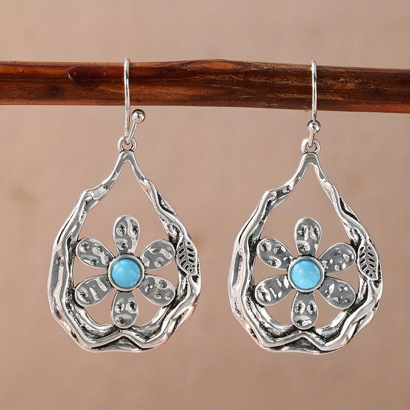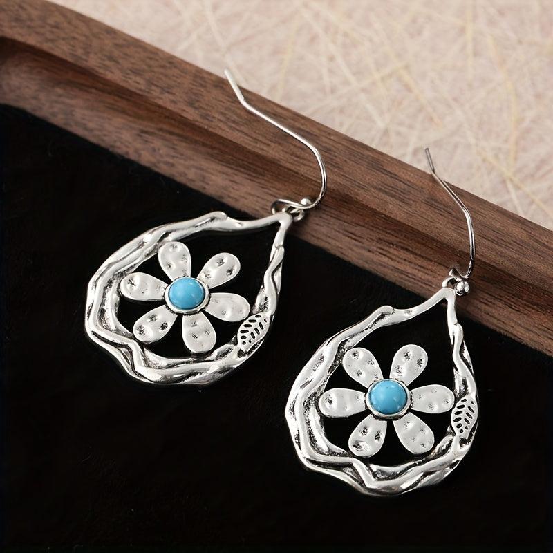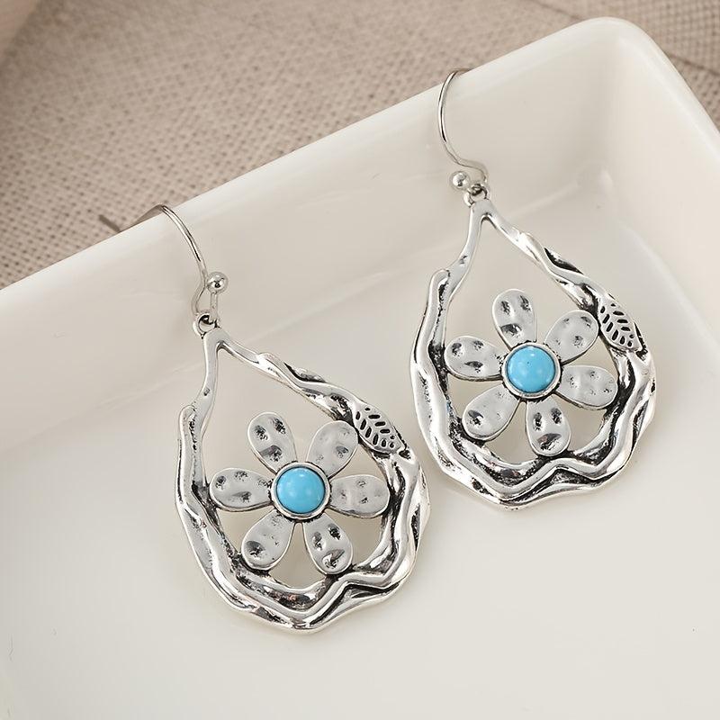 These handcrafted earrings feature a retro synthetic opal gemstone in a nature-inspired floral design. The silver tone copper construction is perfect for casual attire or special occasions.
