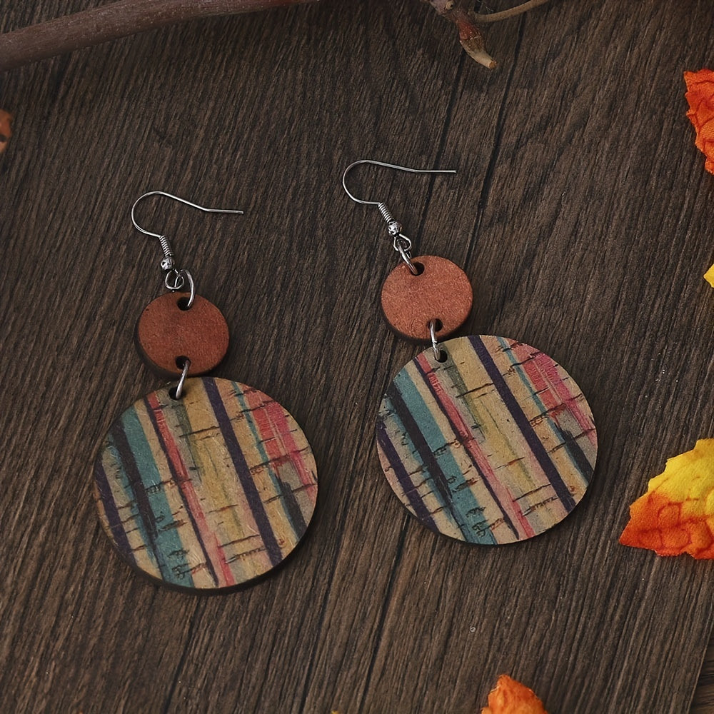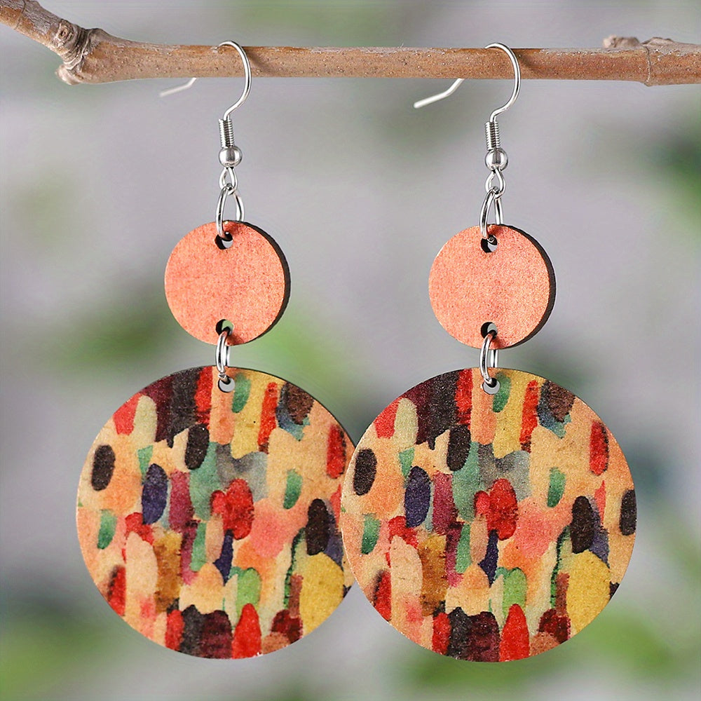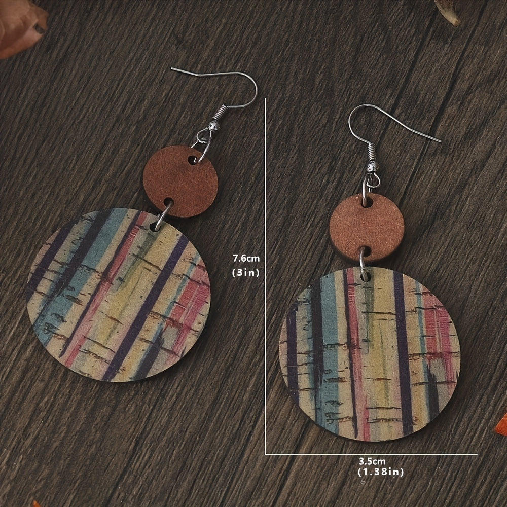 Add a touch of bohemian flair to your outfit with these colorful wooden dangle earrings featuring a geometric art pattern design.