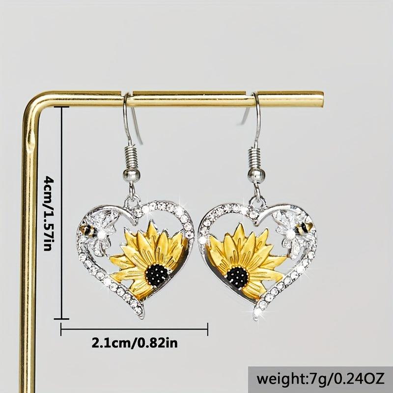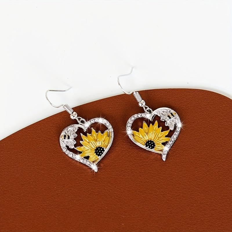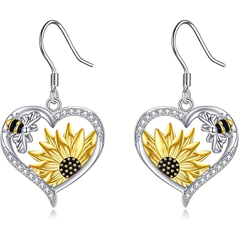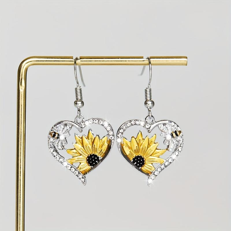 Vintage heart-shaped earrings with sunflower and bee design, crafted from alloy and synthetic zirconia. Perfect for women to wear at parties and all seasons.
