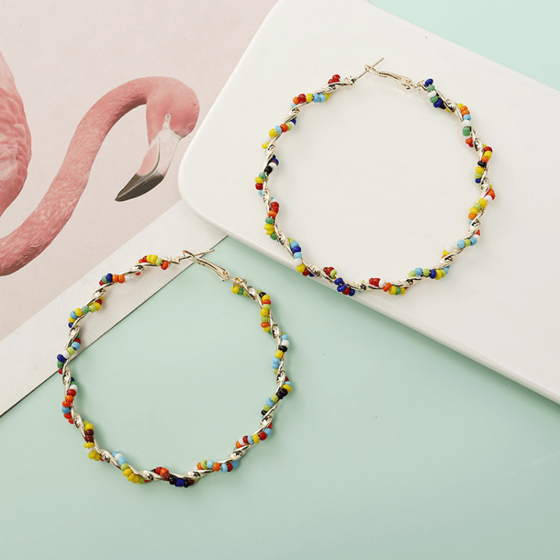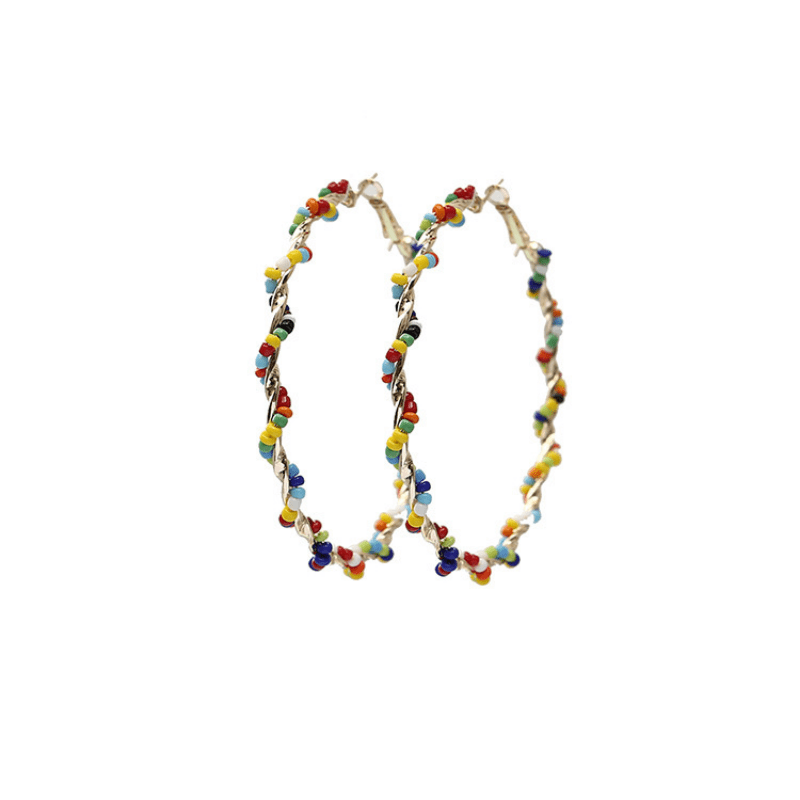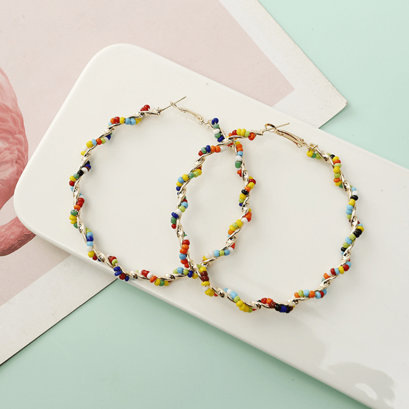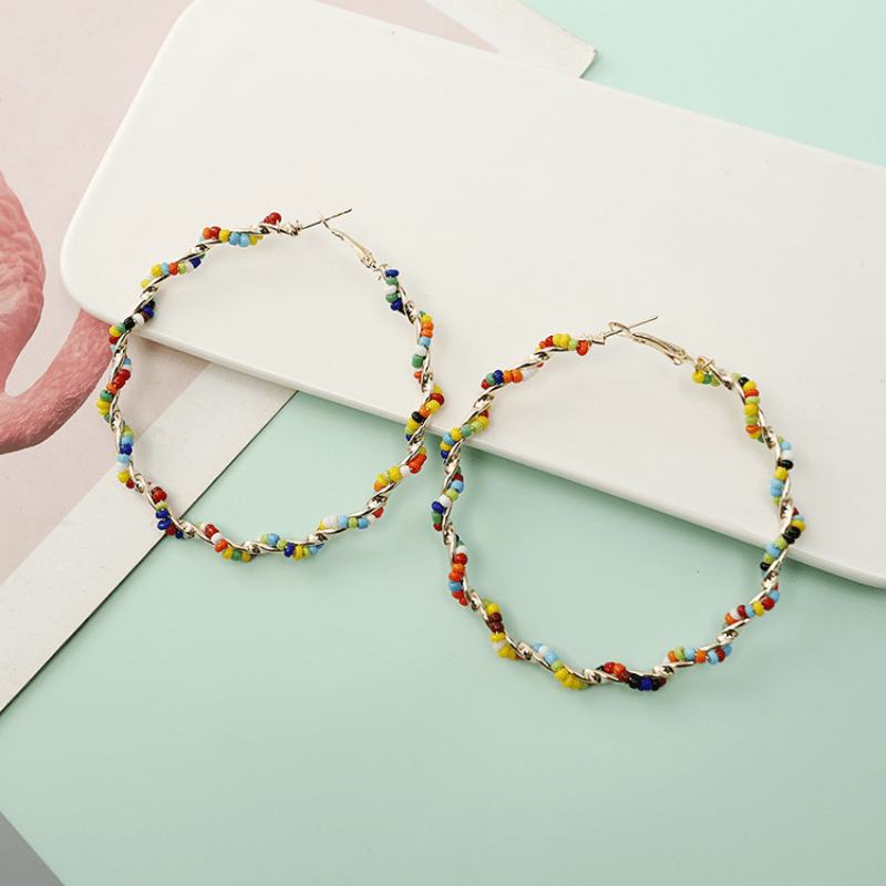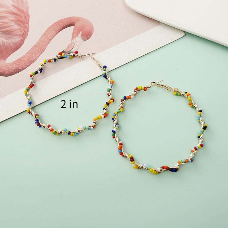 Add a touch of Bohemian charm with these large hoop earrings featuring multicolor rice beads. Perfect accessory for beach or casual wear. Ideal gift for ladies.