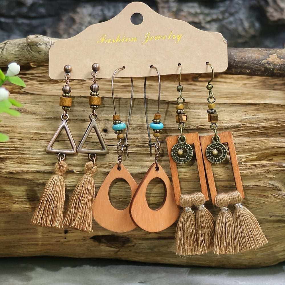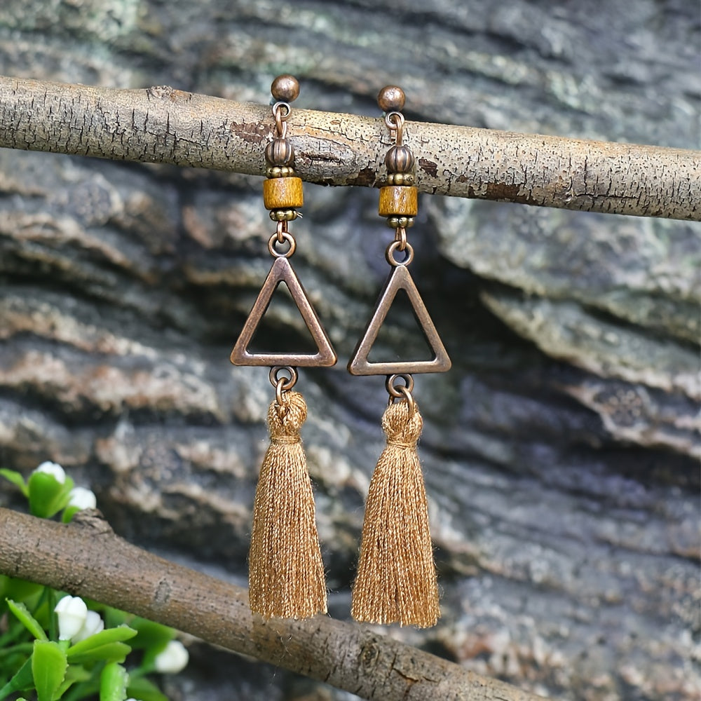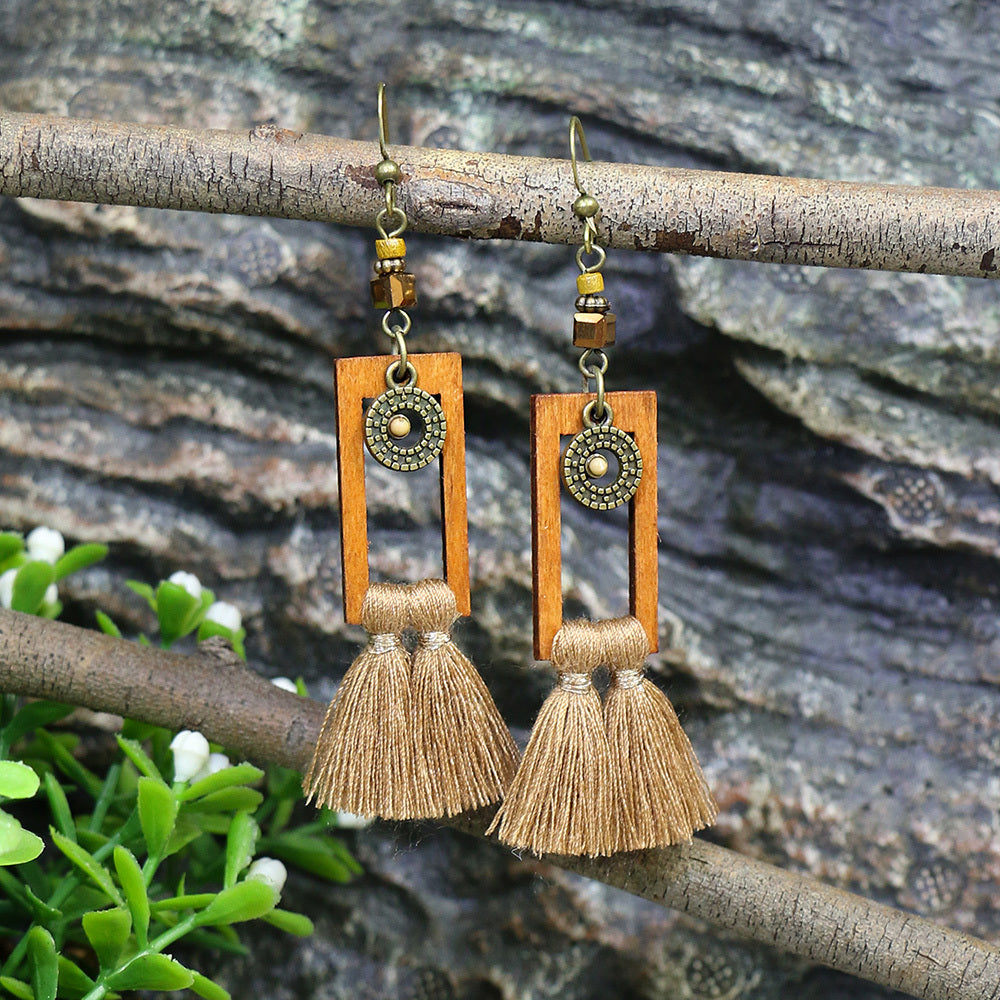 Elevate your boho look with these stylish multicolor triangle tassel pendant ear pins. Features a single pair of drop pendant large ear hook with a wooden rectangular brown tassel pendant for a chic addition to any women's ear.