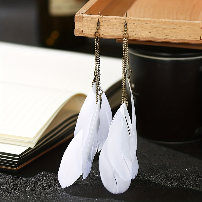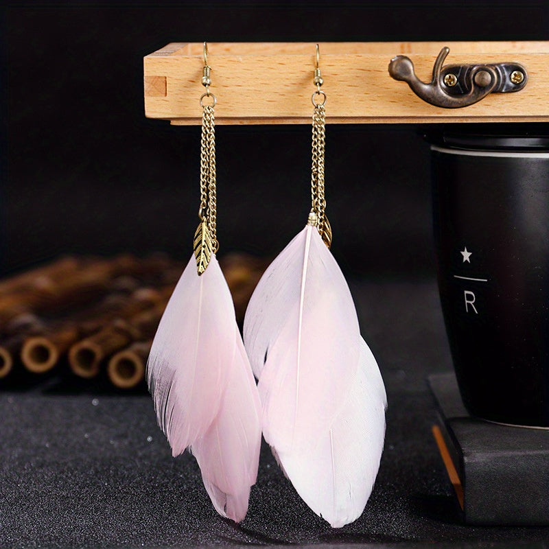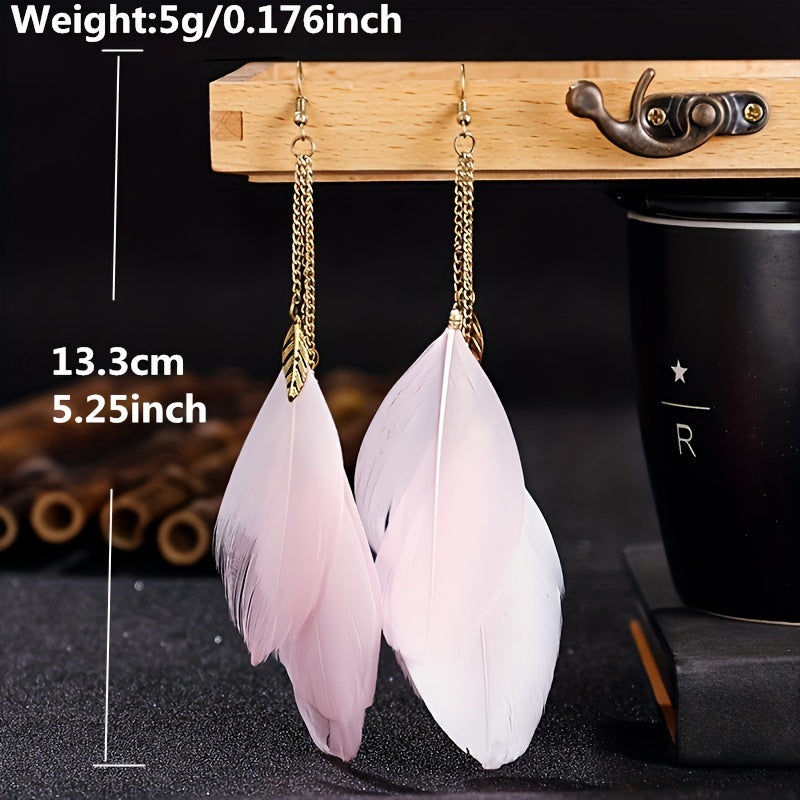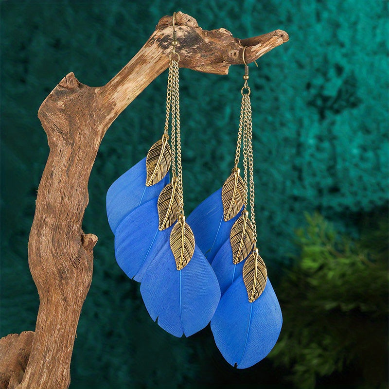 Elevate your look with these classic BOHO style long chain feather drop earrings. The tassel and leaf shape design adds a touch of elegance to your outfit.