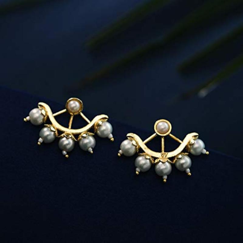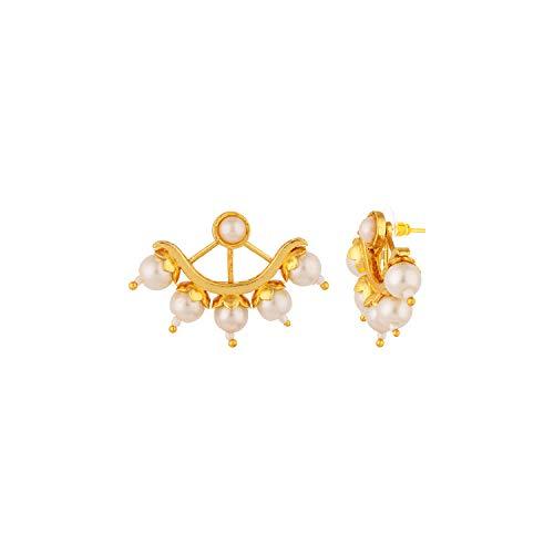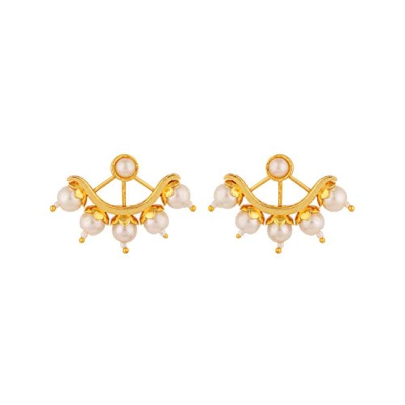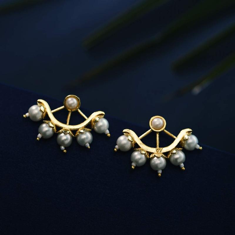 Elegant and stylish stud earrings made of brass with yellow plating and blooming pearl beads.