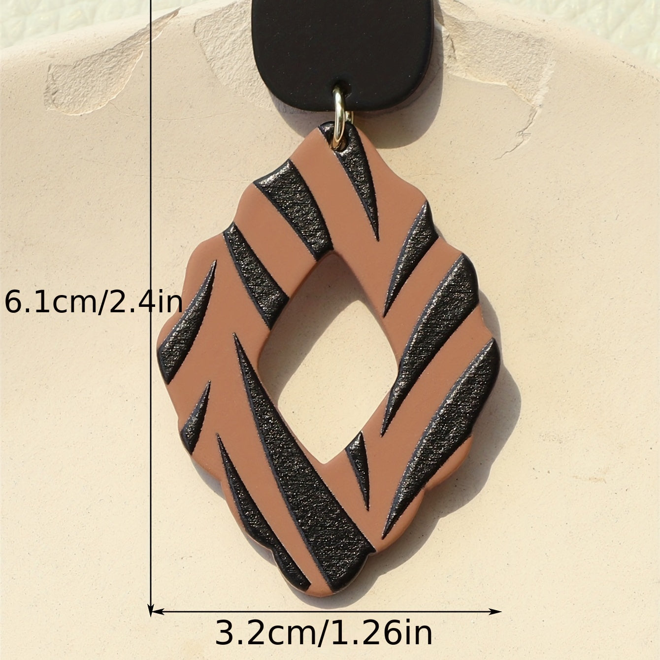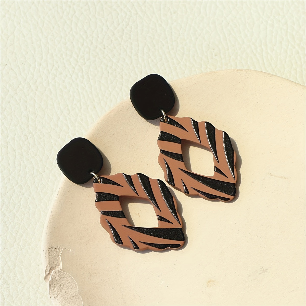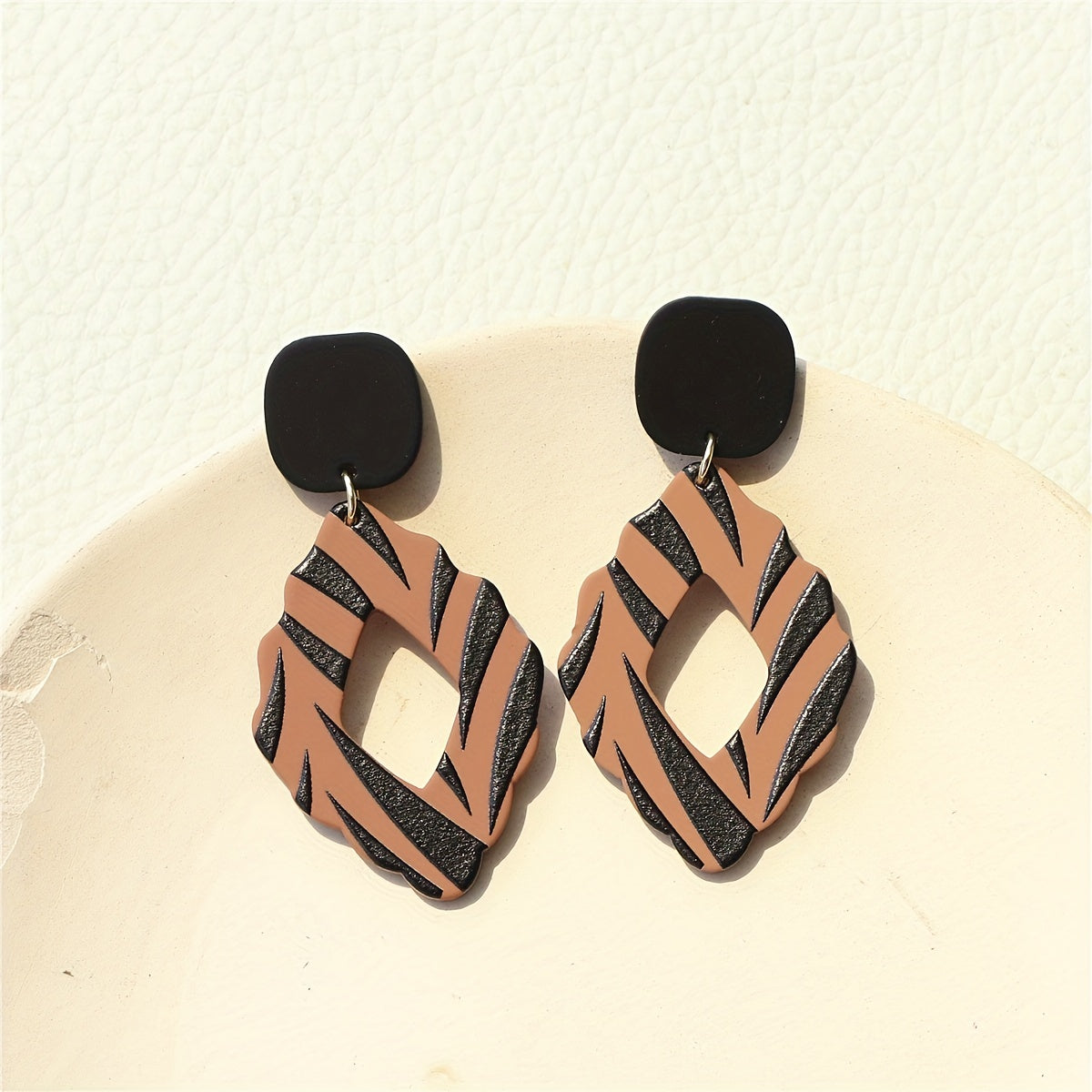 These boho style dangle earrings feature a stripes pattern in brown rhombus shape. Made of acrylic, these earrings are perfect for adding a touch of unique style to any outfit. Ideal as a gift for a fashionable woman.