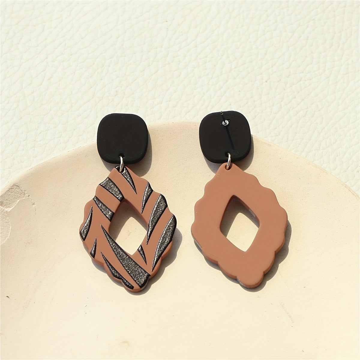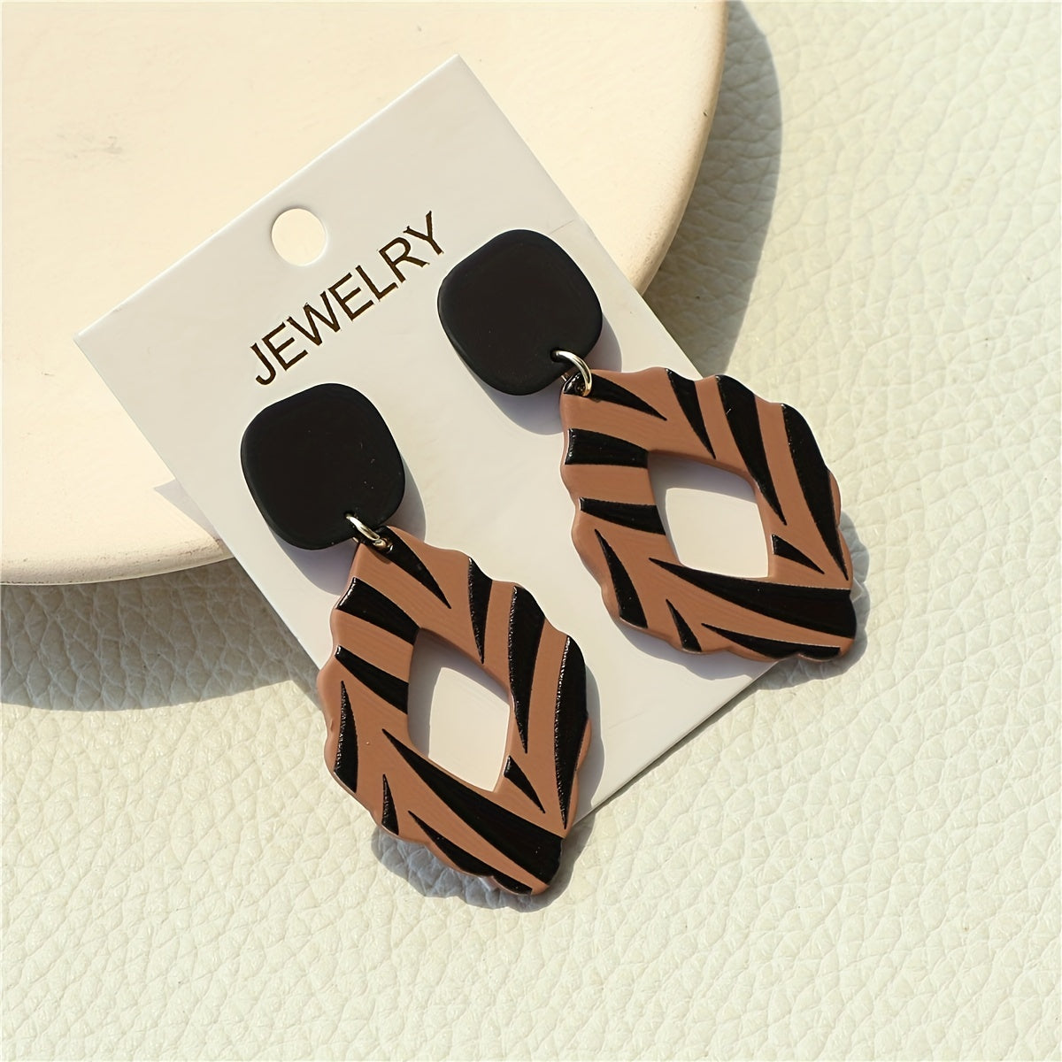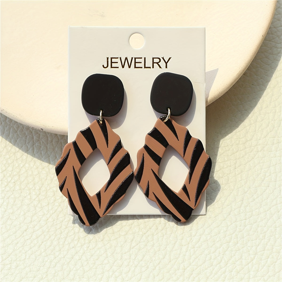 These boho style dangle earrings feature a stripes pattern in brown rhombus shape. Made of acrylic, these earrings are perfect for adding a touch of unique style to any outfit. Ideal as a gift for a fashionable woman.