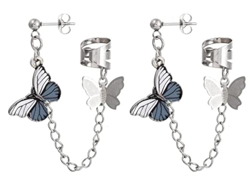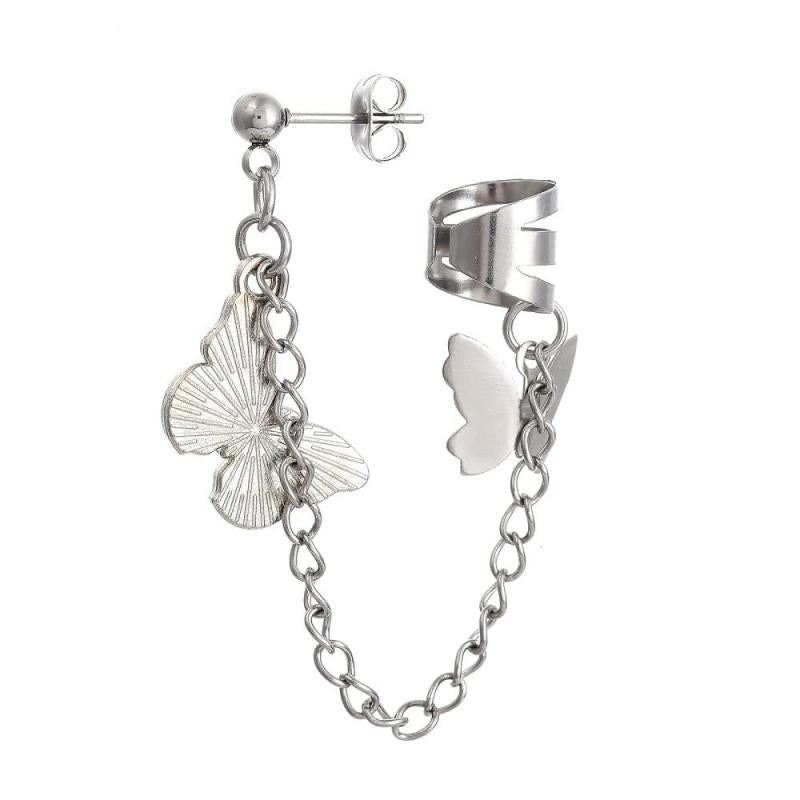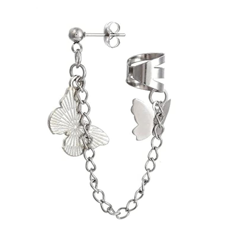 Add a touch of style with these trendy hanging butterfly earrings that come with a chain stud and ear cuff design. Perfect for everyday wear or special occasions.
